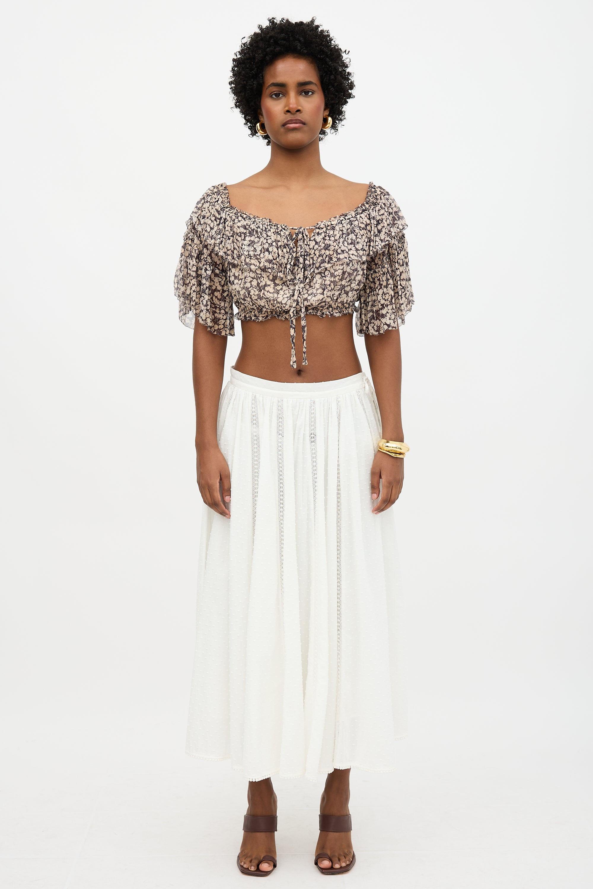 Pre-owned Zimmermann beige and black cropped blouse featuring abstract print, front keyhole with tie closure, ruffle trim, elasticized hem, and frill sleeves. Lined.