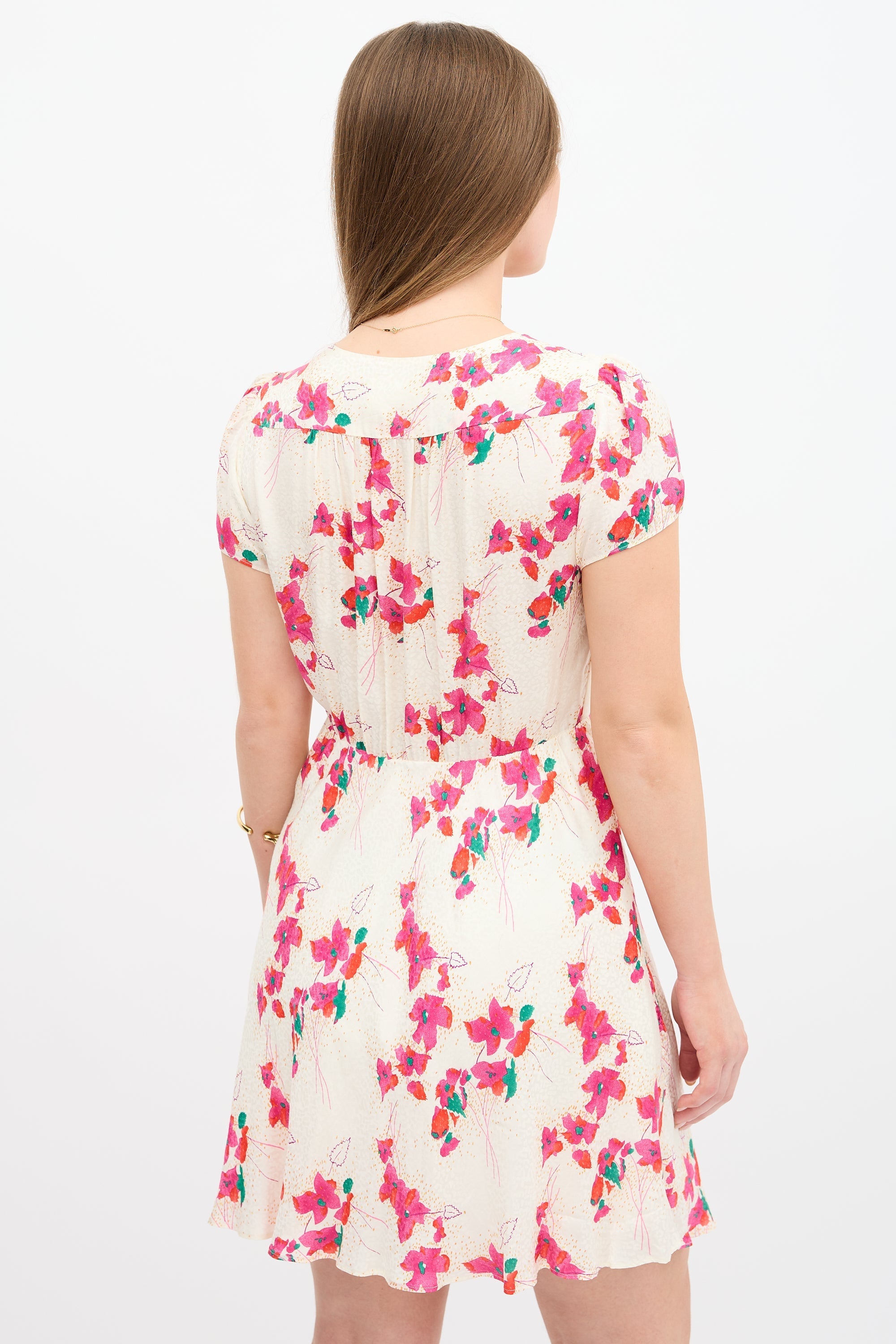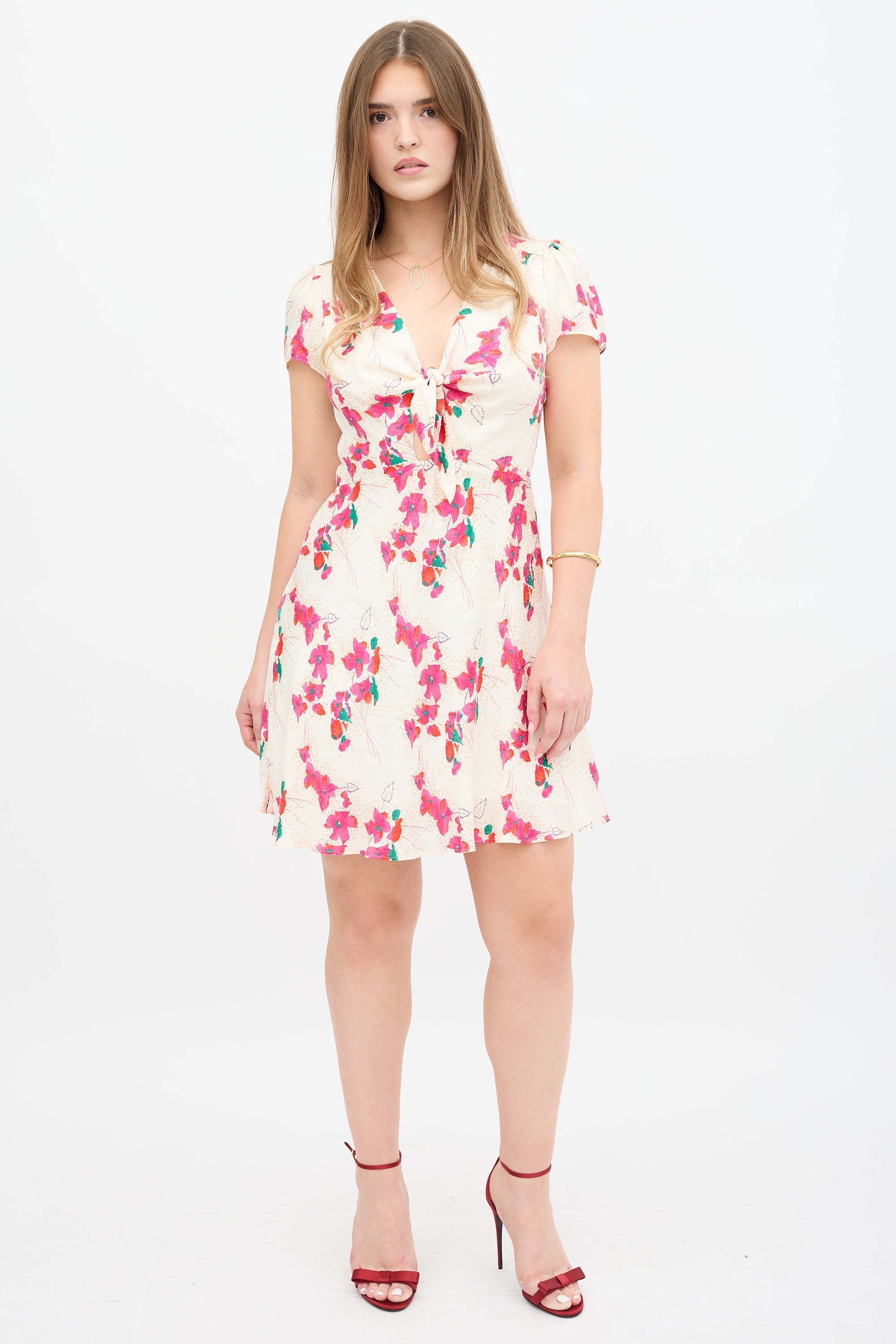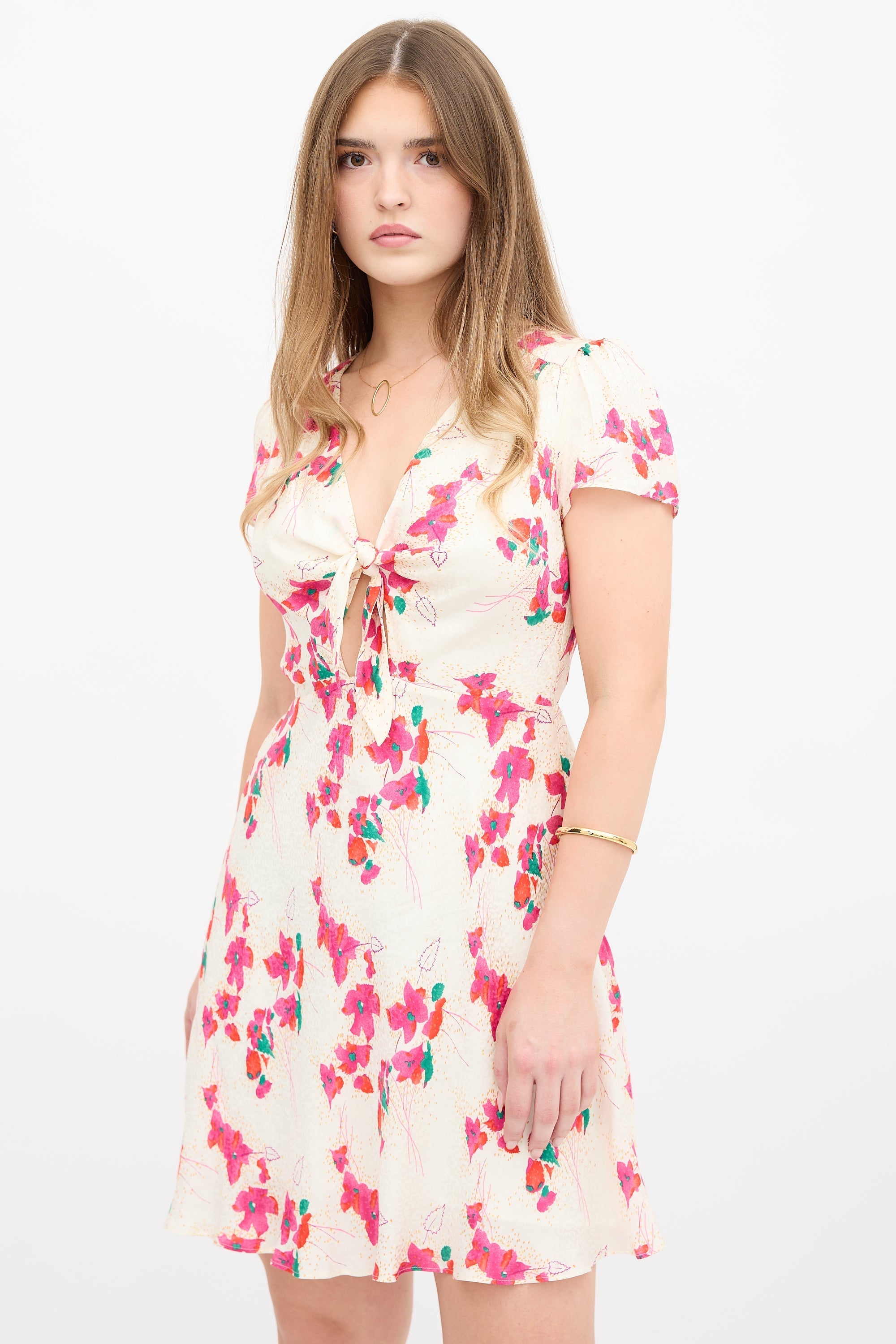 Pre-owned Ba&sh cream satin Elita dress featuring a tonal jacquard leopard print, red and pink floral pattern, V-neckline, cap sleeves, side zip closure, self-tie bust with cutout detail, and a flutter hem. Partially Lined.