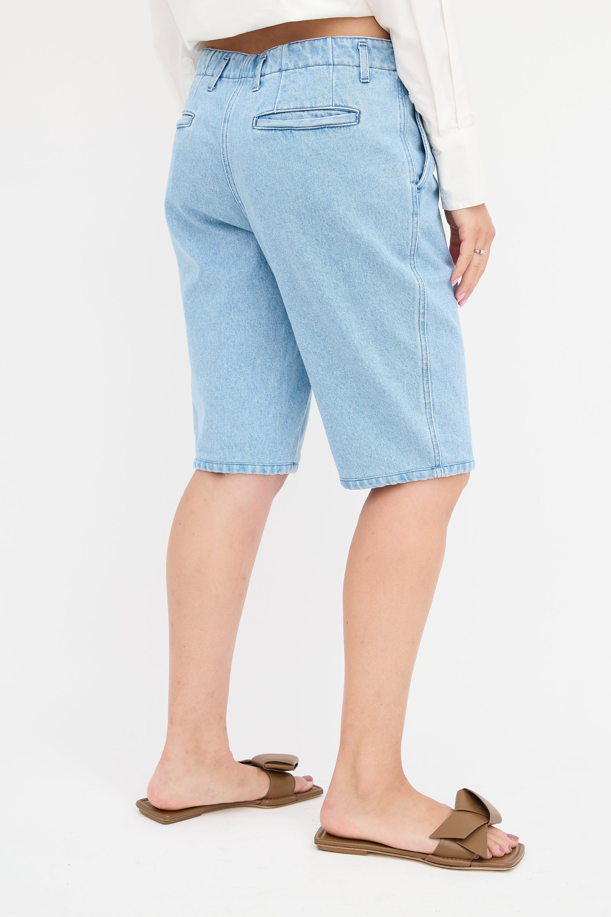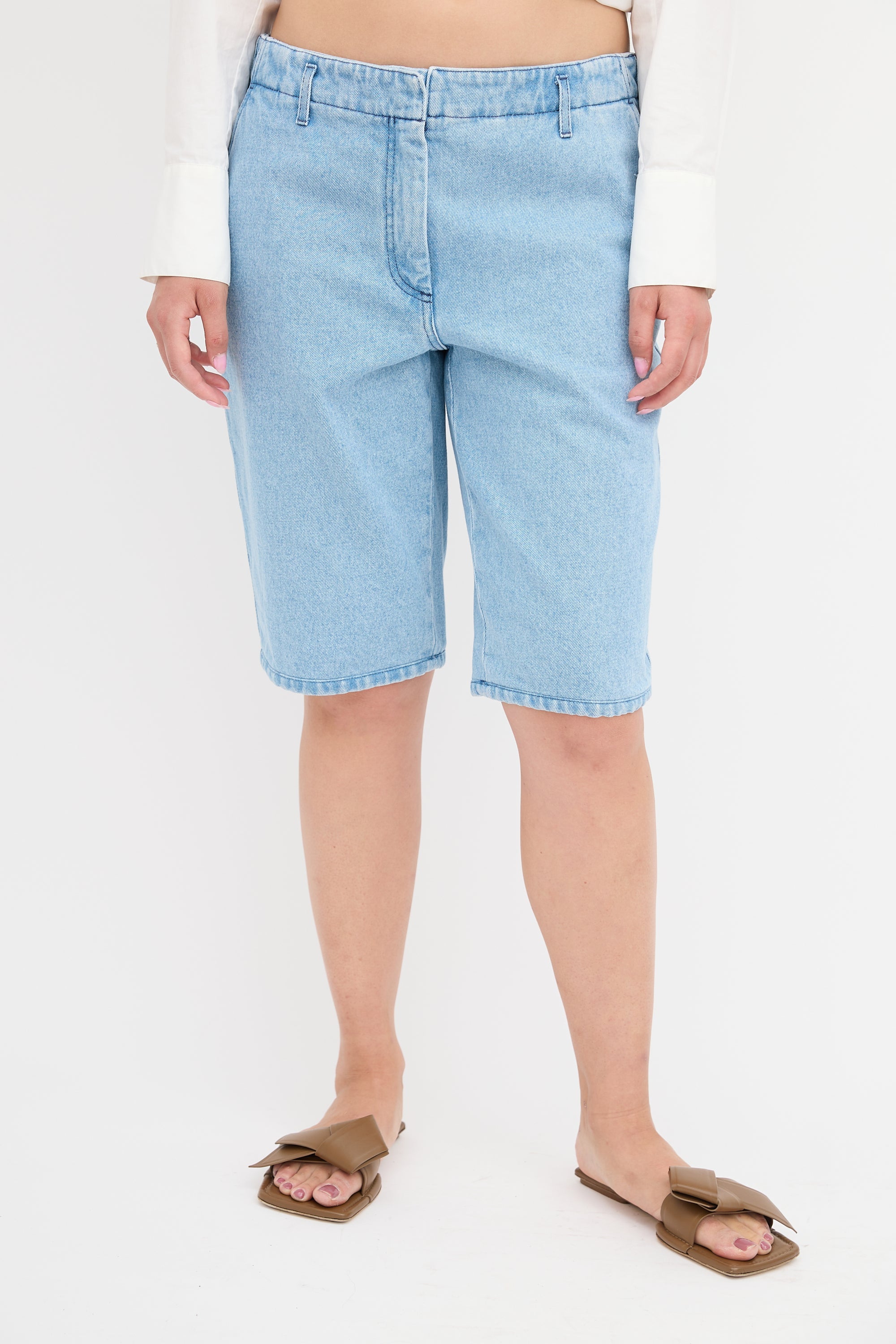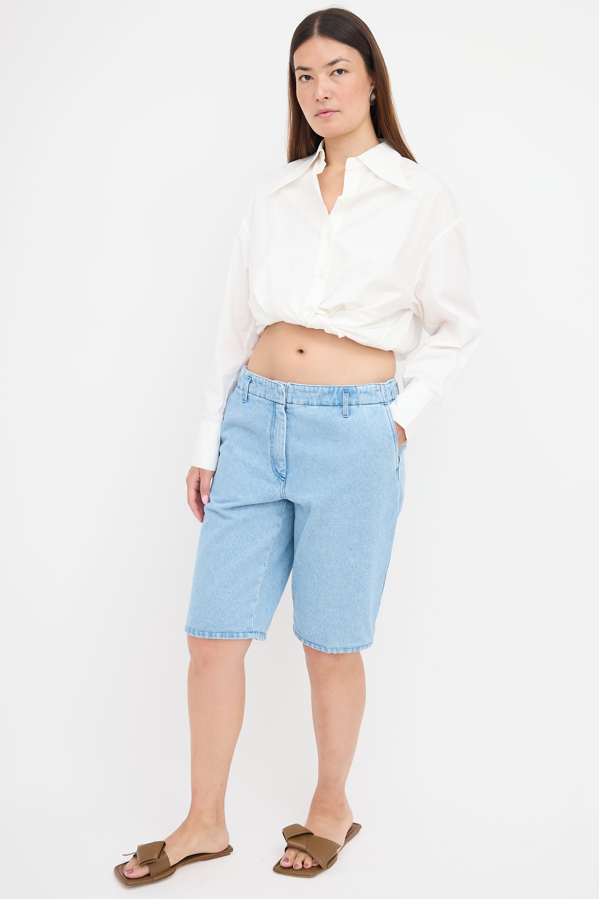 Pre-owned Dries Van Noten light wash denim Bermuda shorts featuring straight leg, four pocket styling, and zip fly.