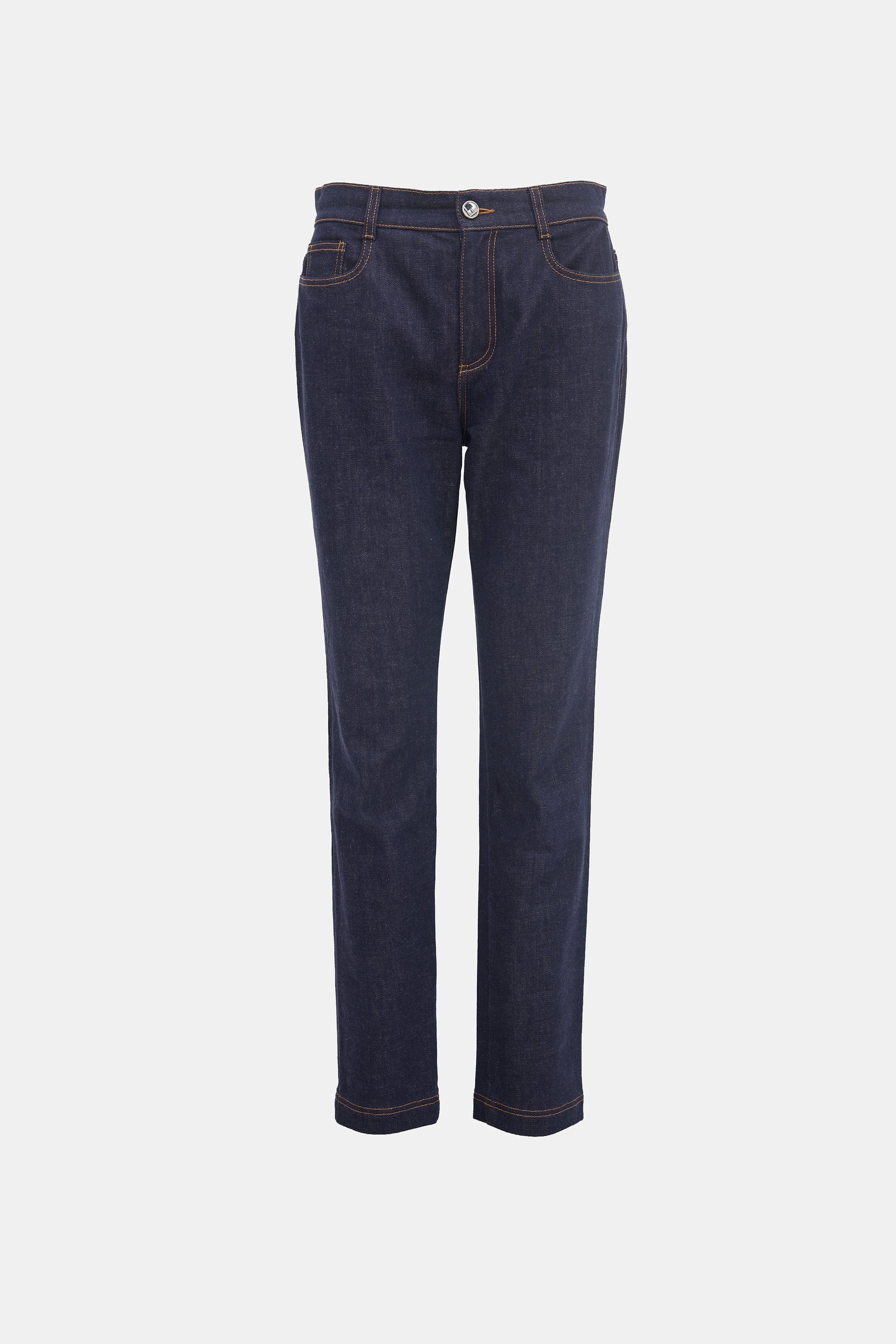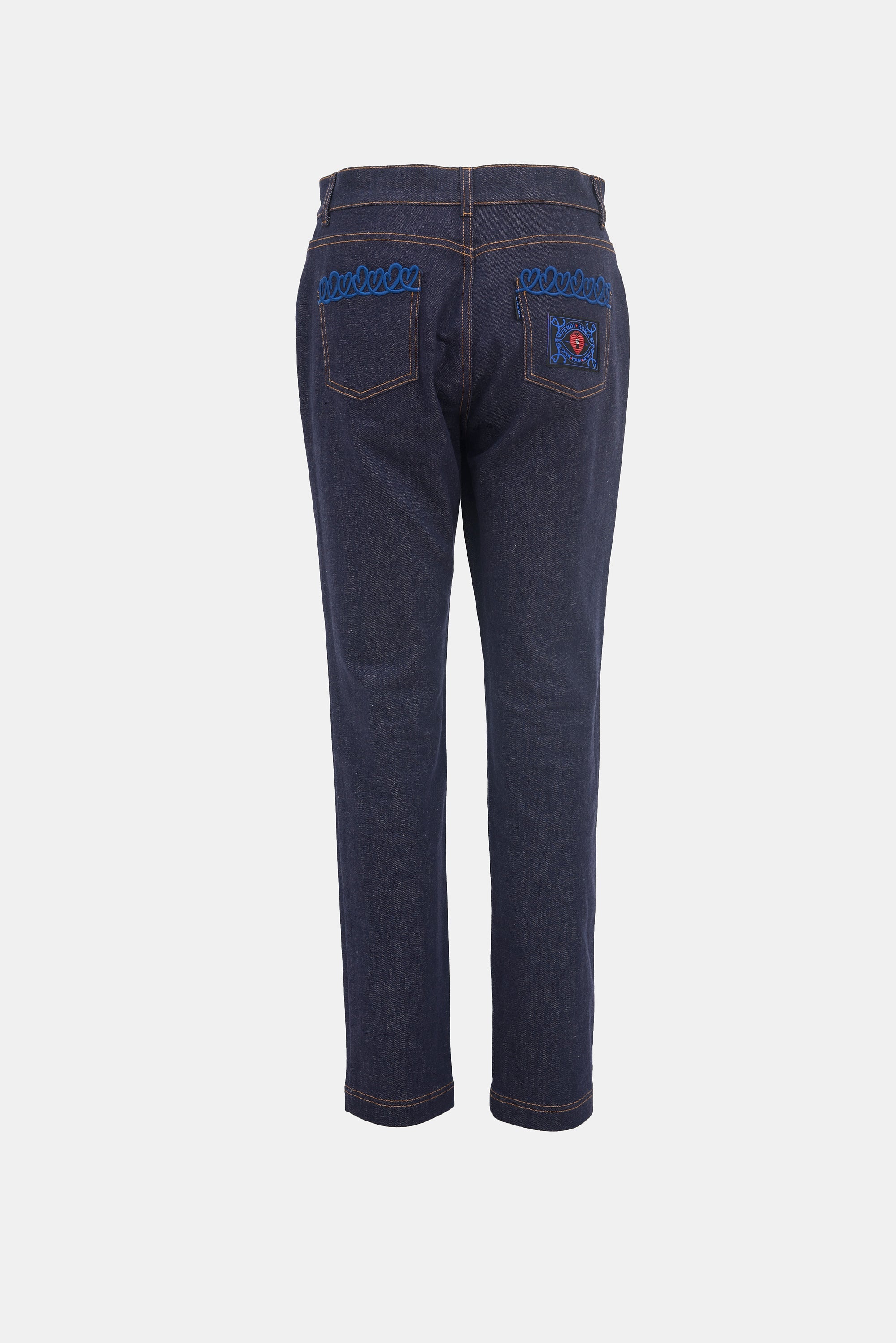 Pre-owned Fendi dark wash high rise jeans featuring a zip fly, belt loops, five pocket stylings with heart embroidery and logo patch at back, and a straight leg.