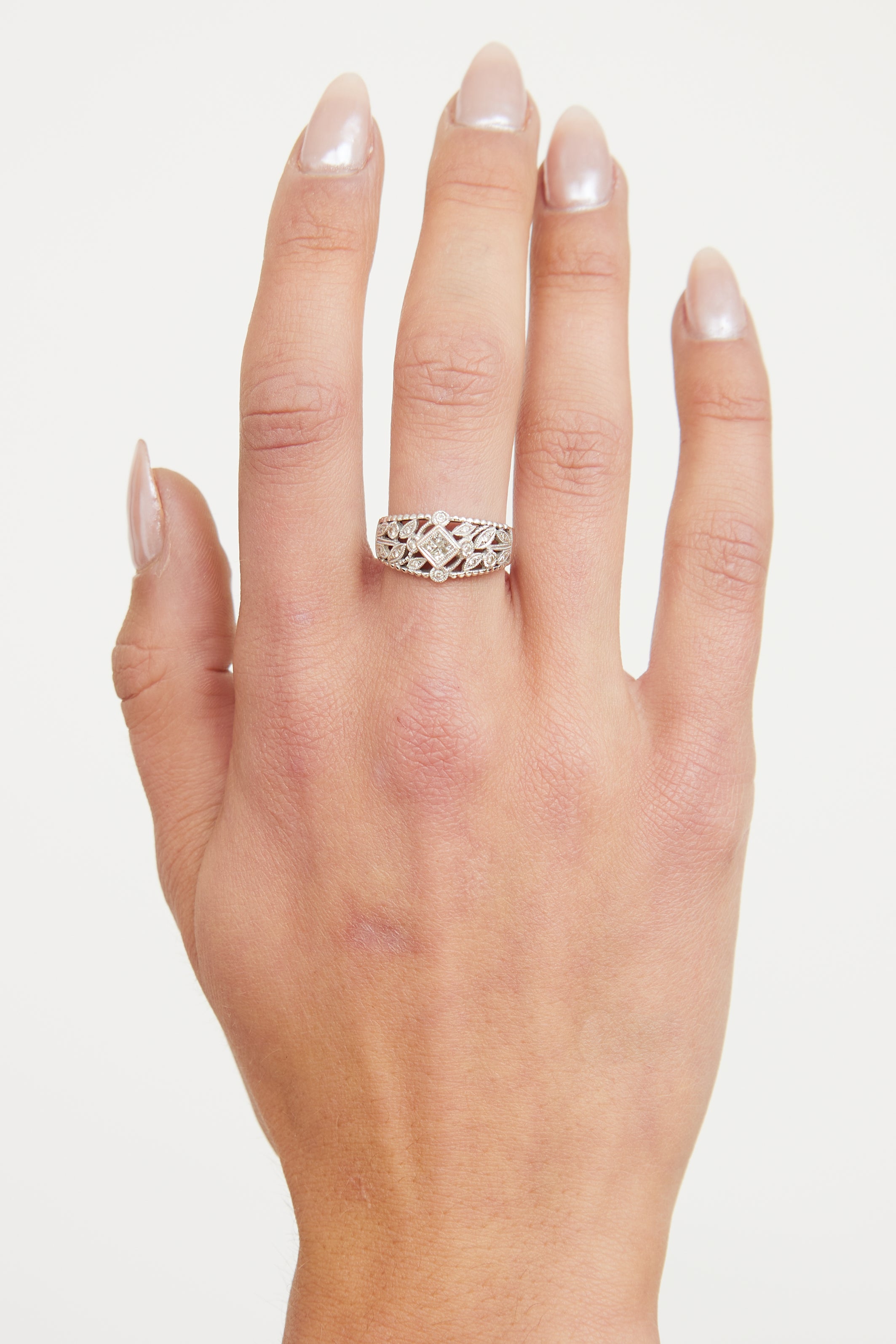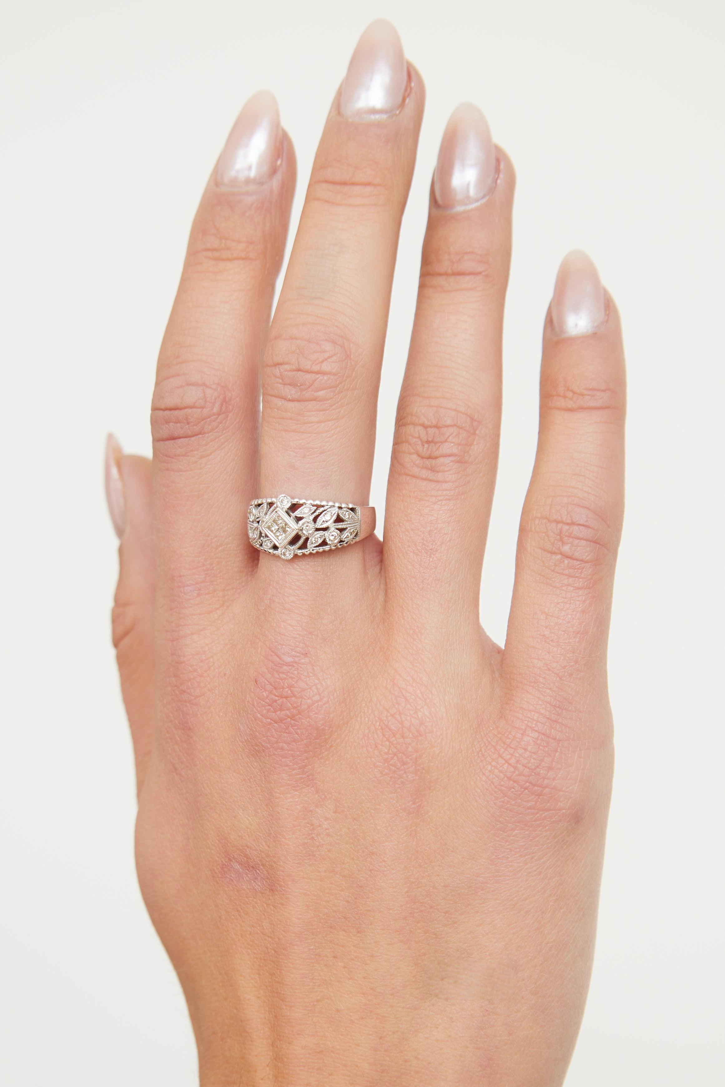 Pre-owned Fine Jewelry 18K white gold ring featuring open floral carved top with invisible set, bezel set and bead set princess and brilliant cut diamonds.