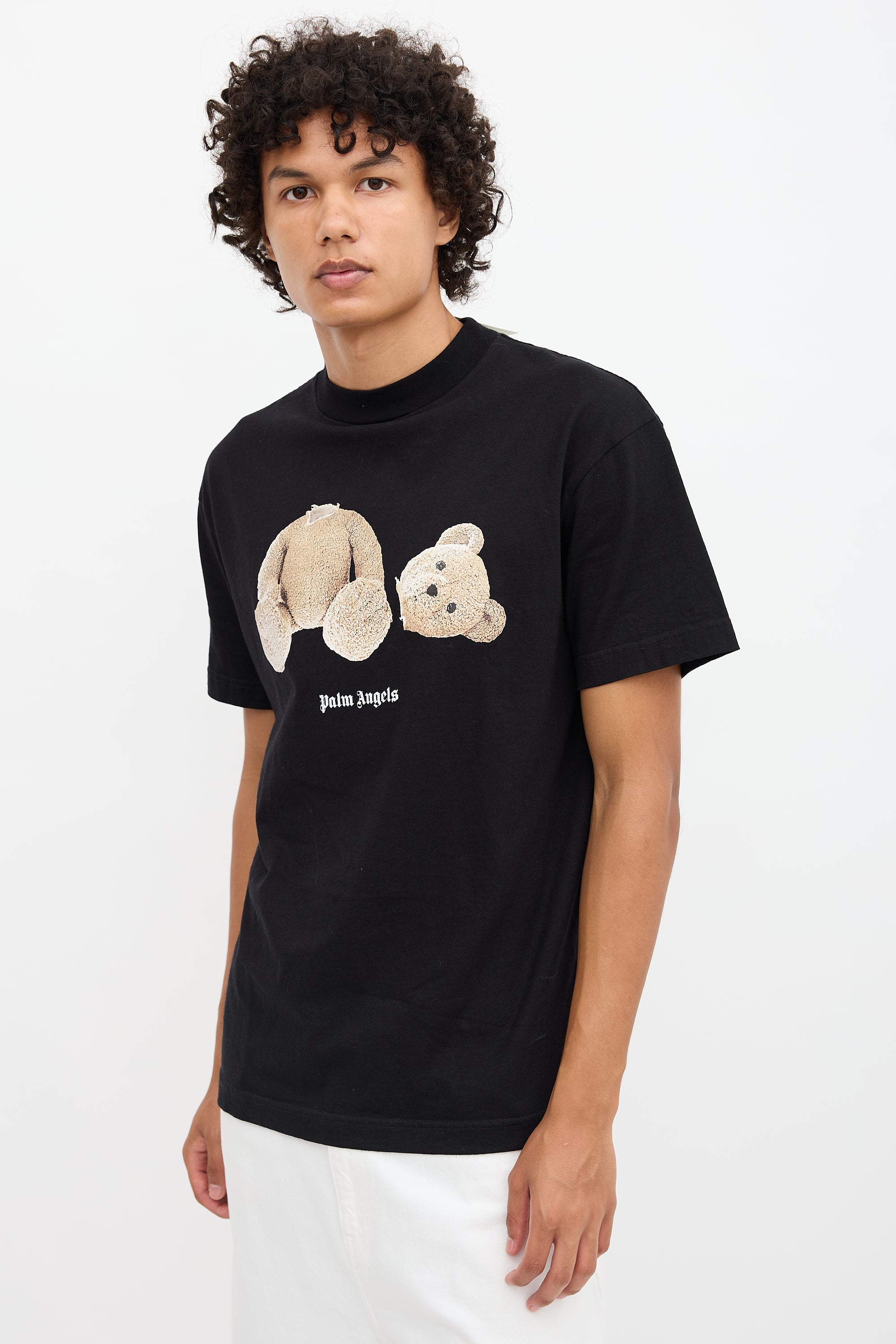 Pre-owned Palm Angels black T-shirt featuring crew neckline, beige teddy bear graphic at front, and white printed logos at front and back.