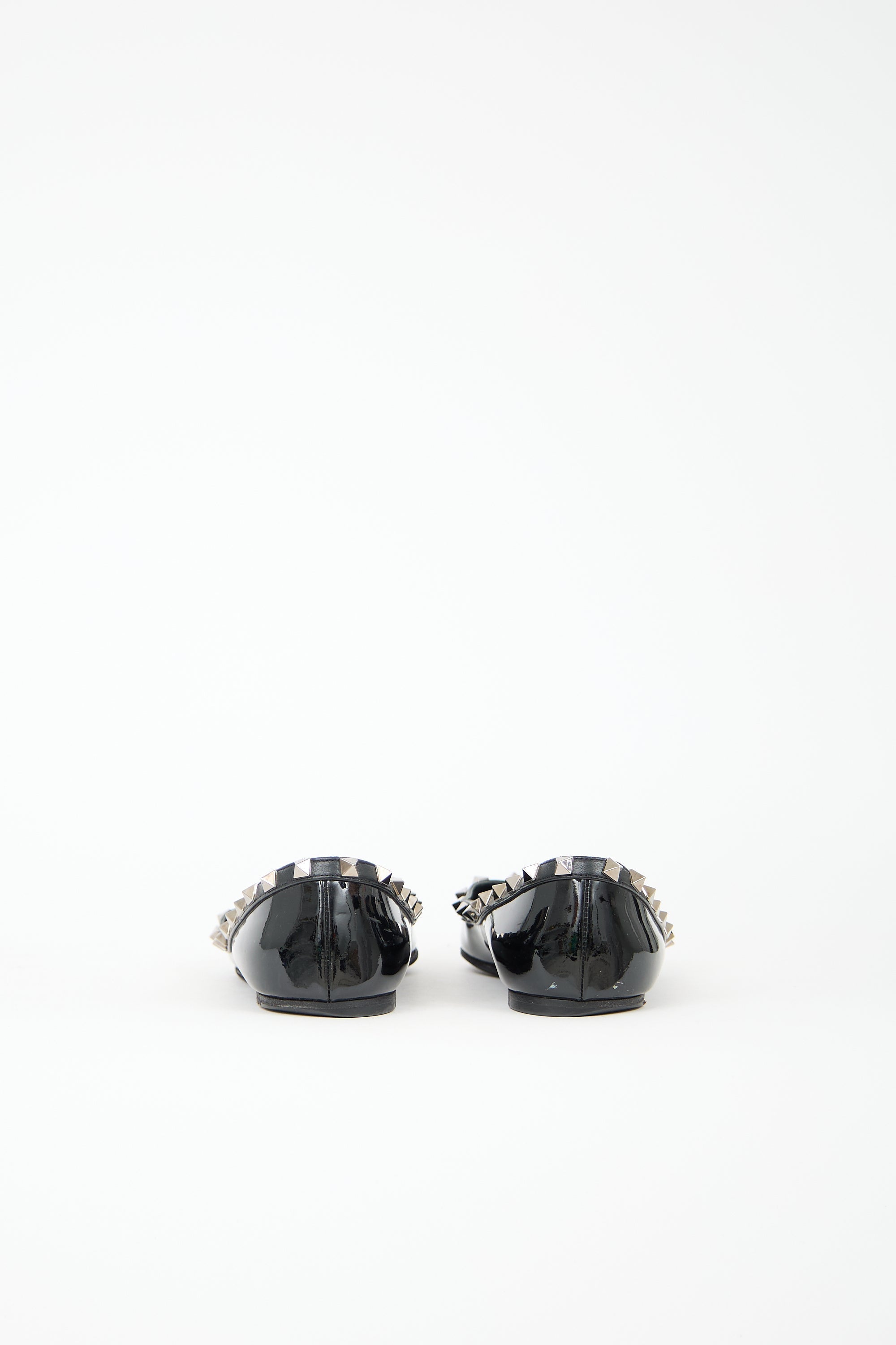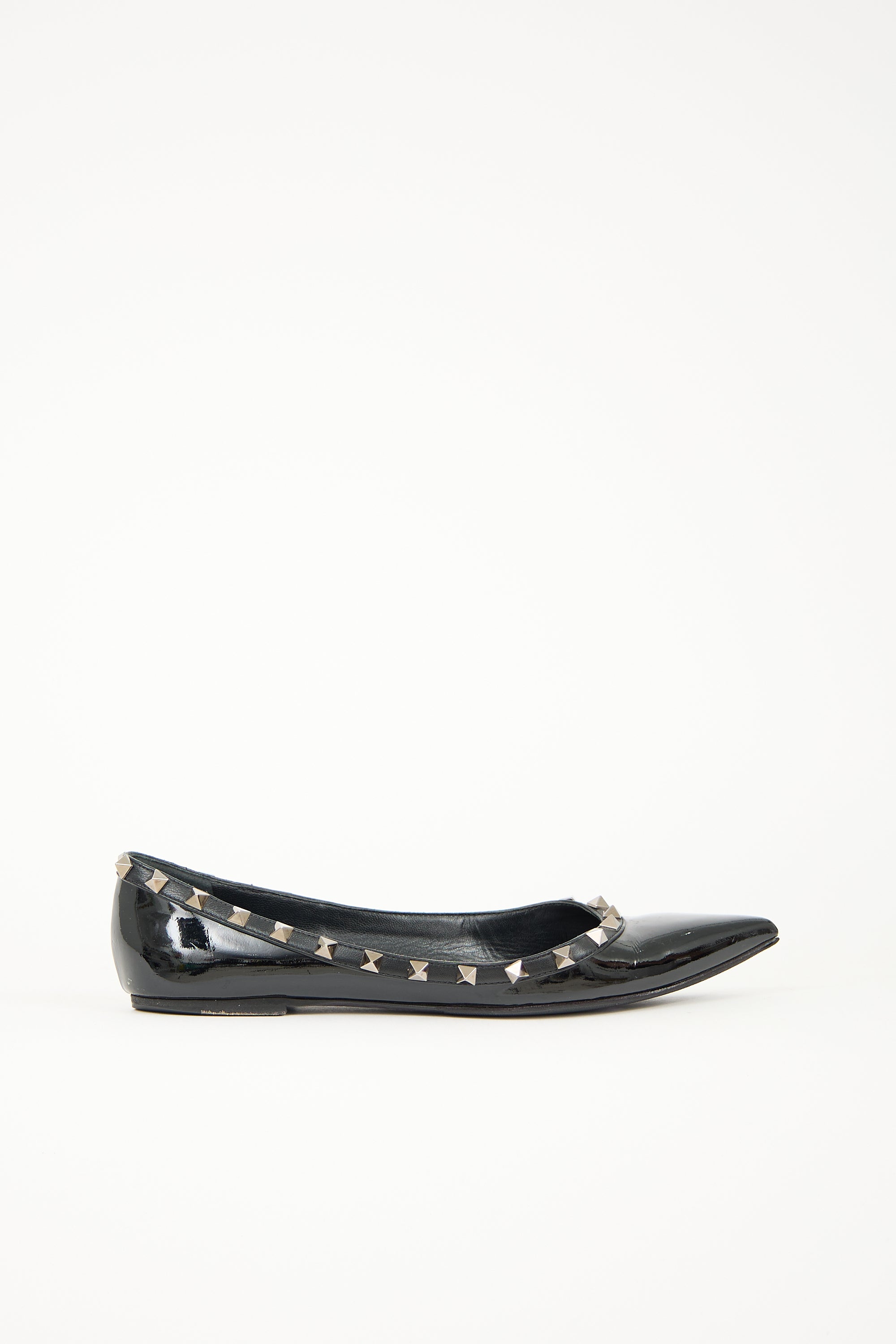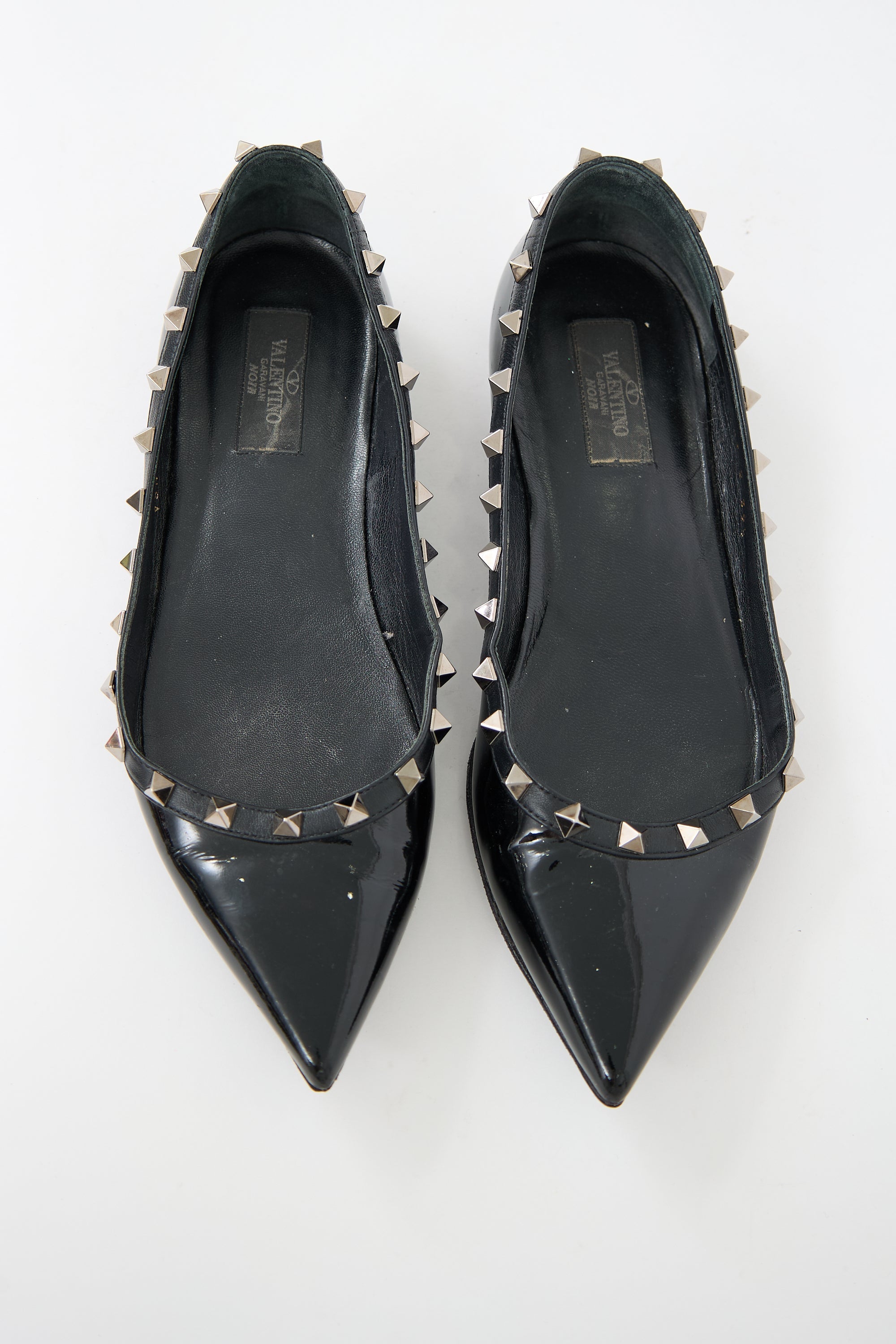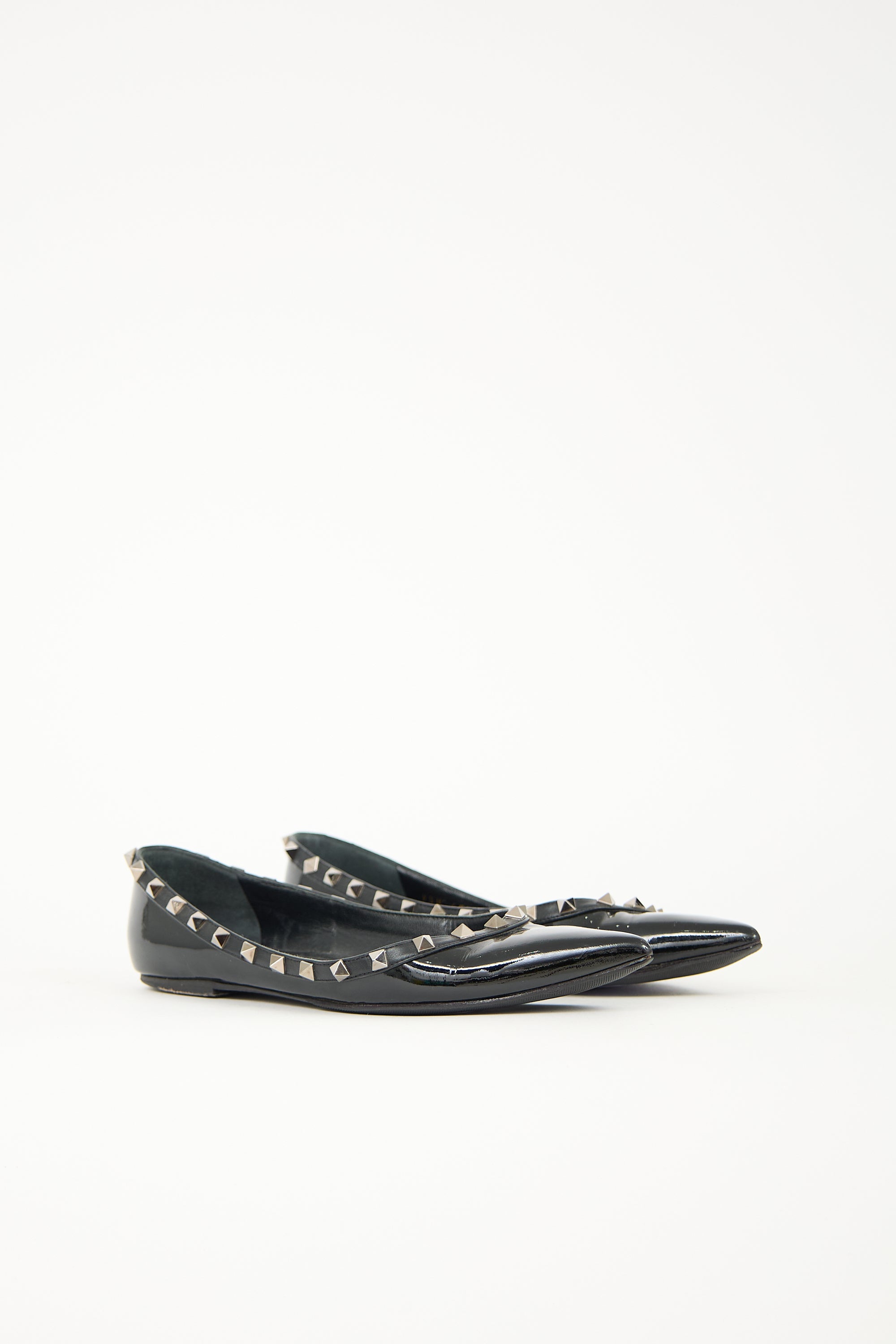 Pre-owned Valentino Noir black patent leather ballet flats featuring pointed toe and leather topline trim with signature Rockstud embellishment. Comes with original dust bag, care guide, and extra Rockstuds.