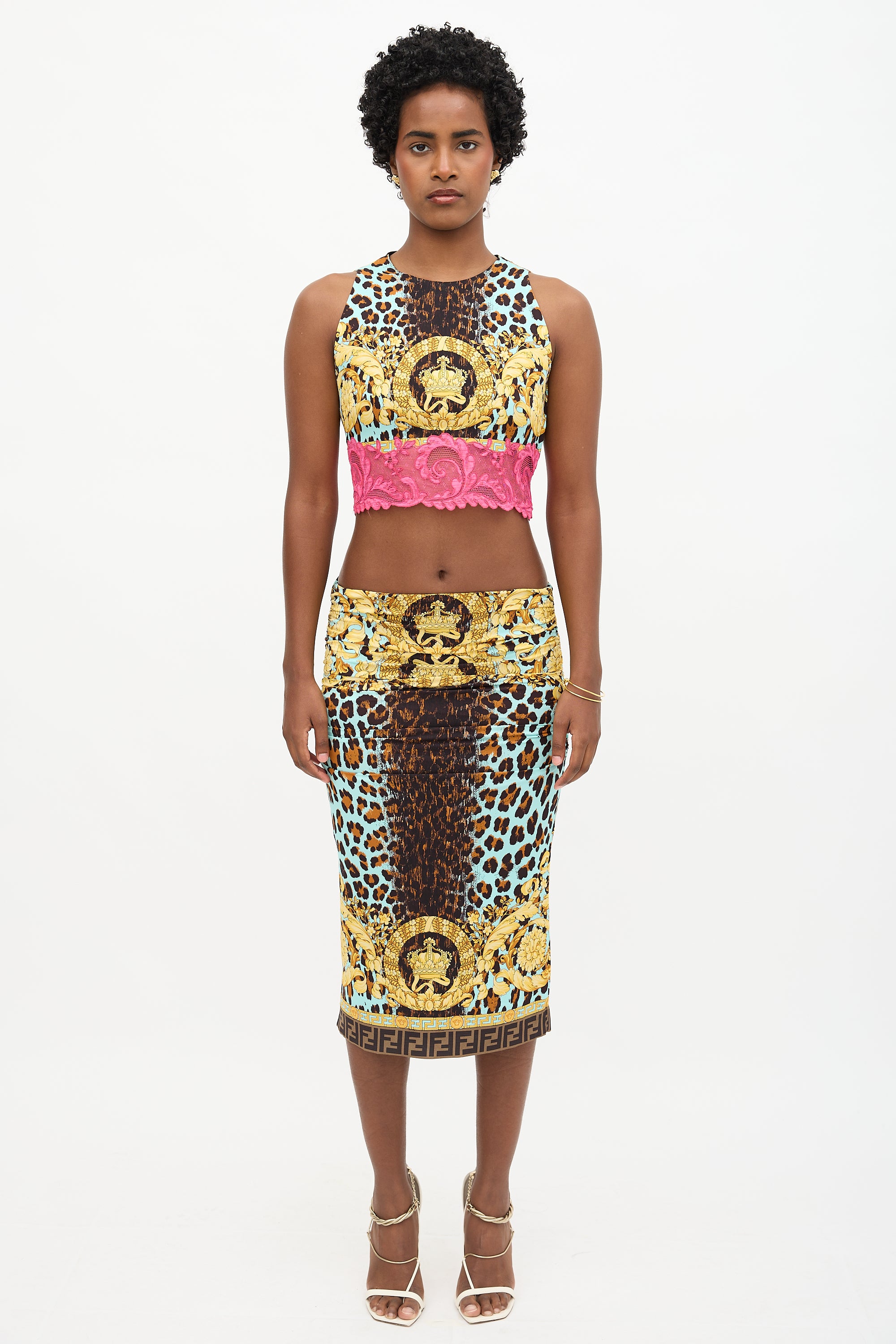 Pre-owned Versace X Fendi Fendace 2022 light blue, fuchsia, and multicolour silk blend crop top featuring Baroque print with leopard background, round neckline, back keyhole with top button fastening, lace hem, and concealed side zip. Lined. Clipped to fit model.
