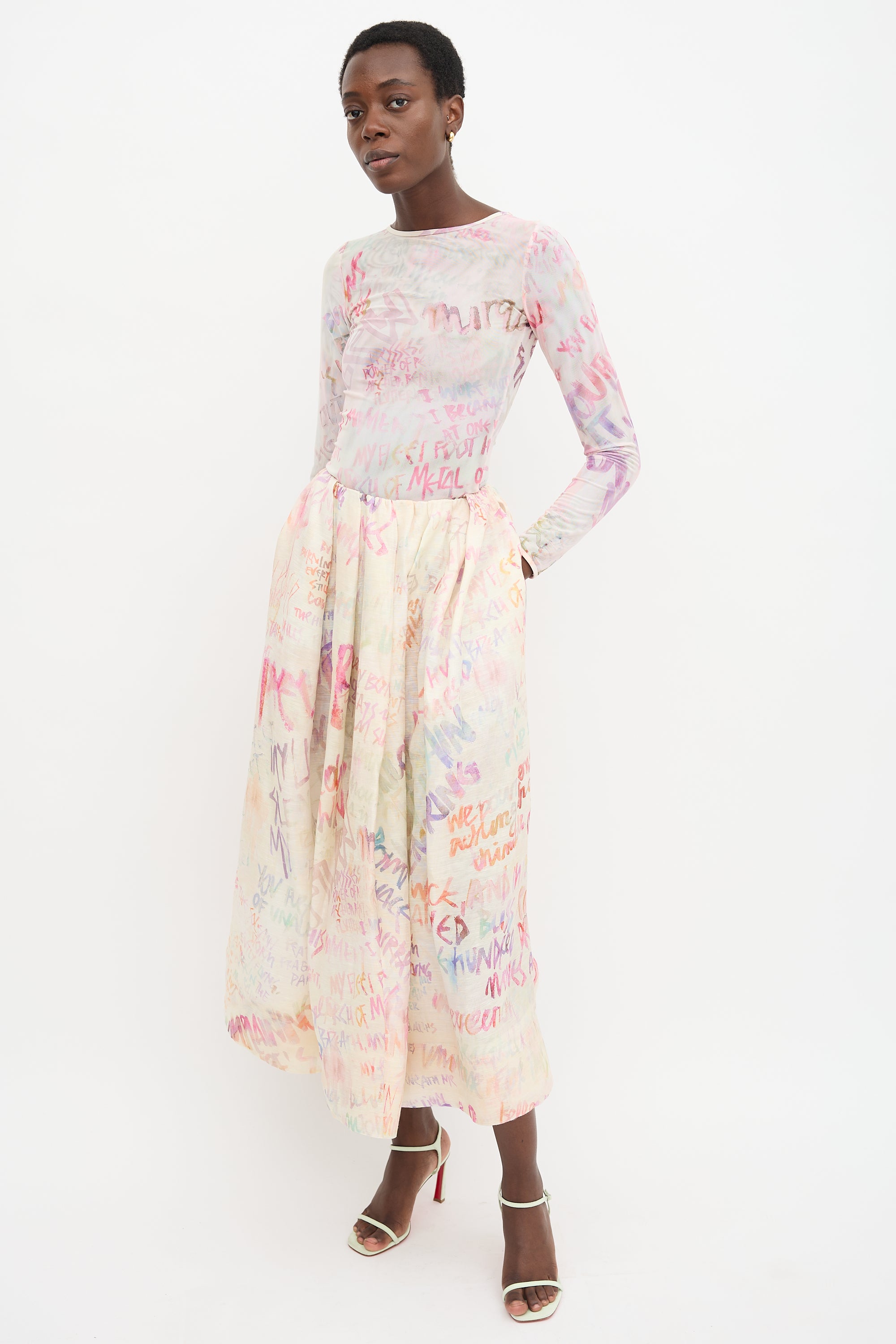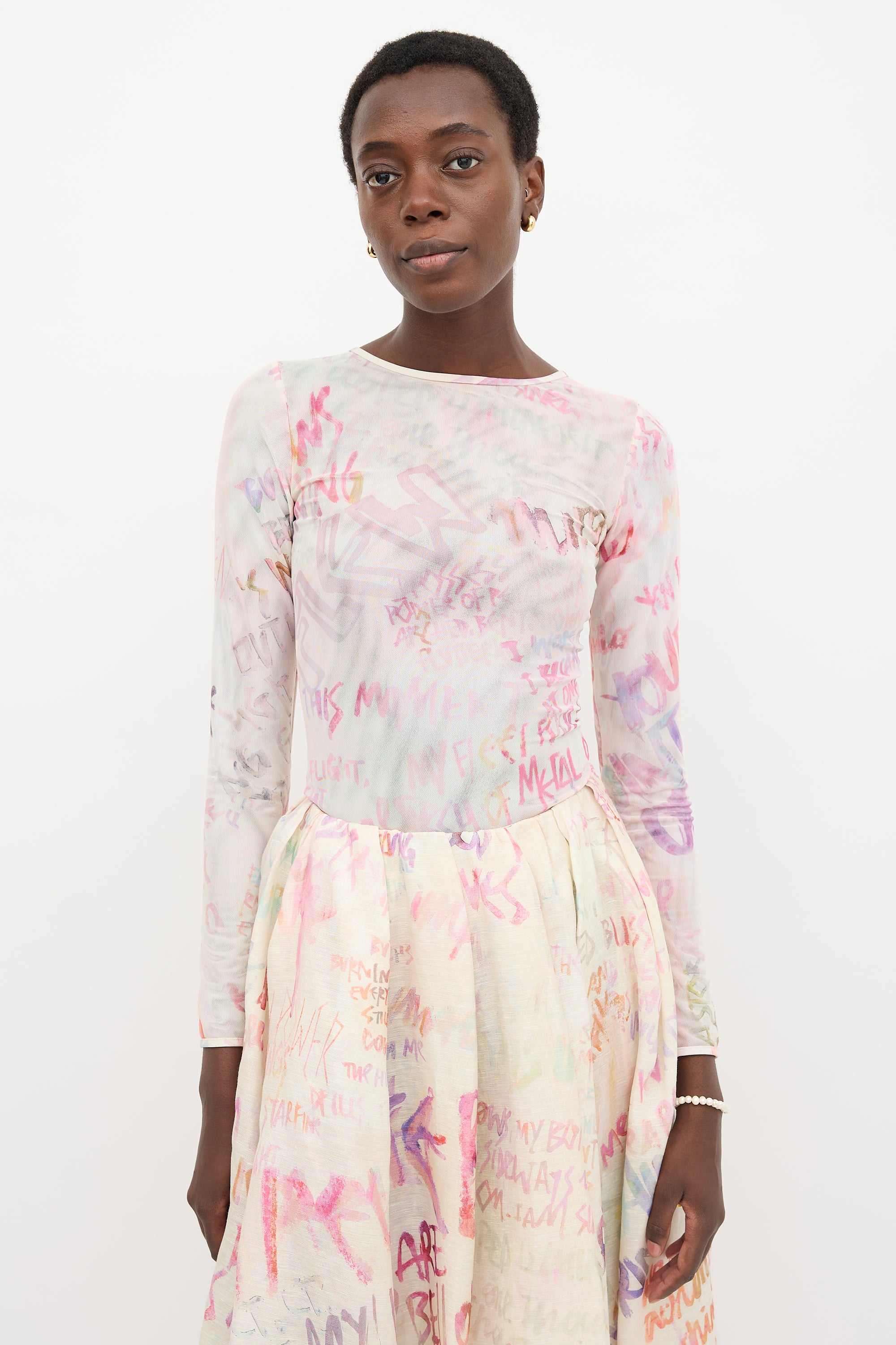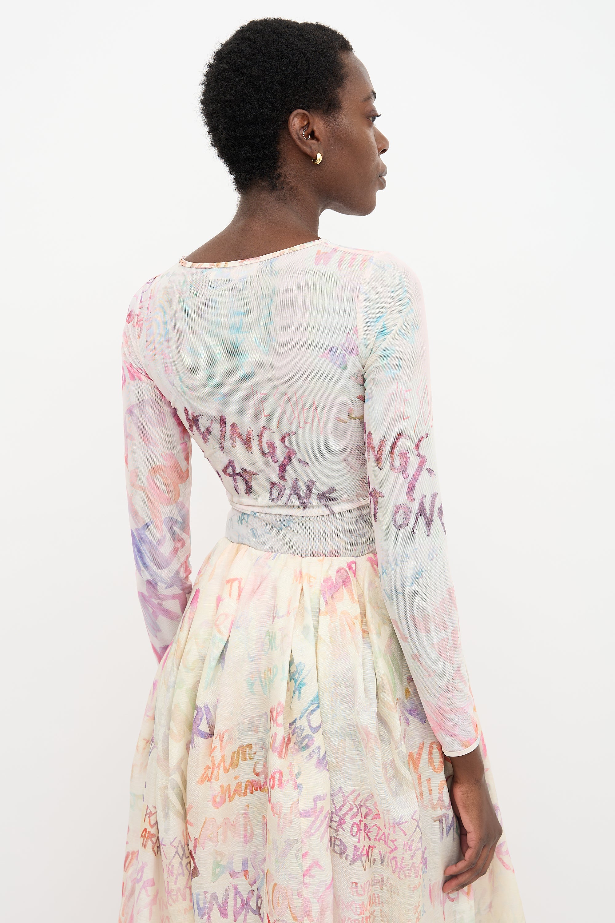 Pre-owned Zimmermann cream mesh Dancer Graffiti bodysuit featuring a round neckline, multicolour graphic text print, and full brief with snap button closure.