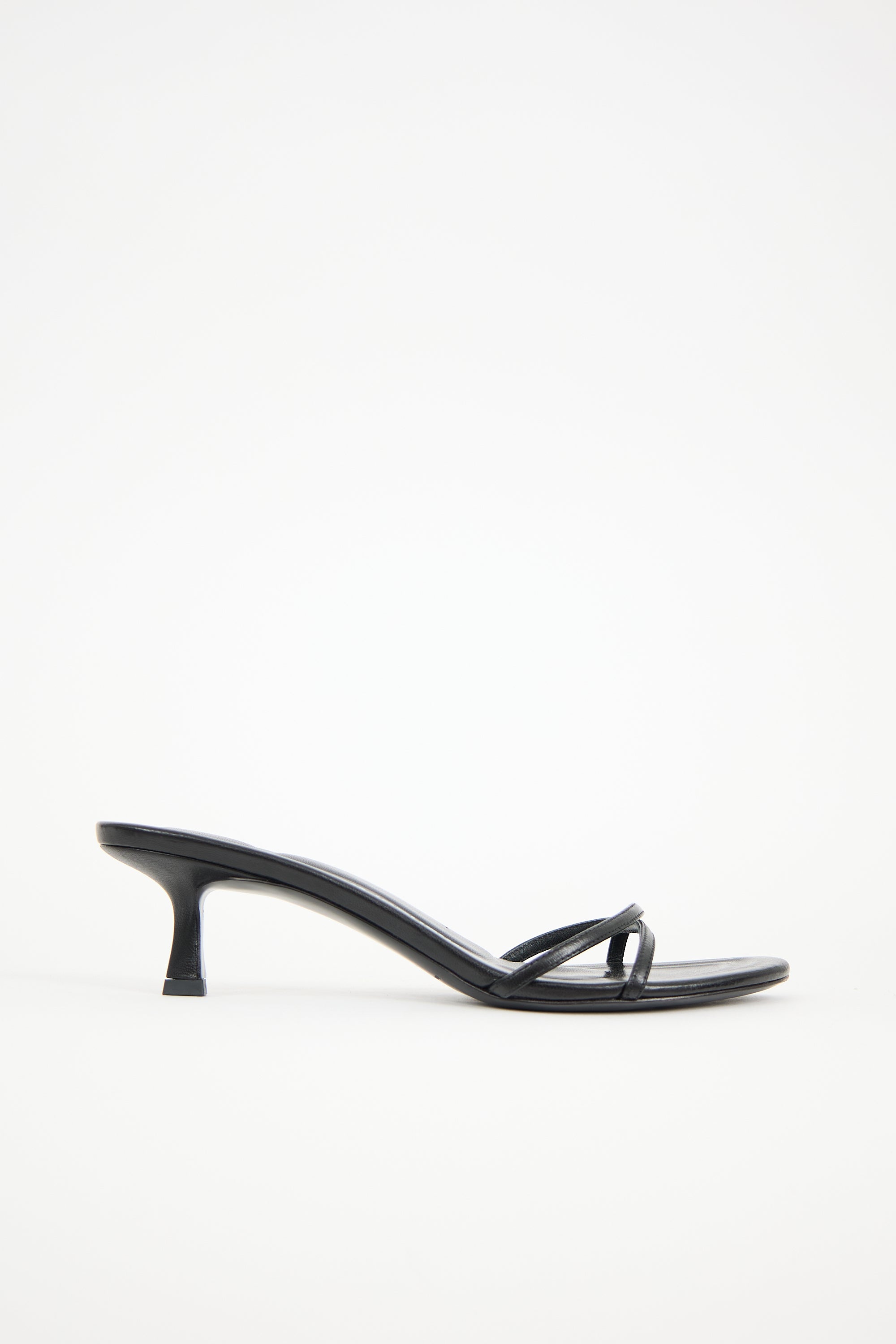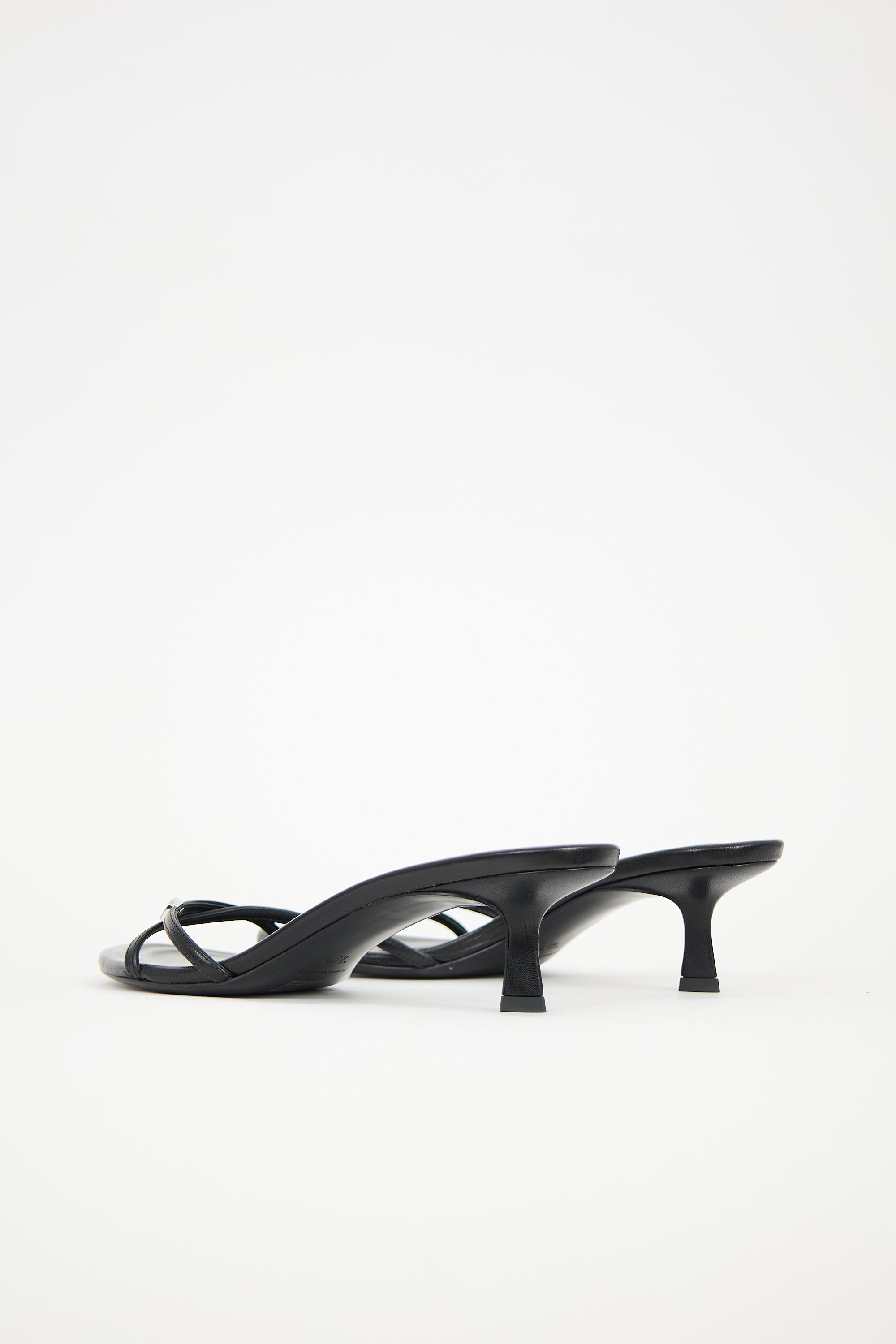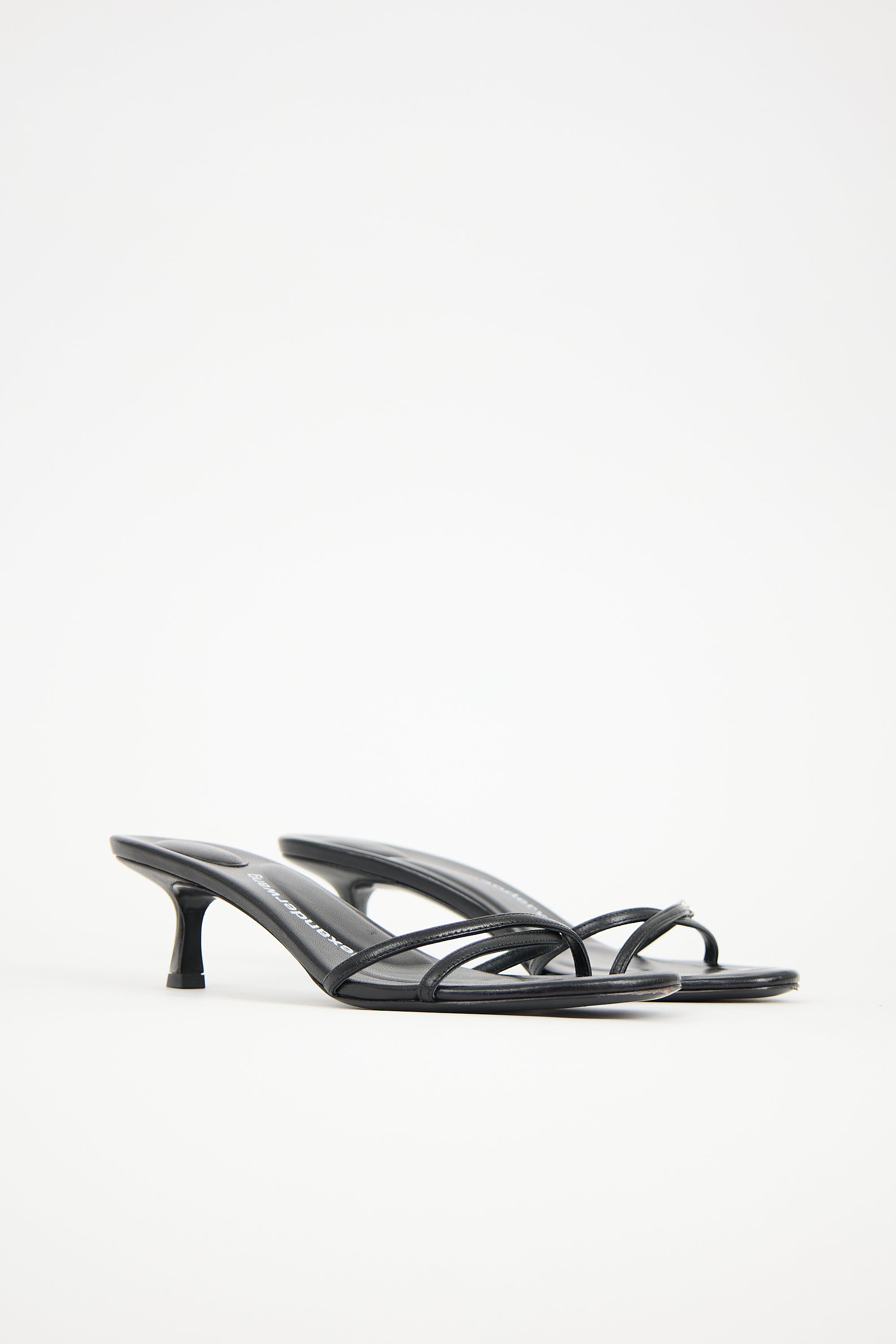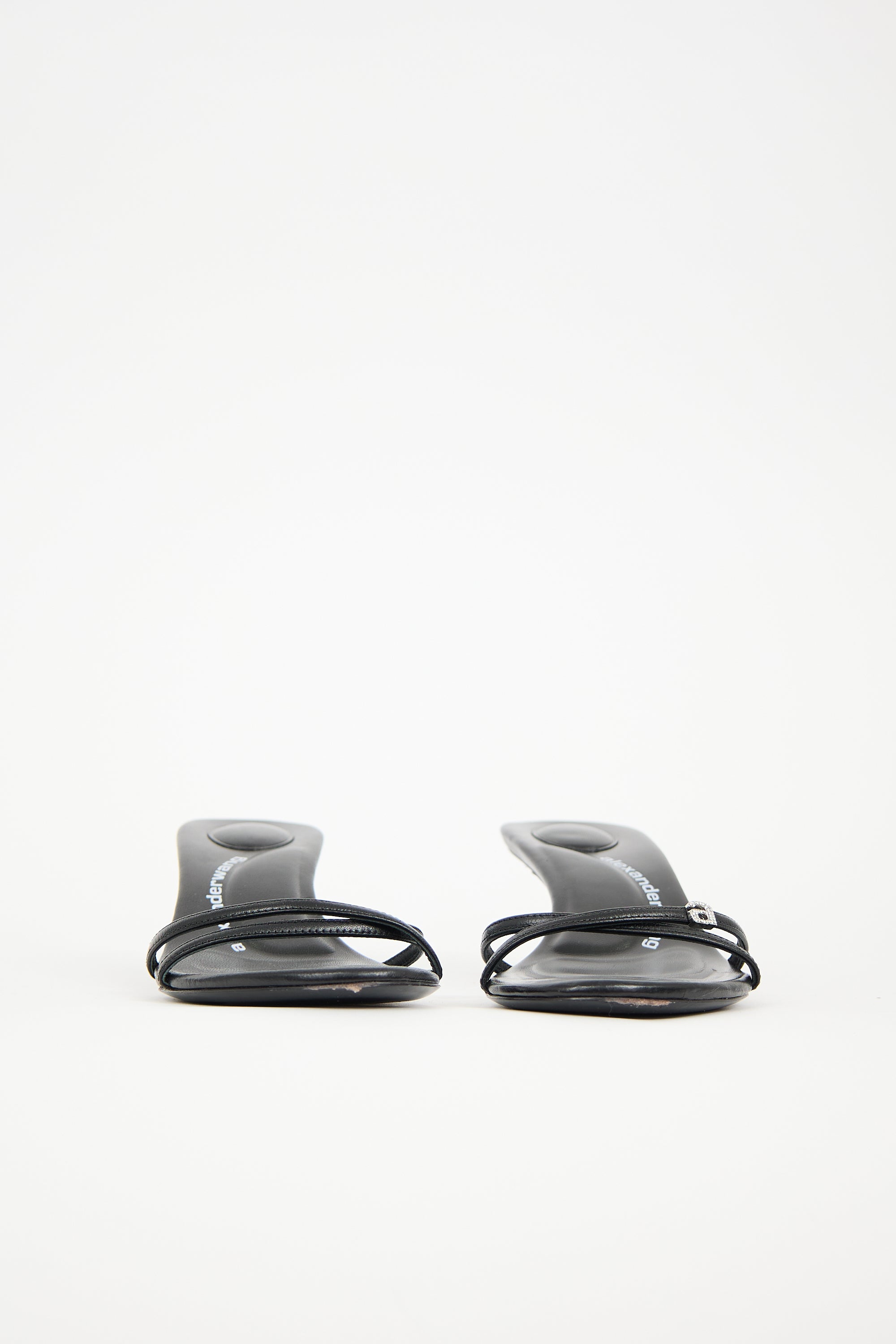 Pre-owned Alexander Wang black leather Dahlia sandals featuring rounded toe, criss cross vamp, crystal logo embellishment at left shoe, and covered kitten heel.