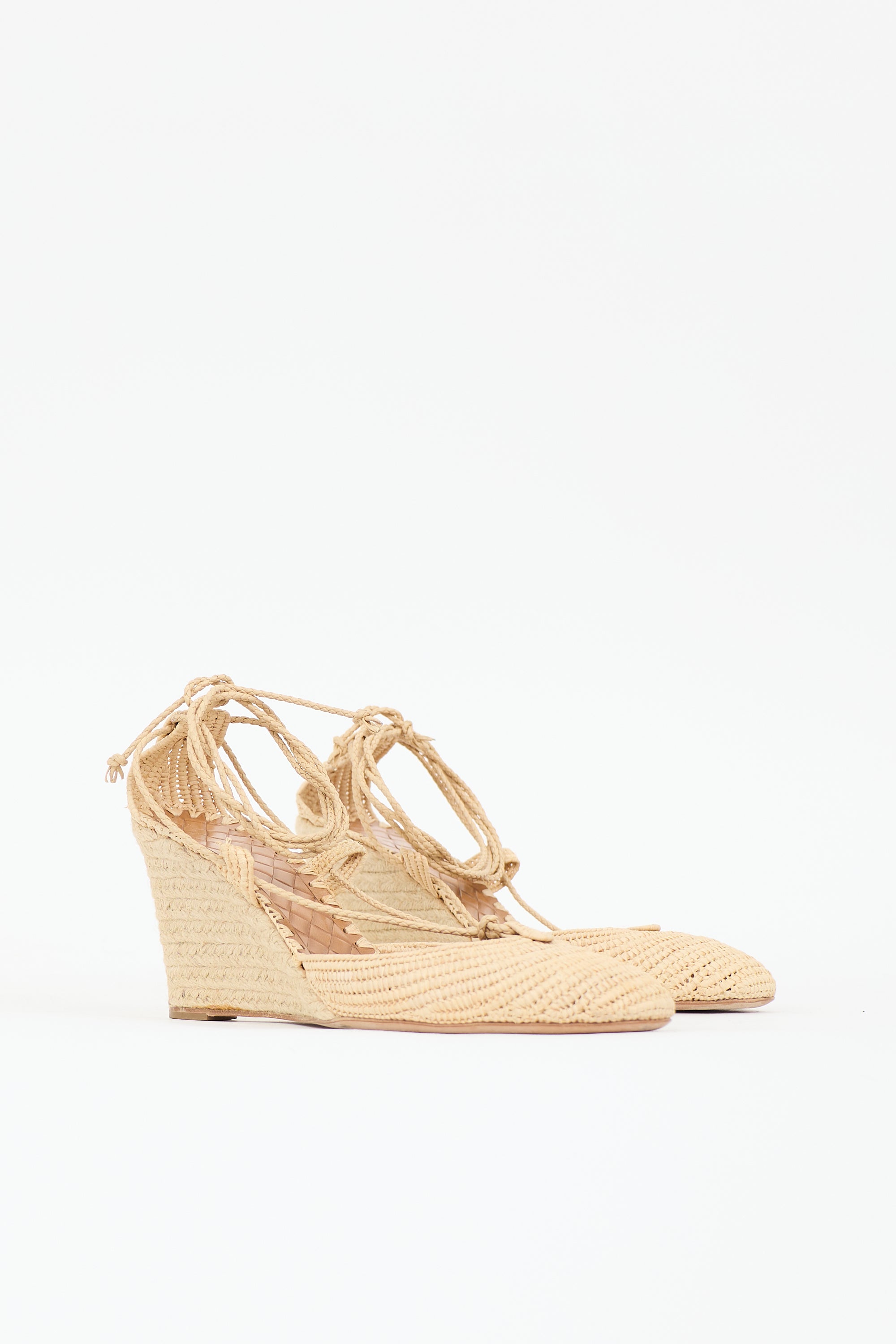 Pre-owned Bottega Veneta beige raffia espadrille sandals featuring rounded toe, woven rows, wraparound ankle strap, and braided wedge heel.