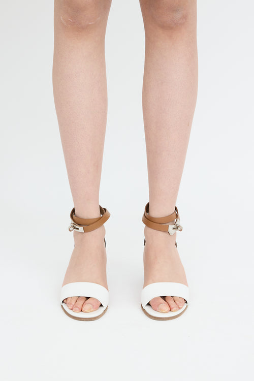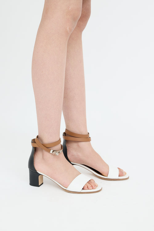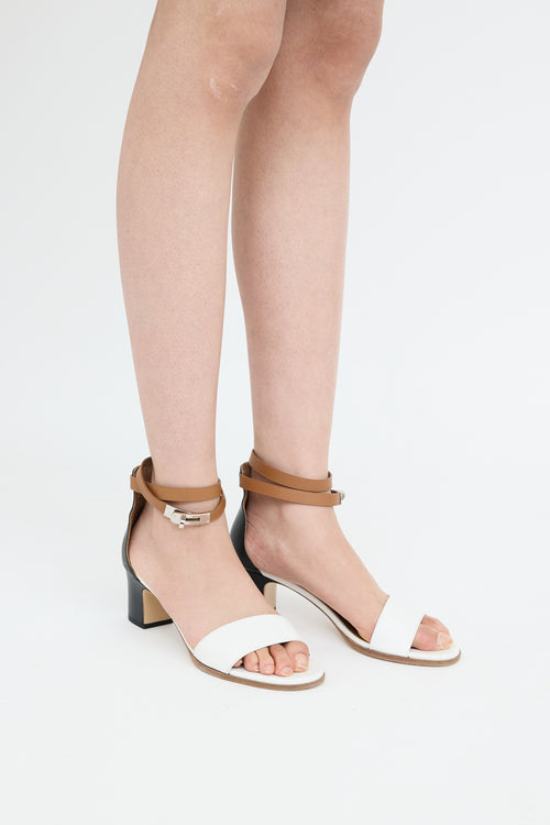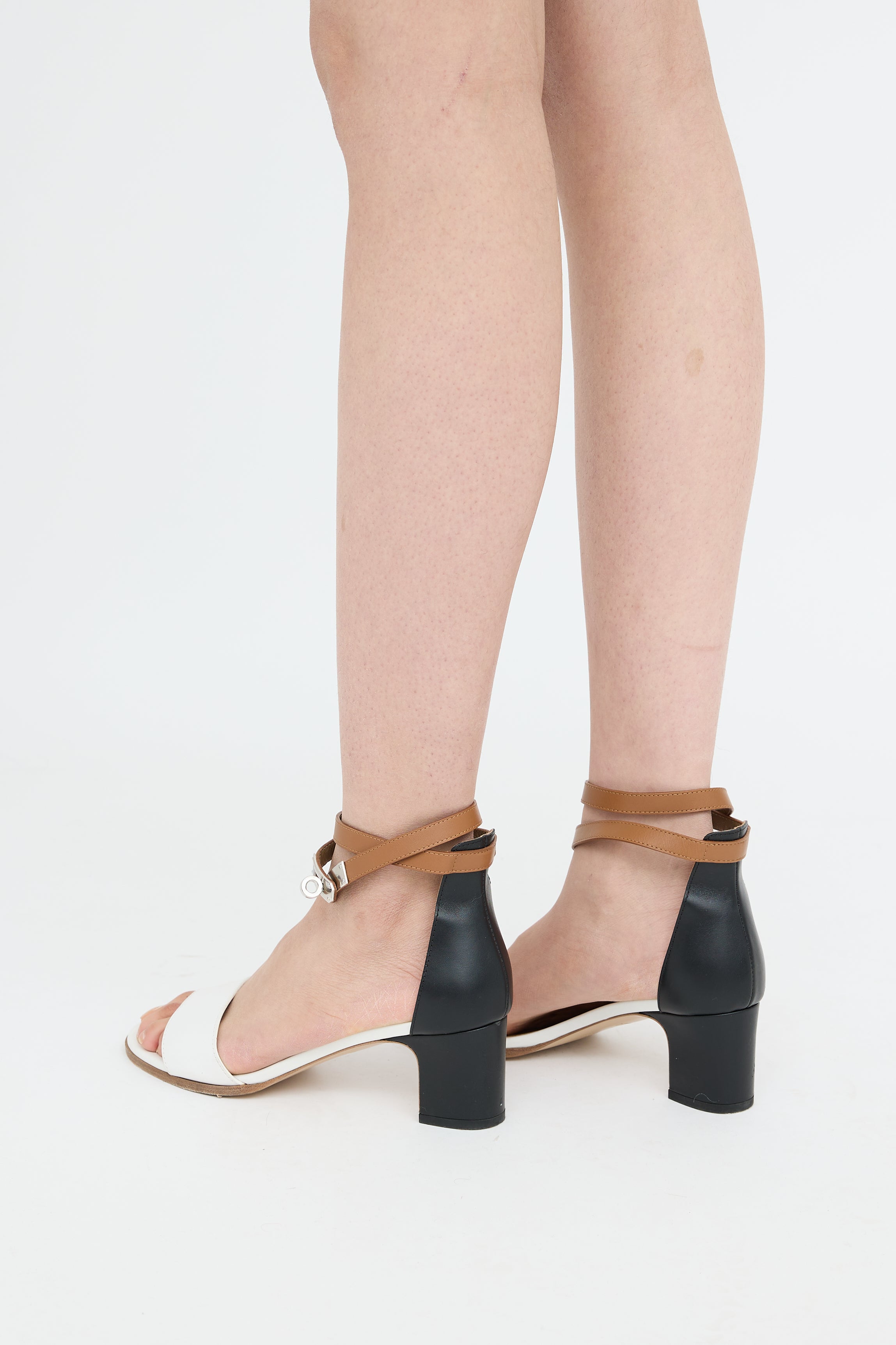 Pre-owned Hermès brown, black and white Kelly Manege sandals featuring round toe, strap on toe box, silver tone hardware, wrap ankle strap with twist lock closure hardware and block heel.