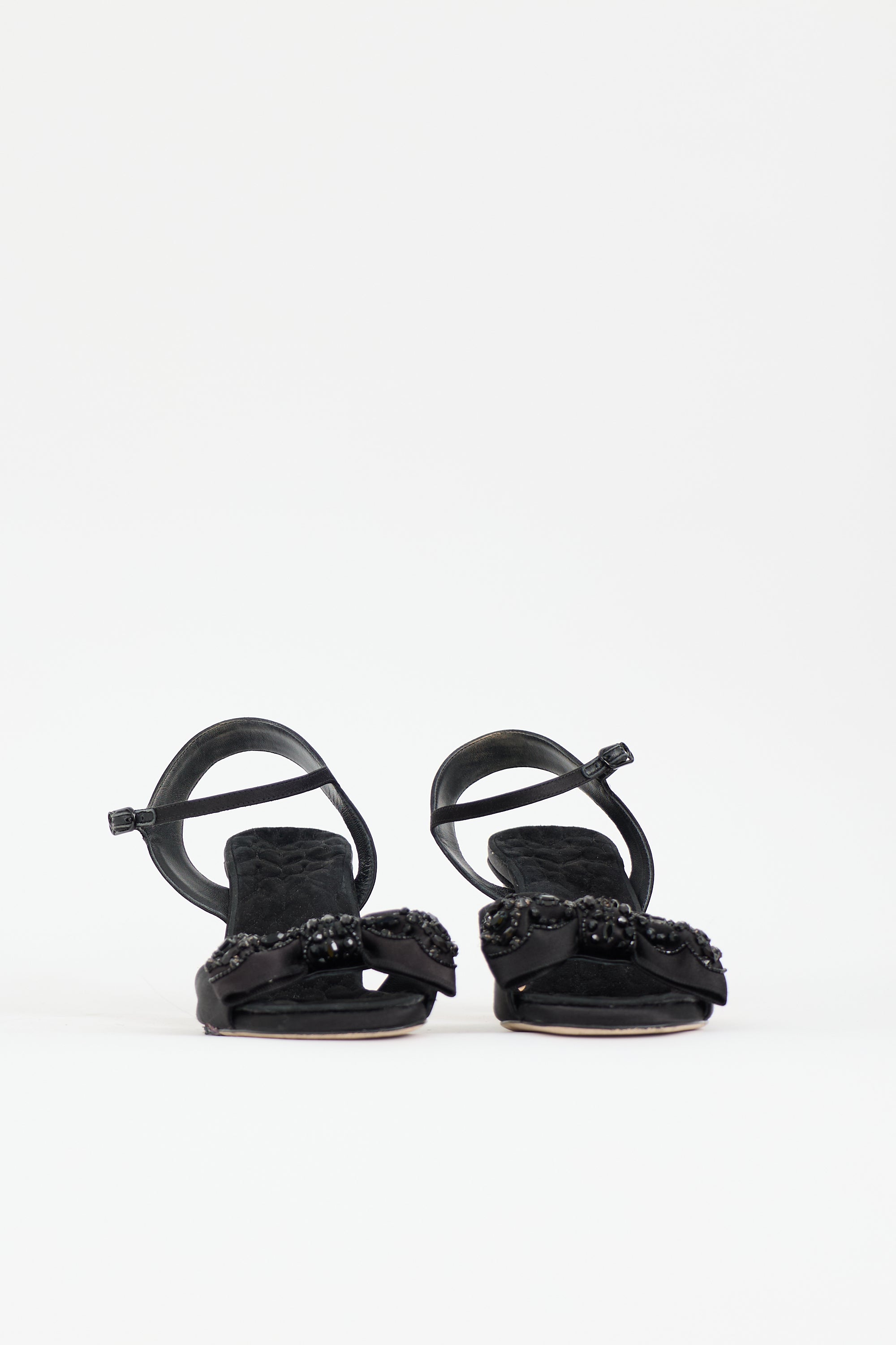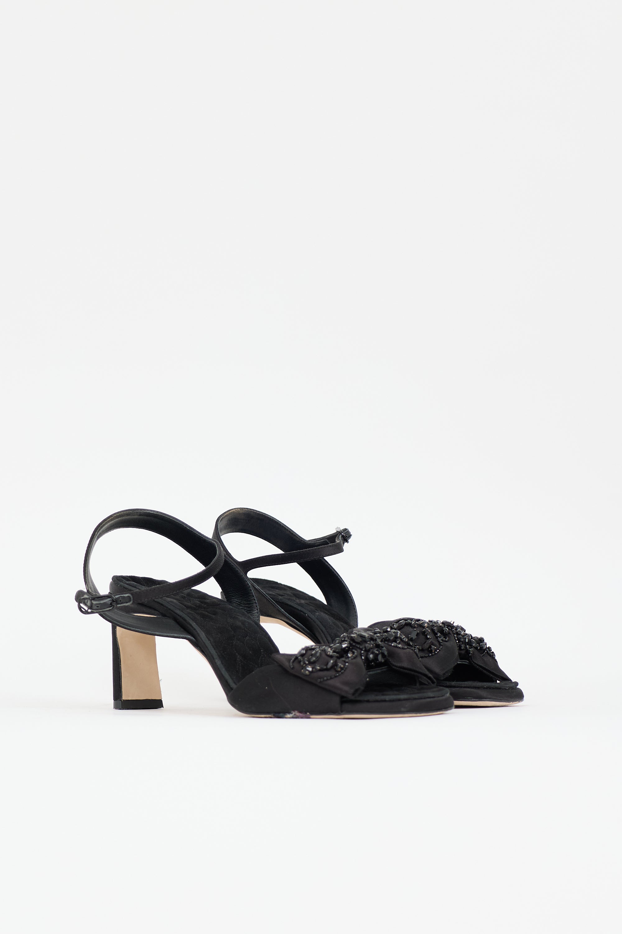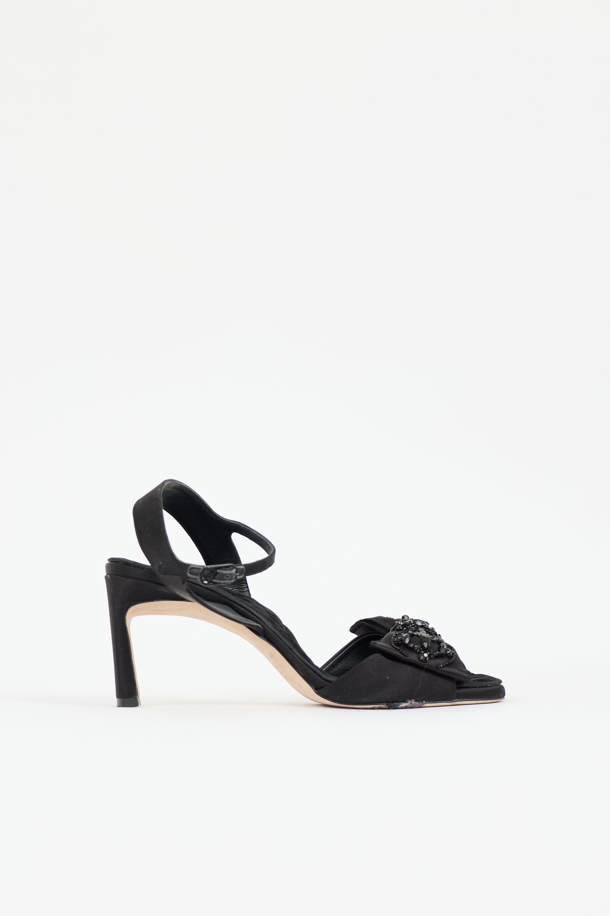 Pre-owned Le Seul black satin and suede Daffodil sandals featuring square toe, embellished bow at vamp, adjustable ankle strap, and covered heel.
