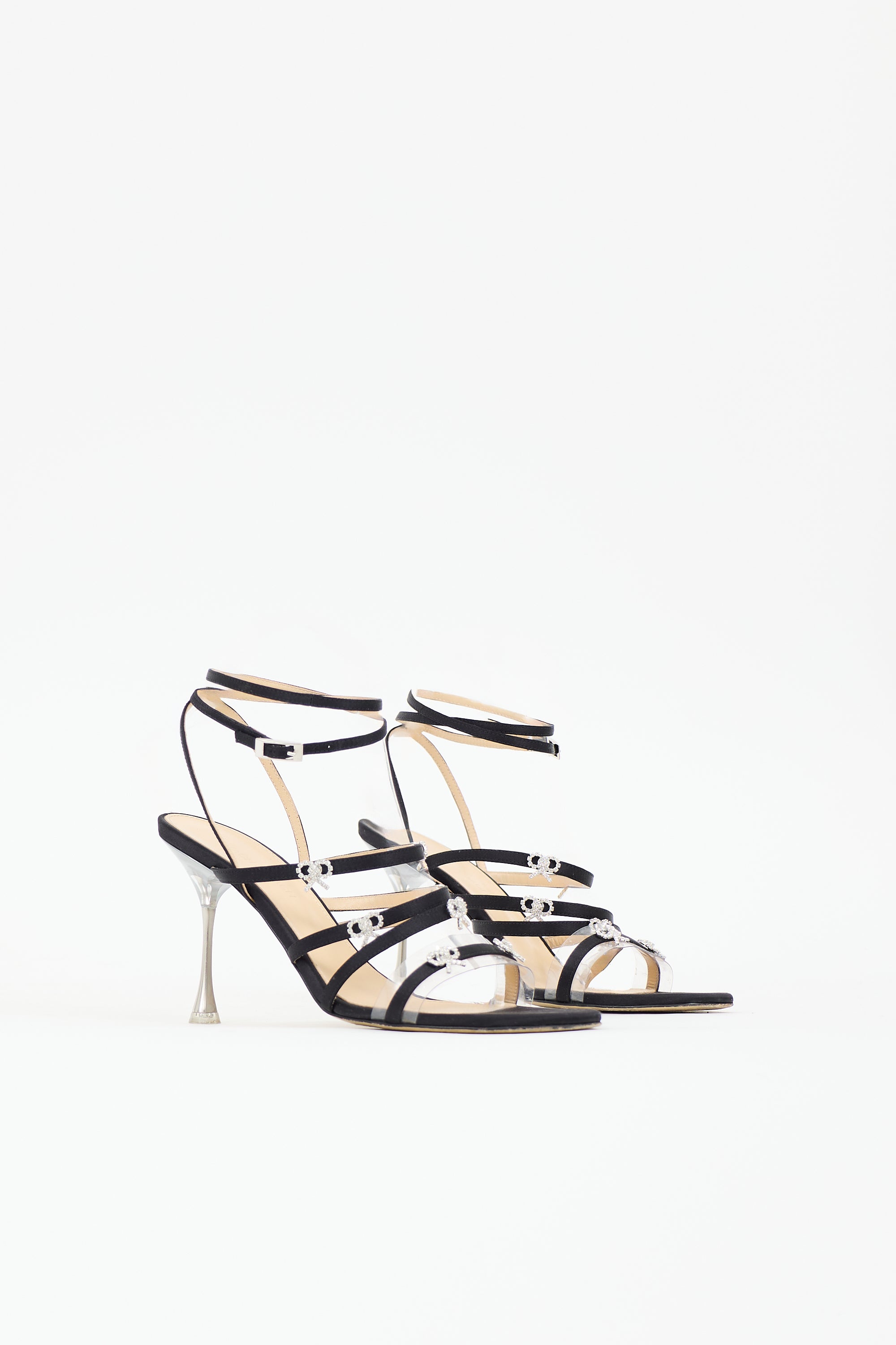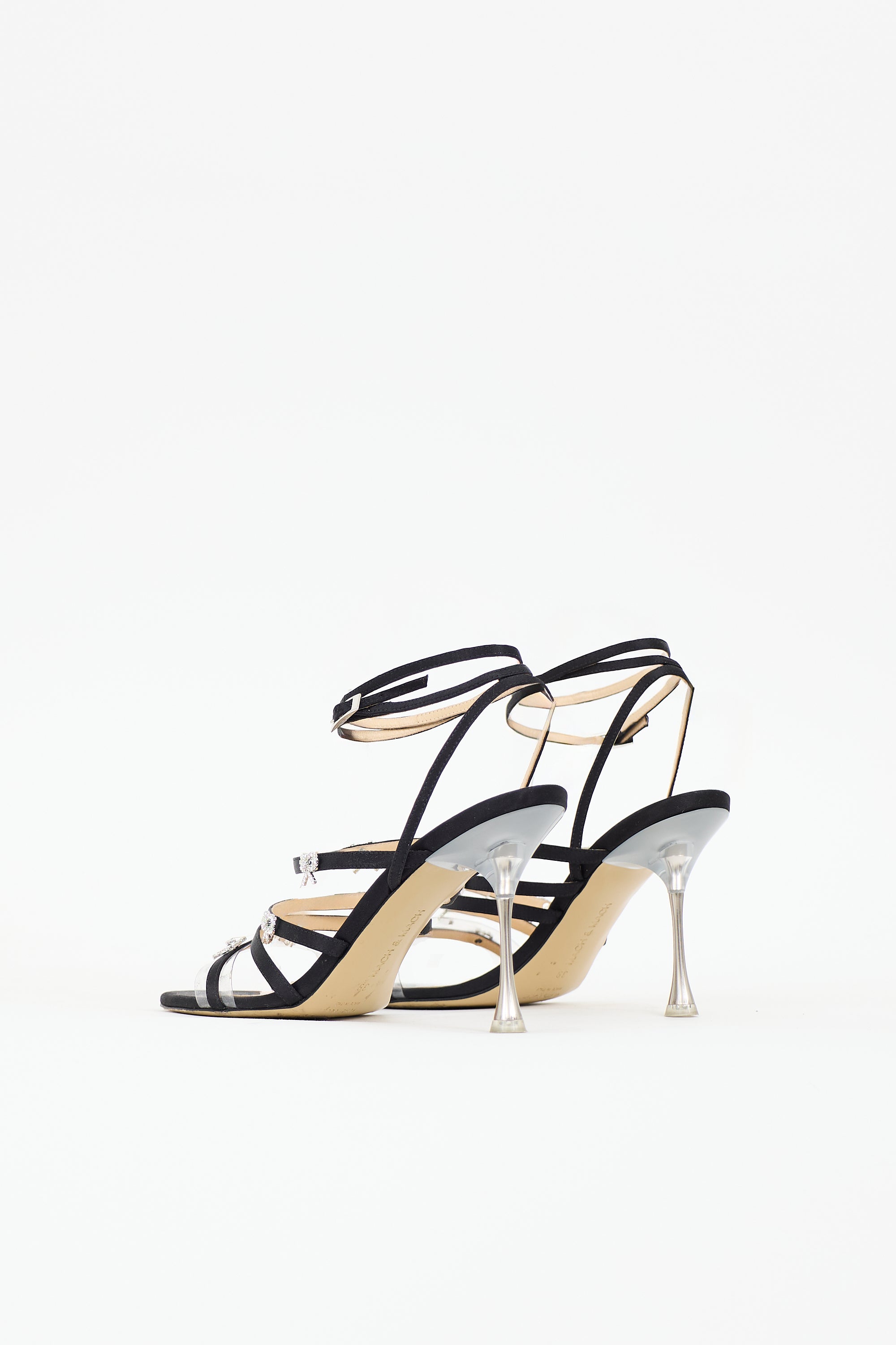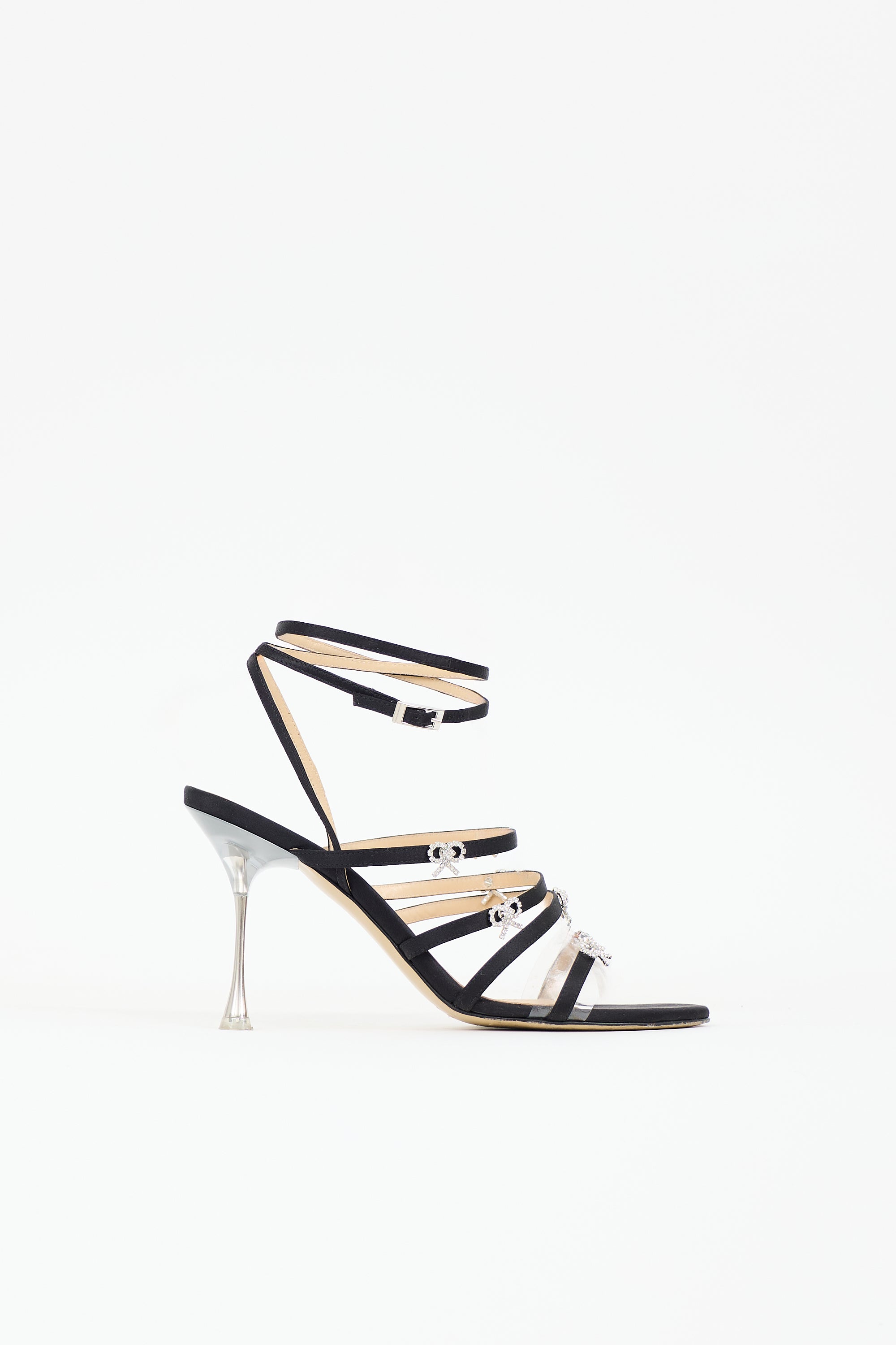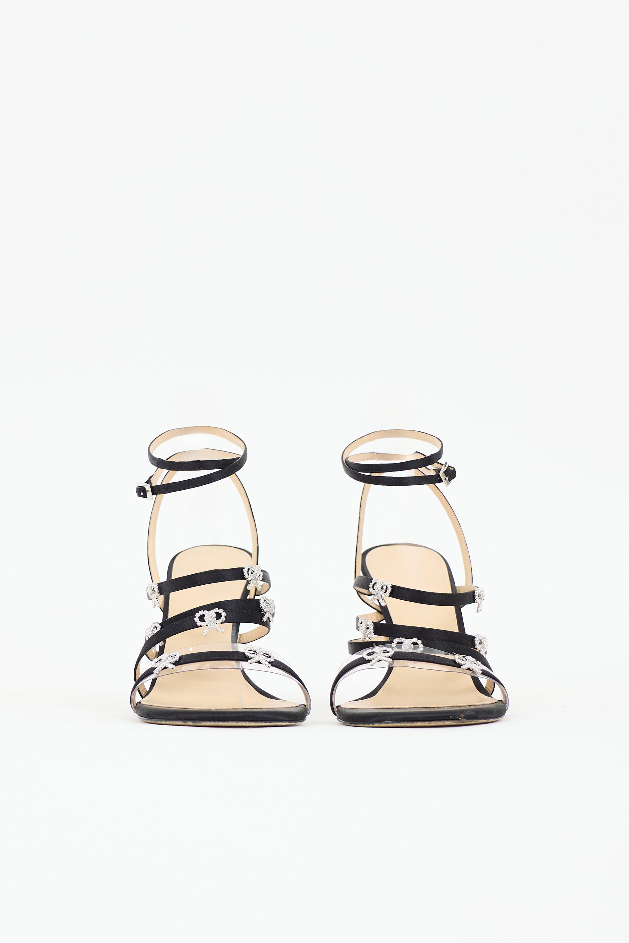 Pre-owned Mach & Mach black satin Camille sandals featuring rounded toe, crystal bow embellishment at straps, adjustable wraparound ankle straps, and silver tone fluted heel.