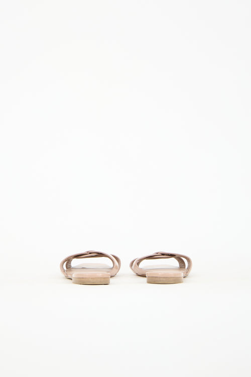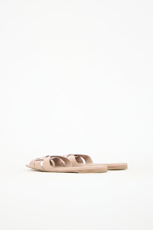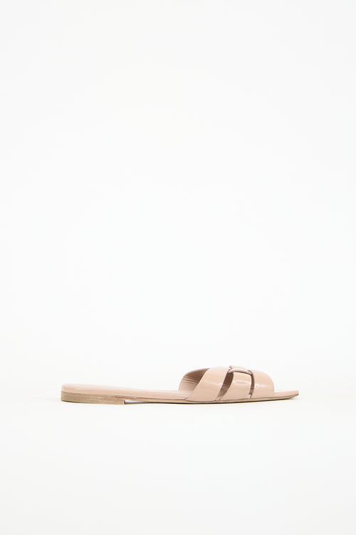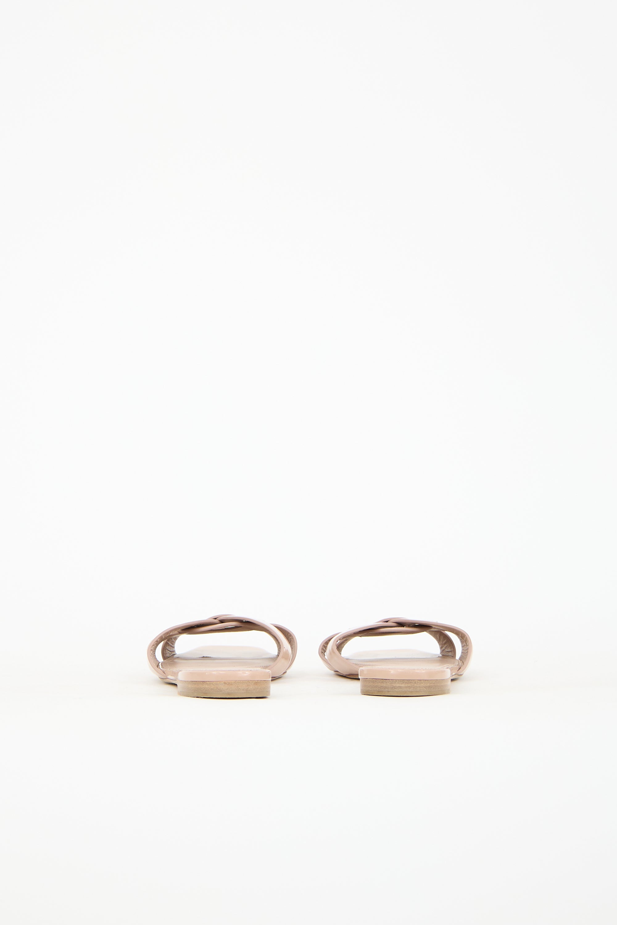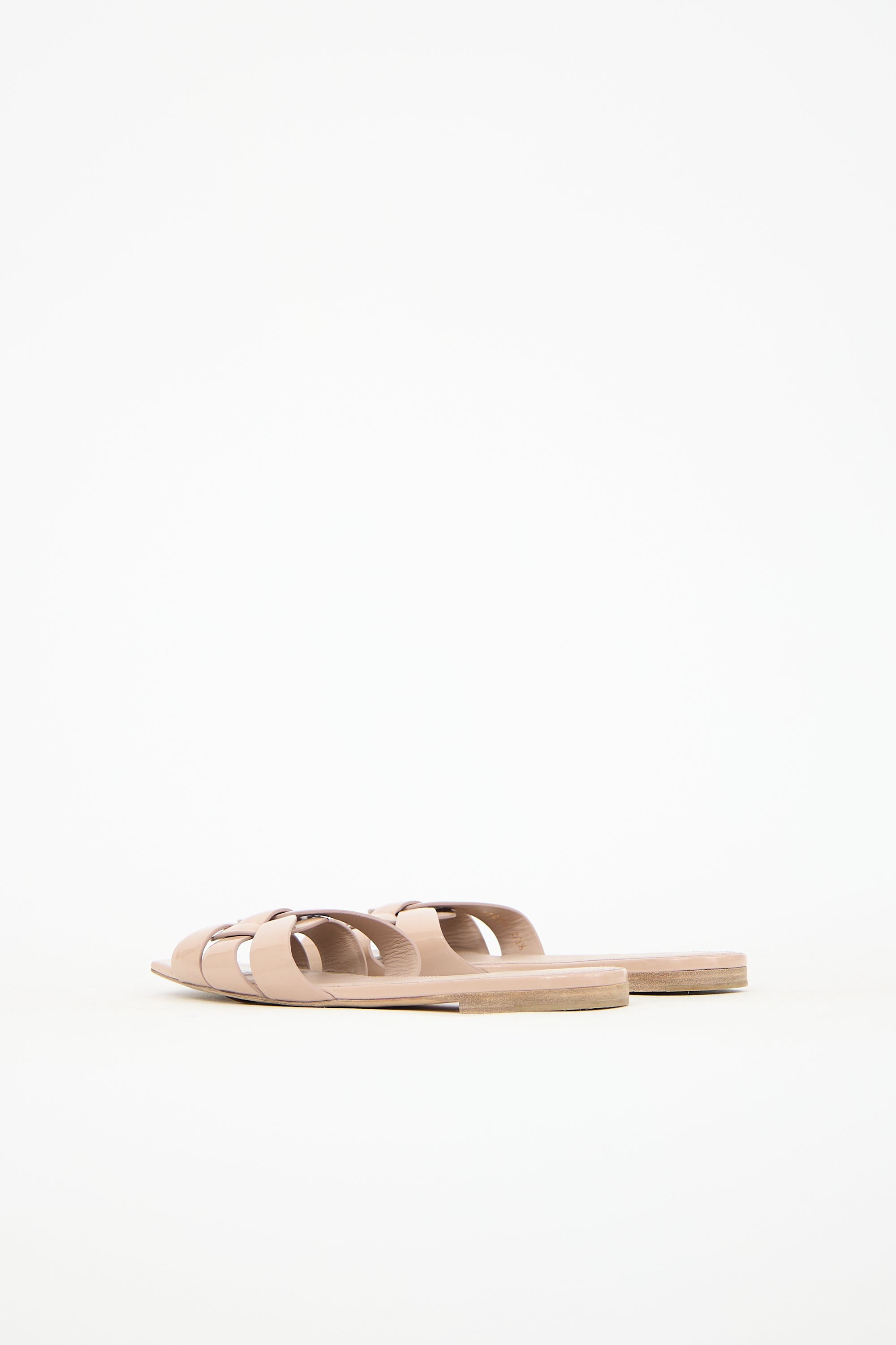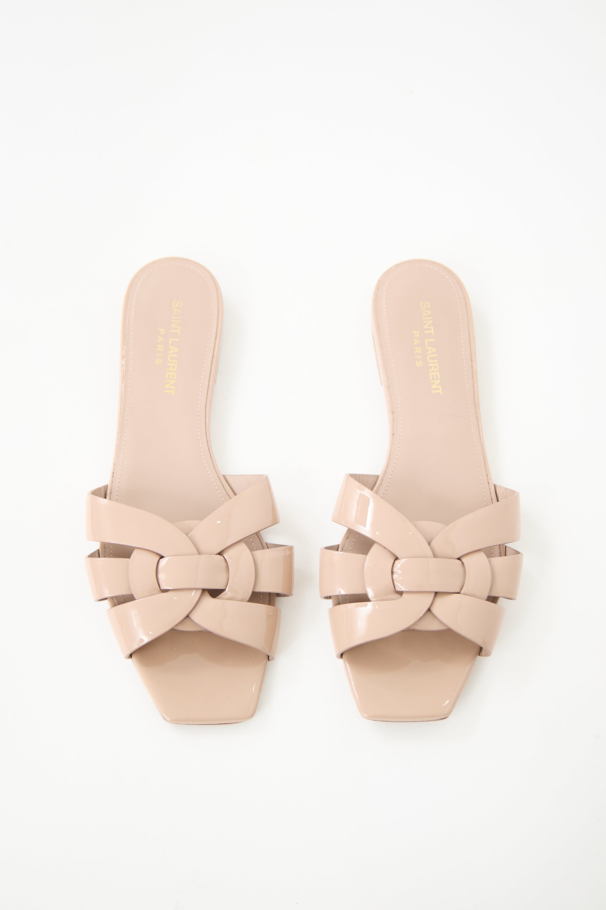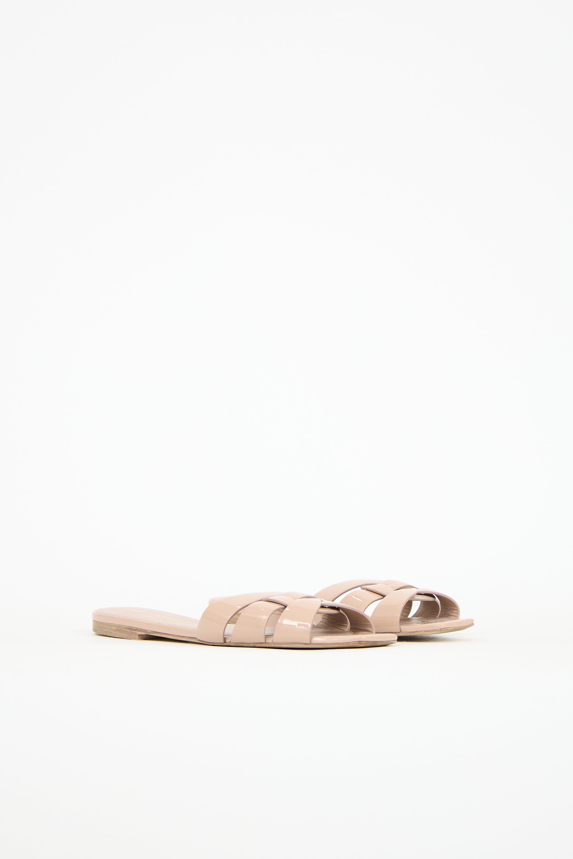 Pre-owned Saint Laurent beige Nu Pieds sandals featuring an open square toe, patent leather upper, and woven strappy vamp.
