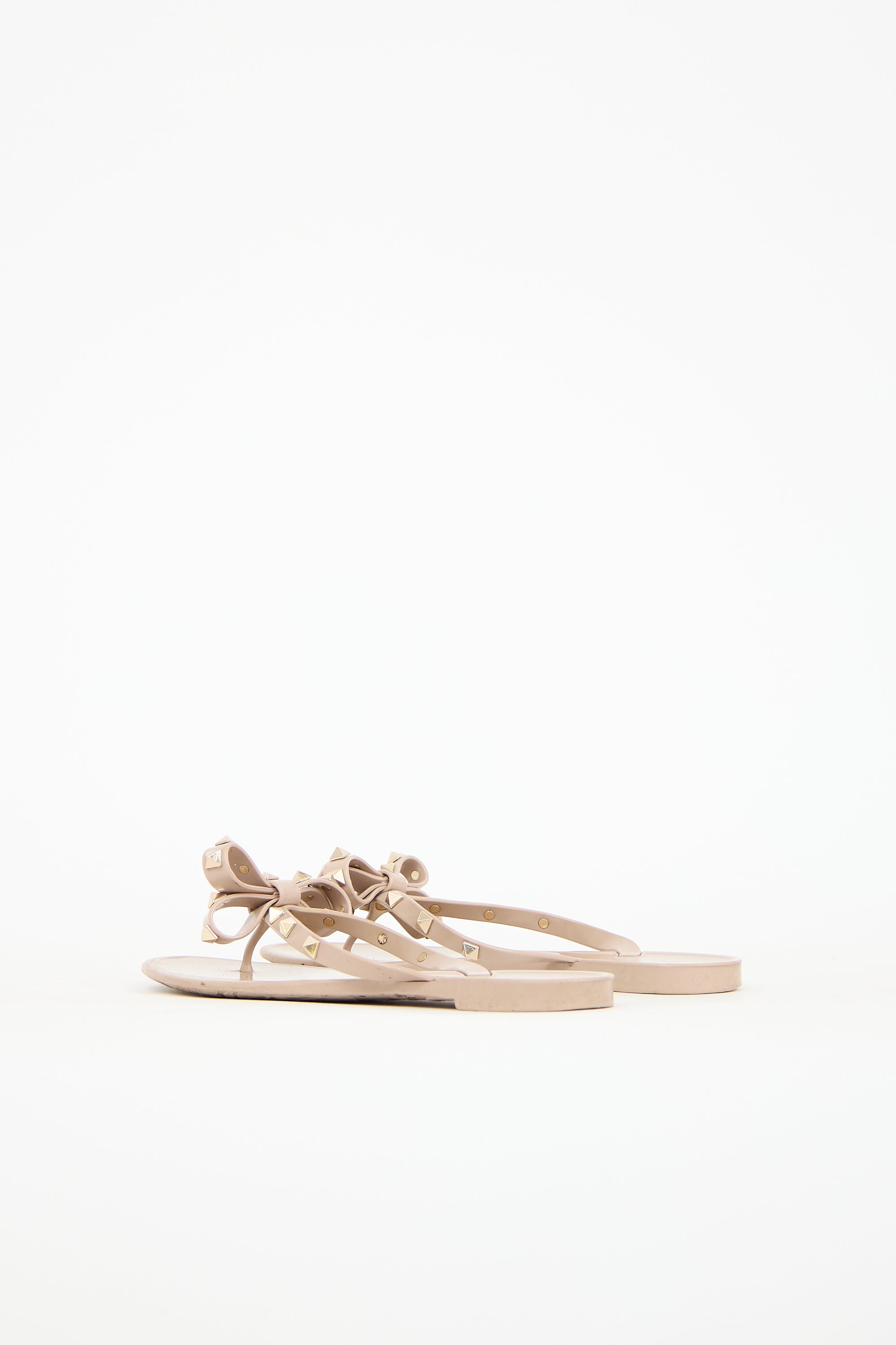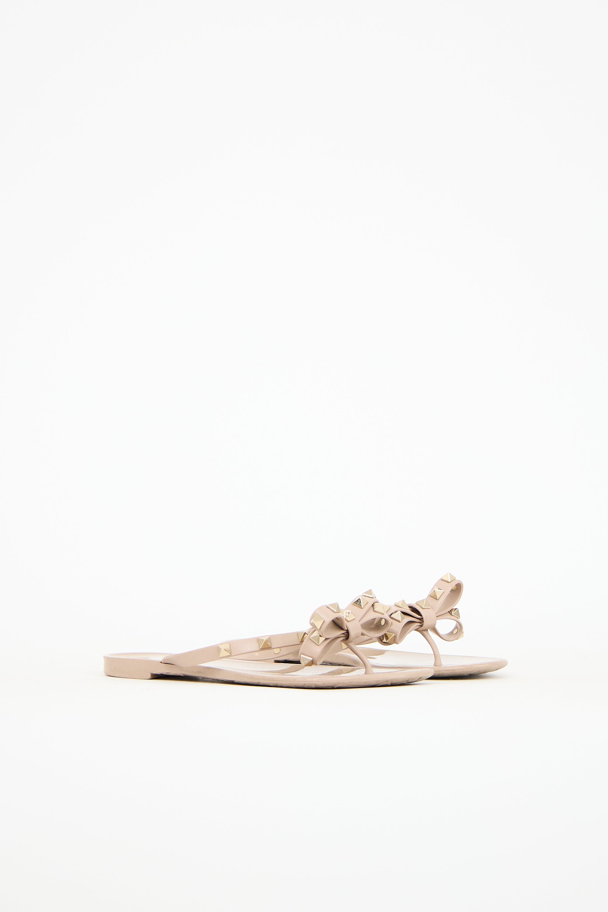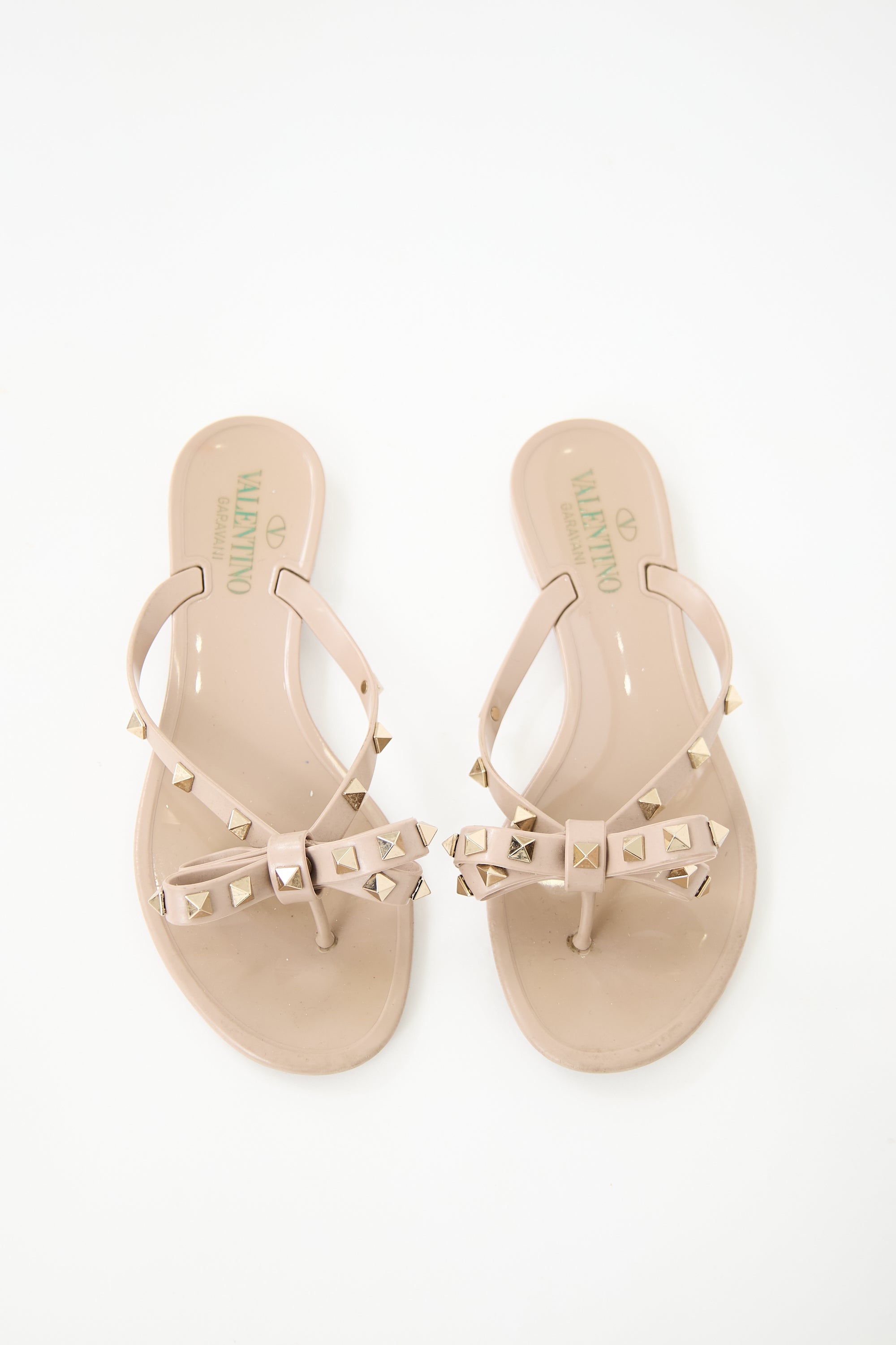 Pre-owned Valentino beige rubber sandals featuring an open rounded toe, thong strap, bow detail at vamp, and gold tone Rockstud embellishment throughout upper.
