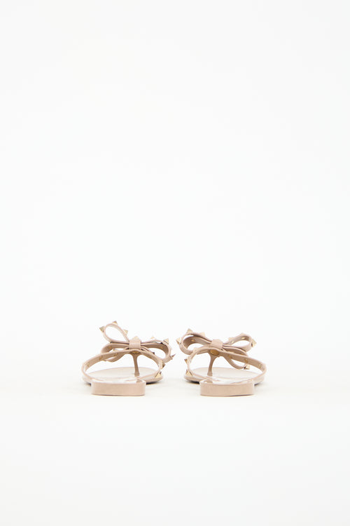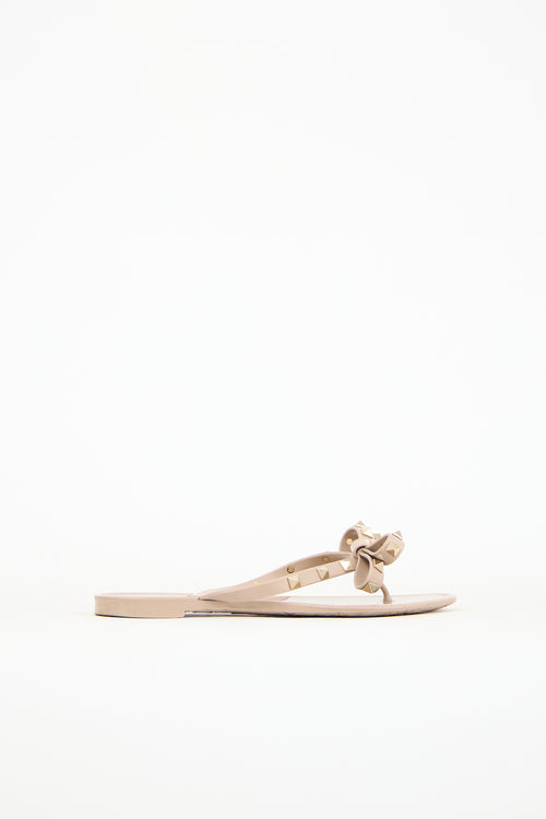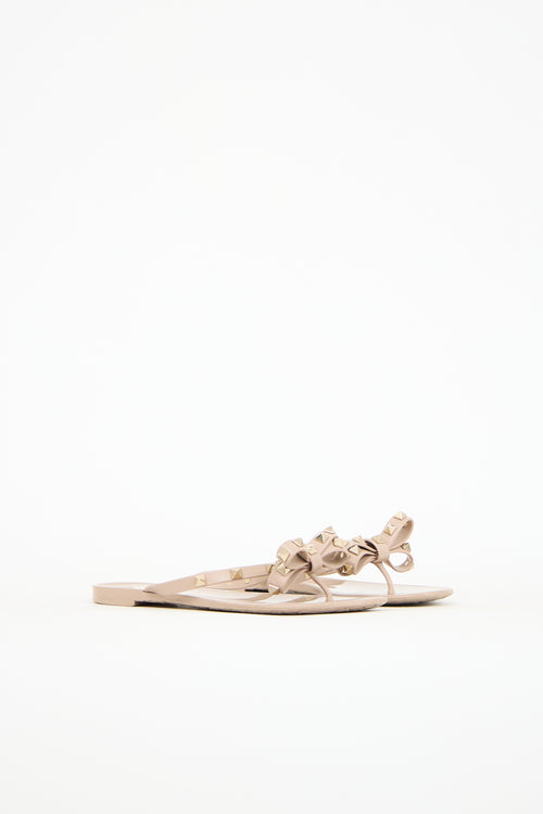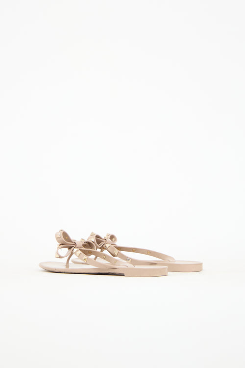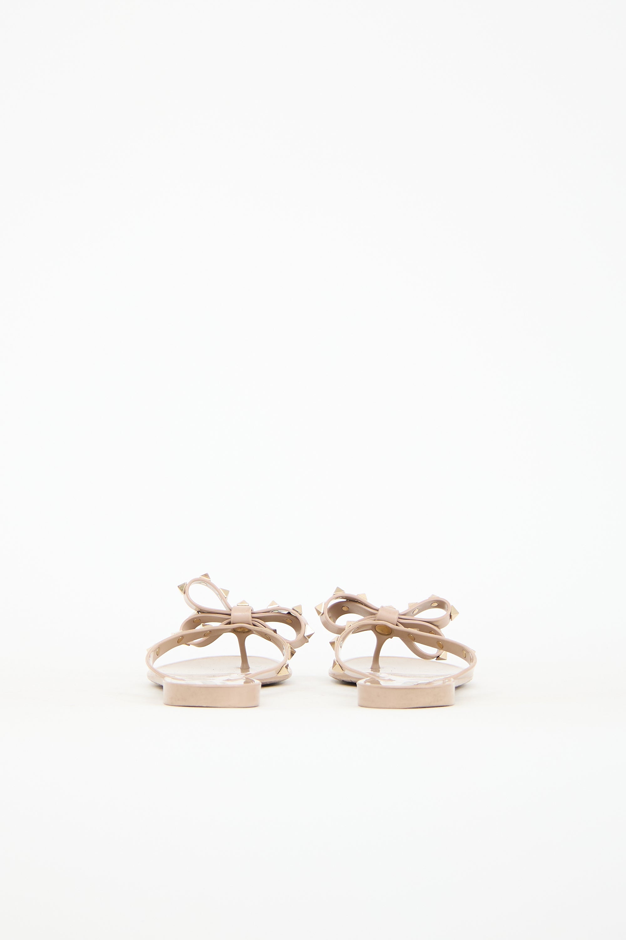 Pre-owned Valentino beige rubber sandals featuring an open rounded toe, thong strap, bow detail at vamp, and gold tone Rockstud embellishment throughout upper.