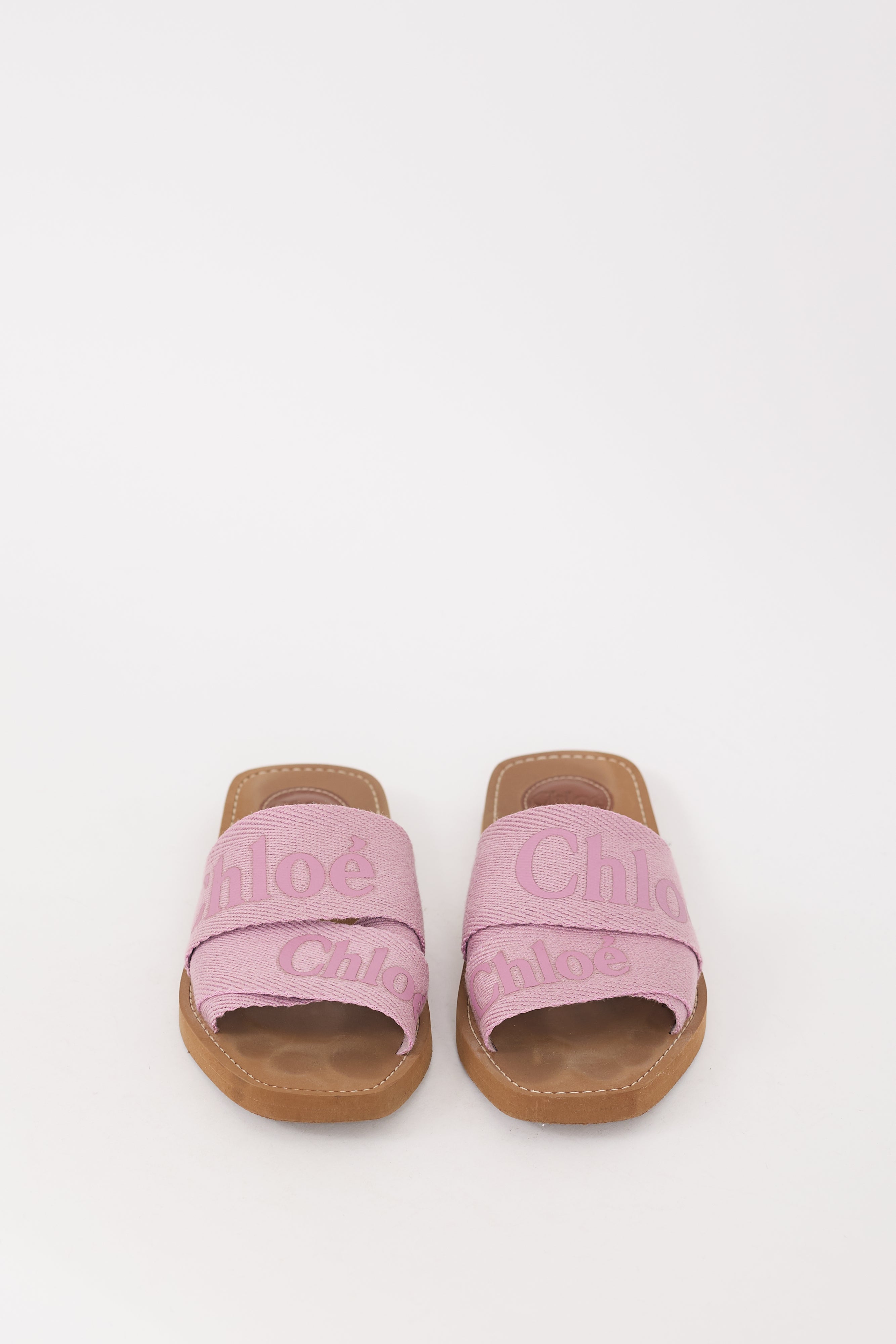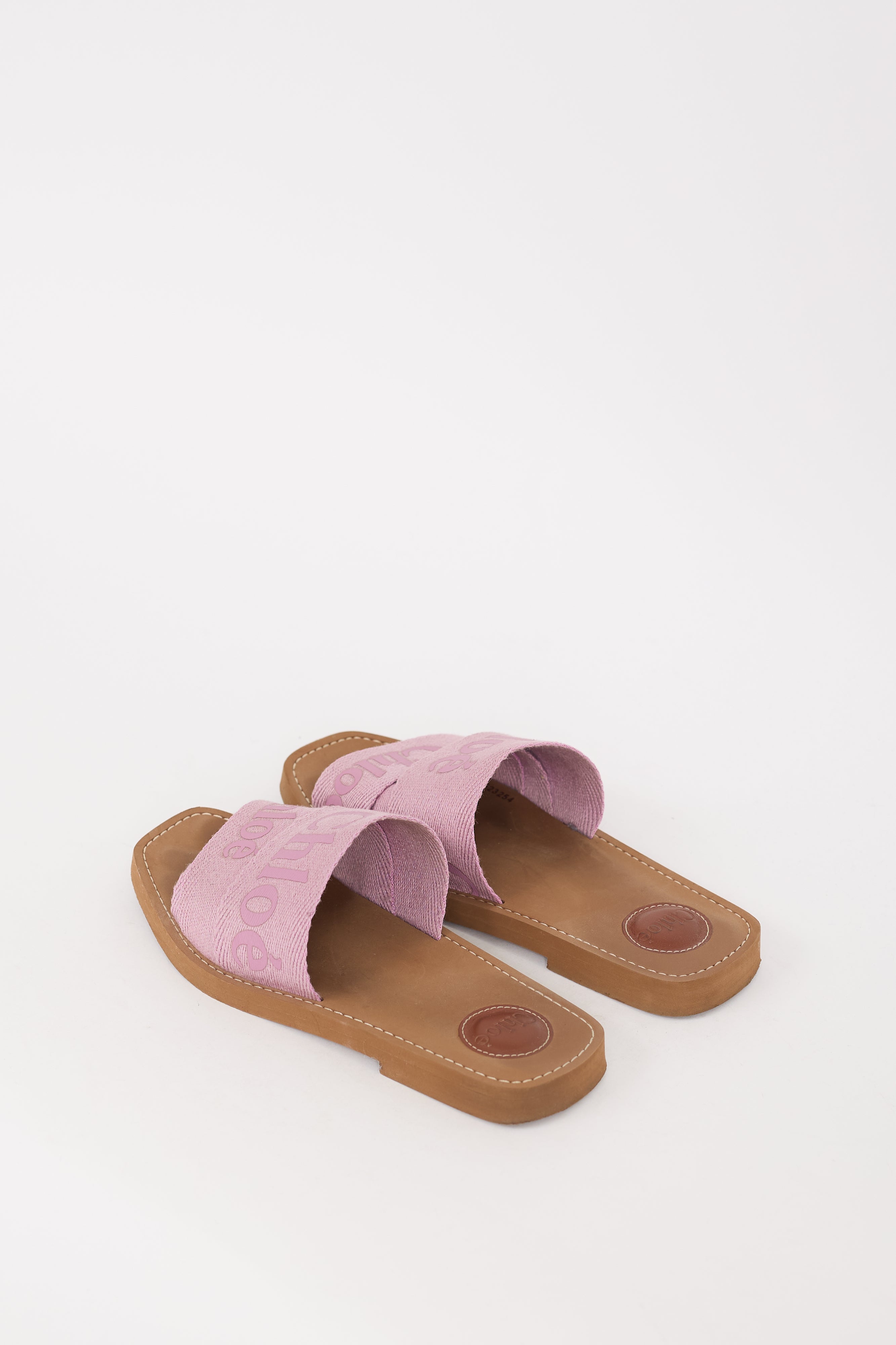 Pre-owned Chloé brown and pink Woody slides featuring open square toe, webbed strap with logo, slip on entry, and padded logo patch at insole.