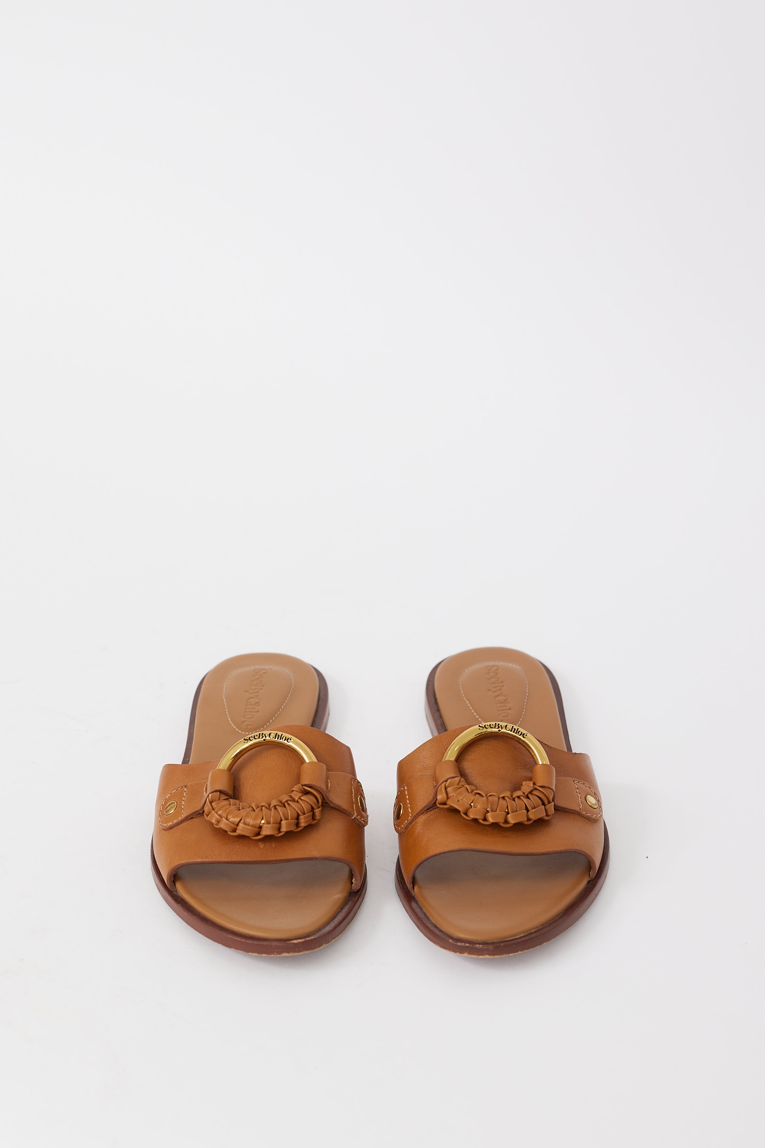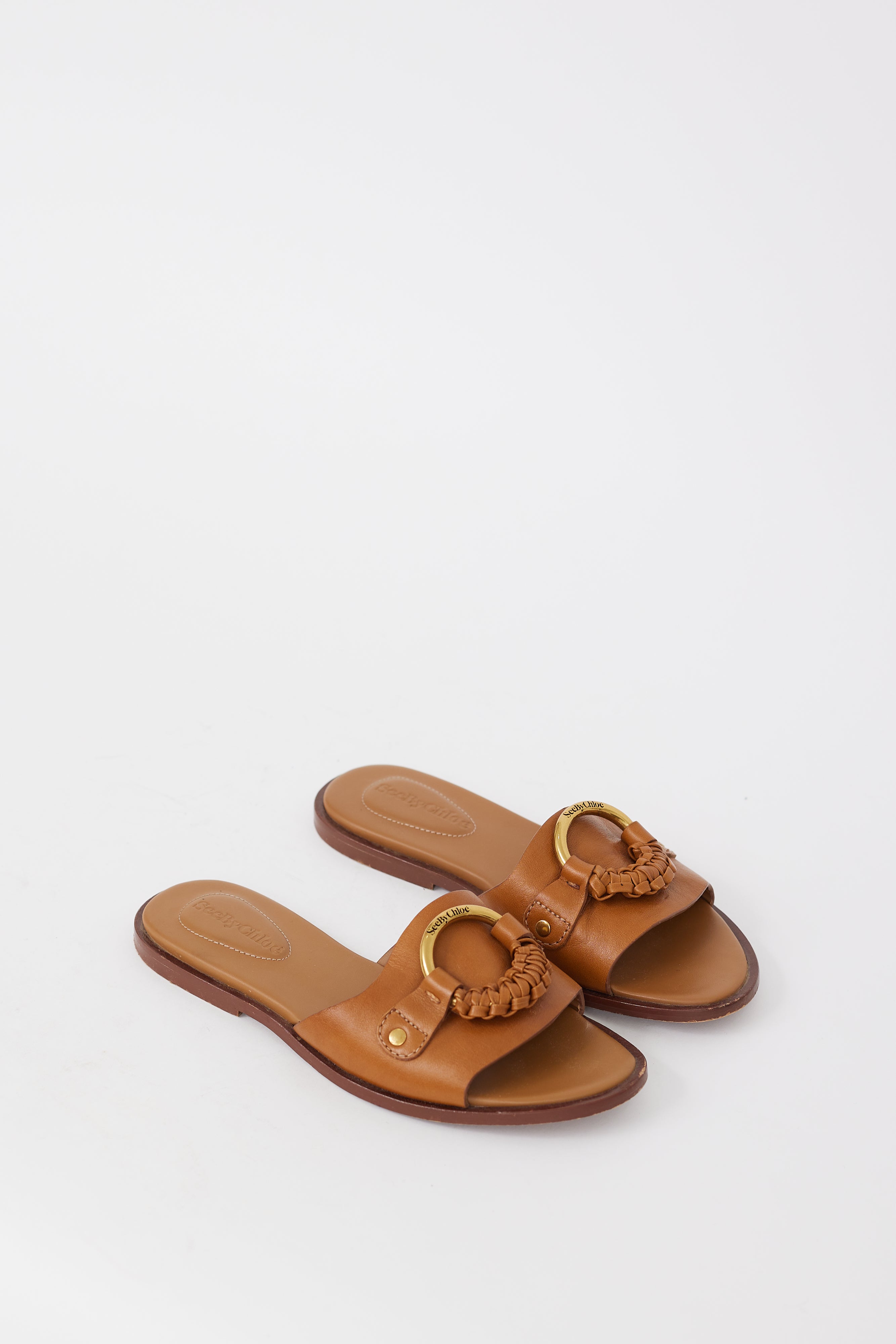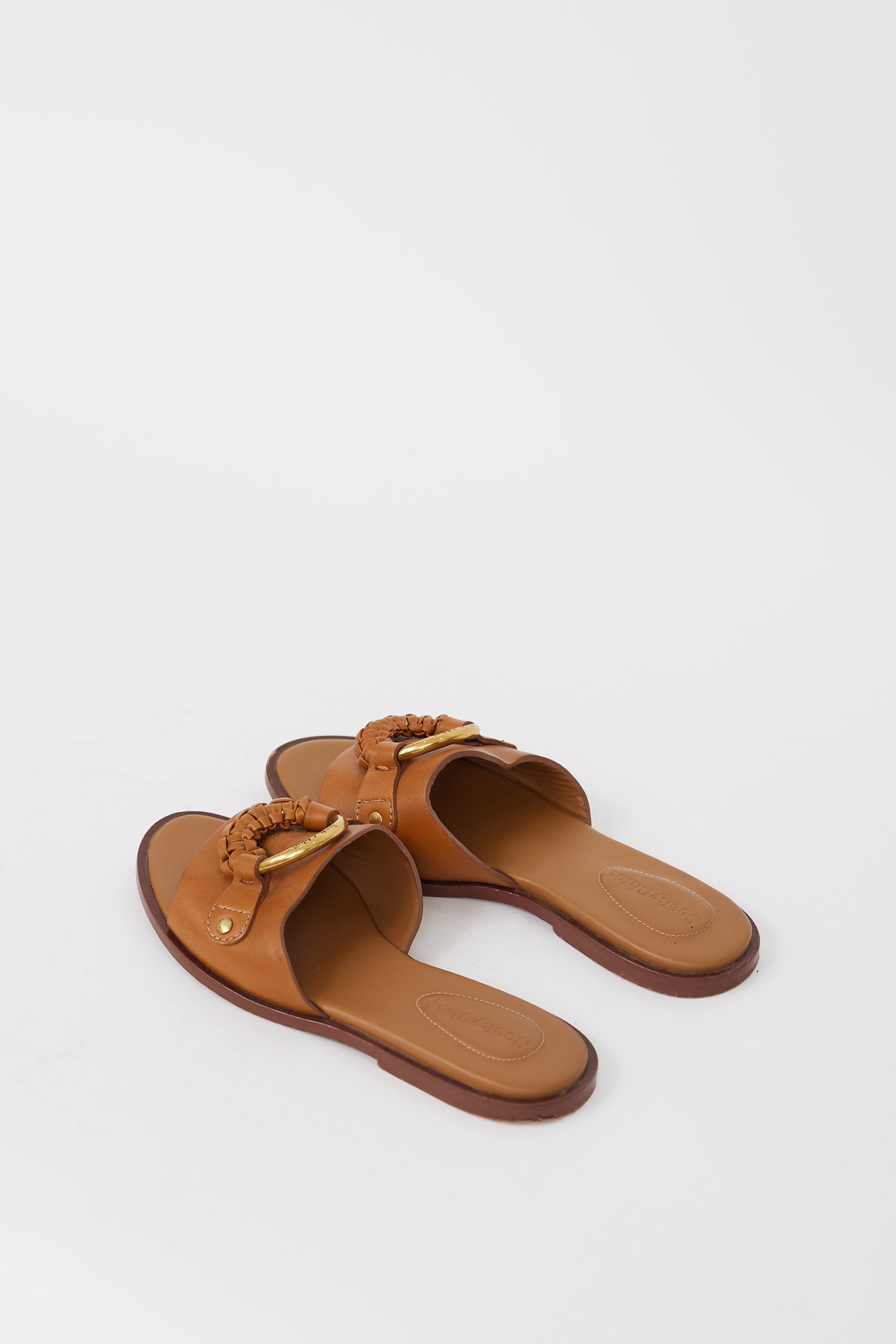 Pre-owned See By Chloé brown leather Hana slides featuring open almond toe, gold tone buckle at vamp with braided leather, wooden midsole, and short stacked heel. Comes with original dust bag.