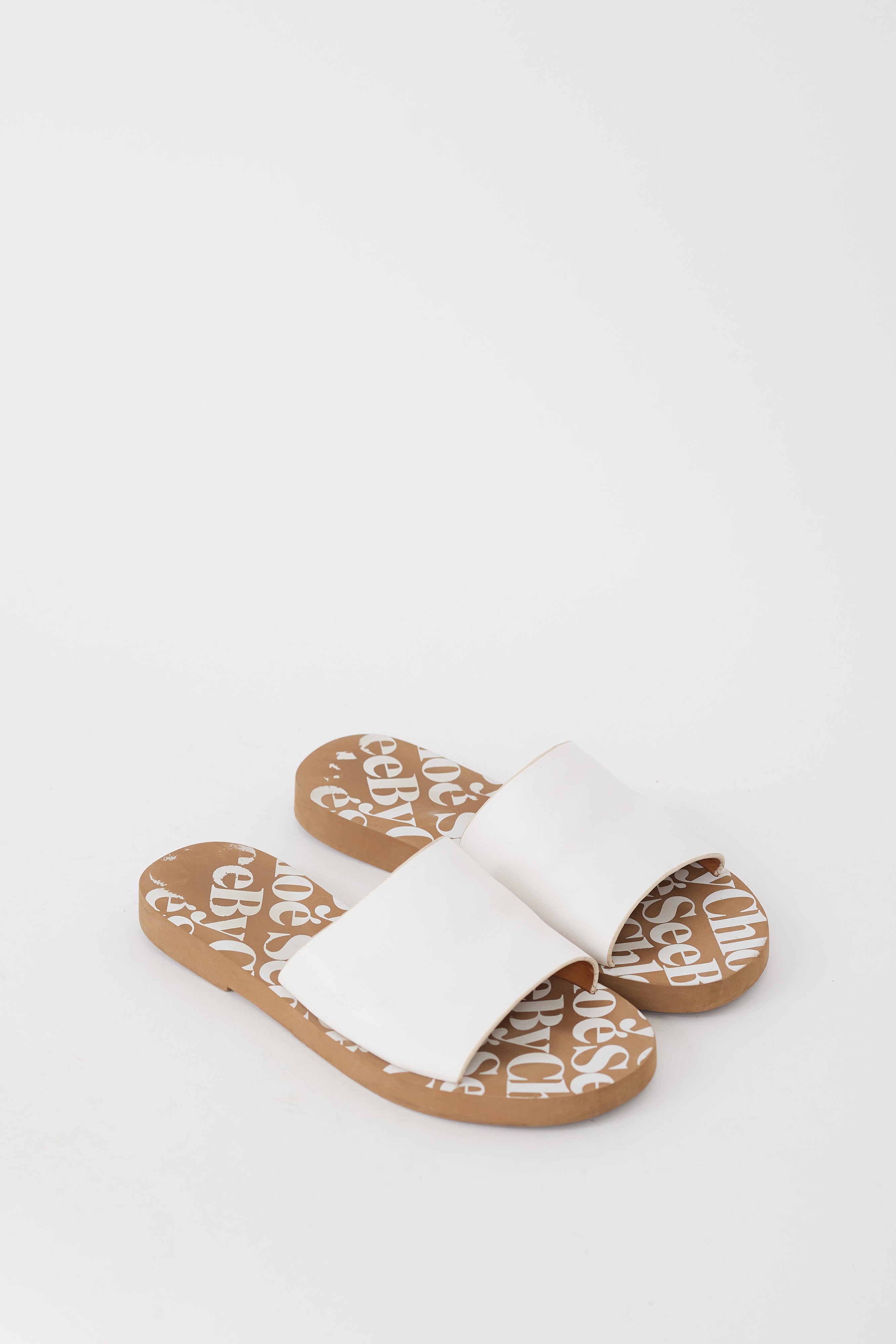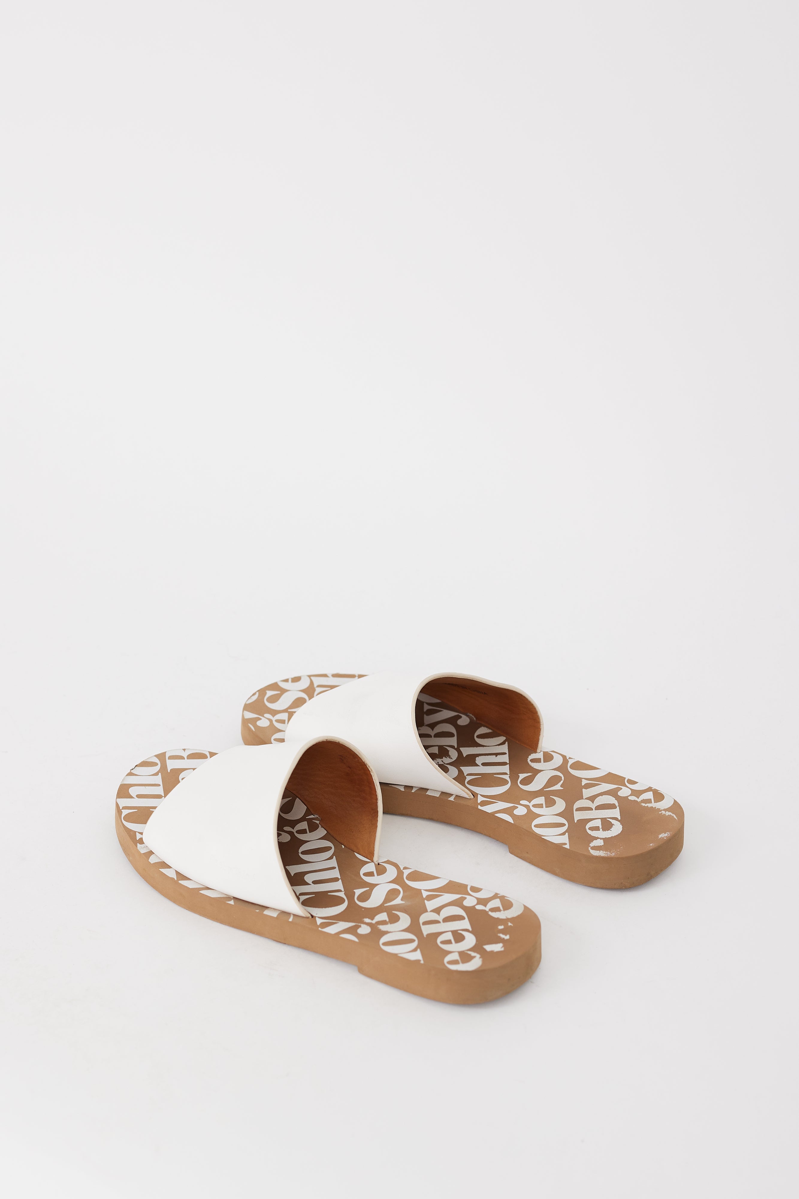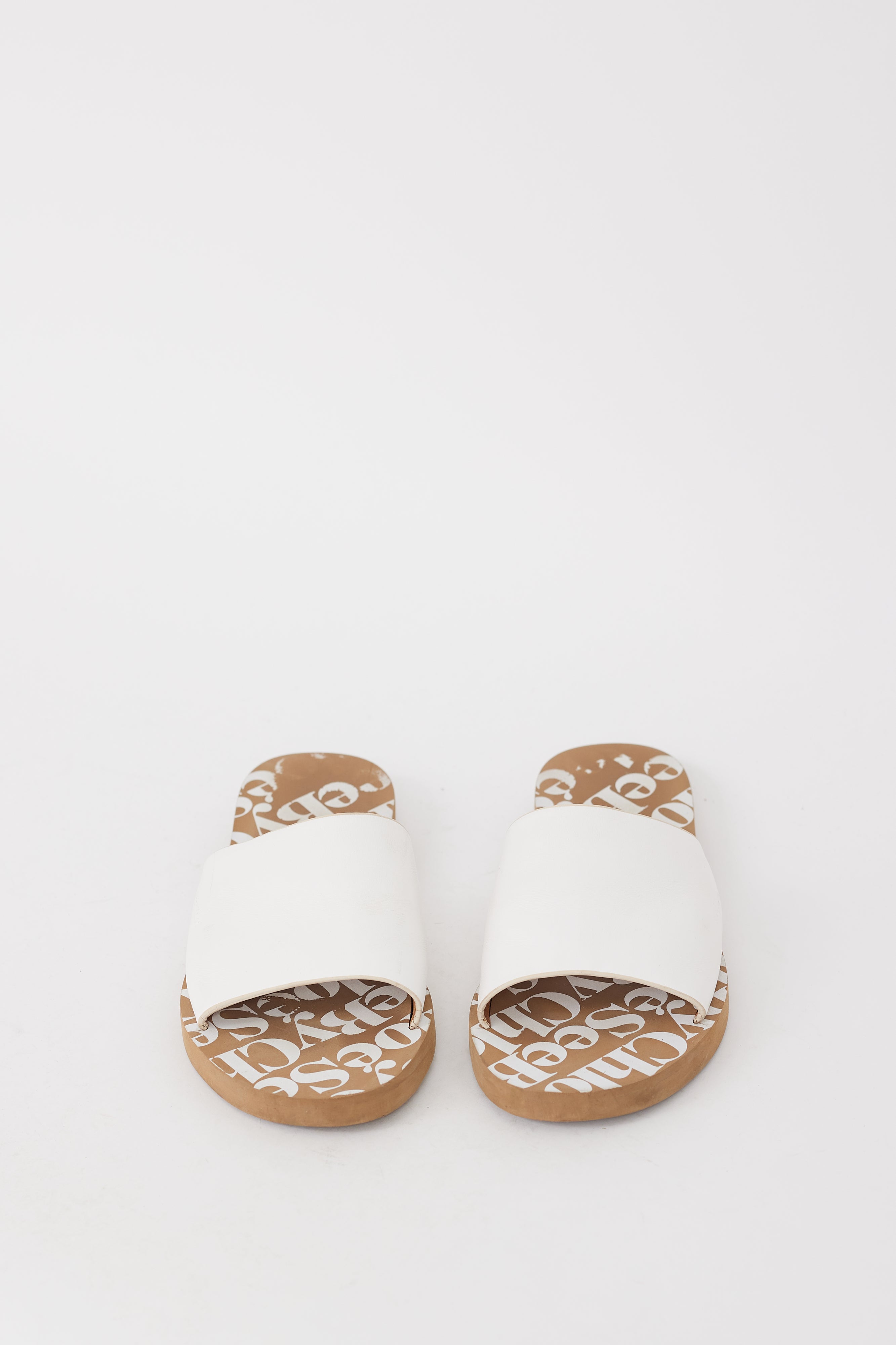 Pre-owned See By Chloé Essie slides featuring an open rounded toe, wide white leather strap across instep, and white printed logo throughout brown rubber sole.