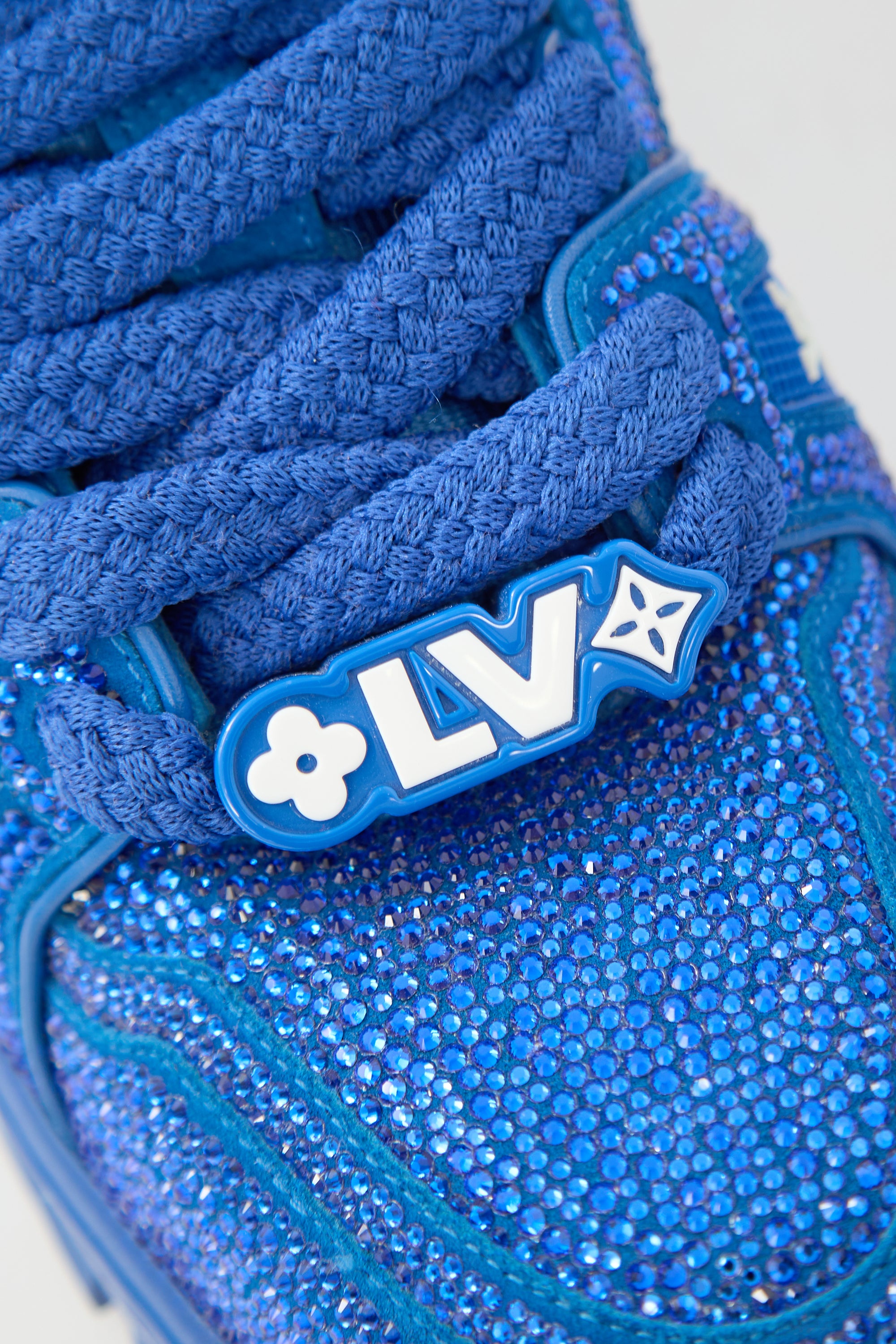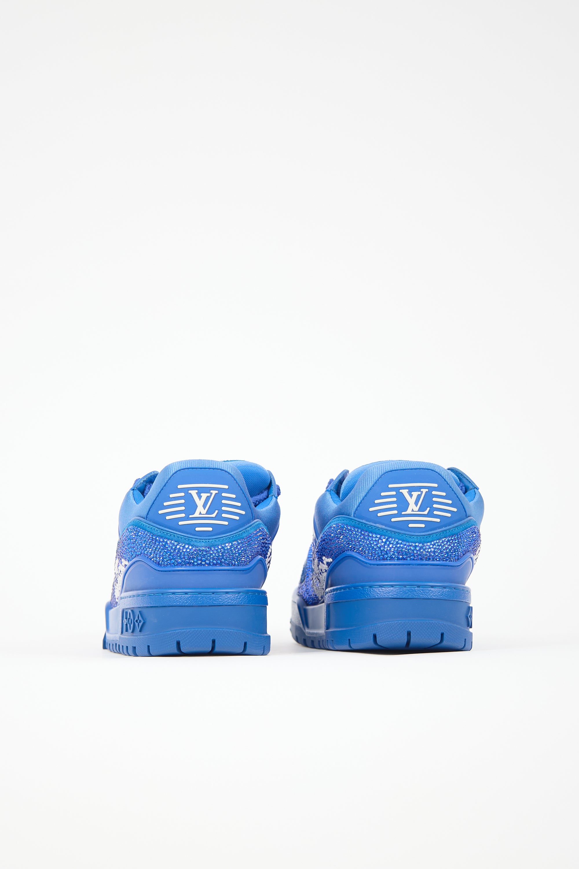 Pre-owned Louis Vuitton blue crystal LV Trainer sneakers featuring rounded toe, Pharrell Williams' initial at outer side, lace up front with logo charm, and logo at front and side. Pharrell Williams era design.