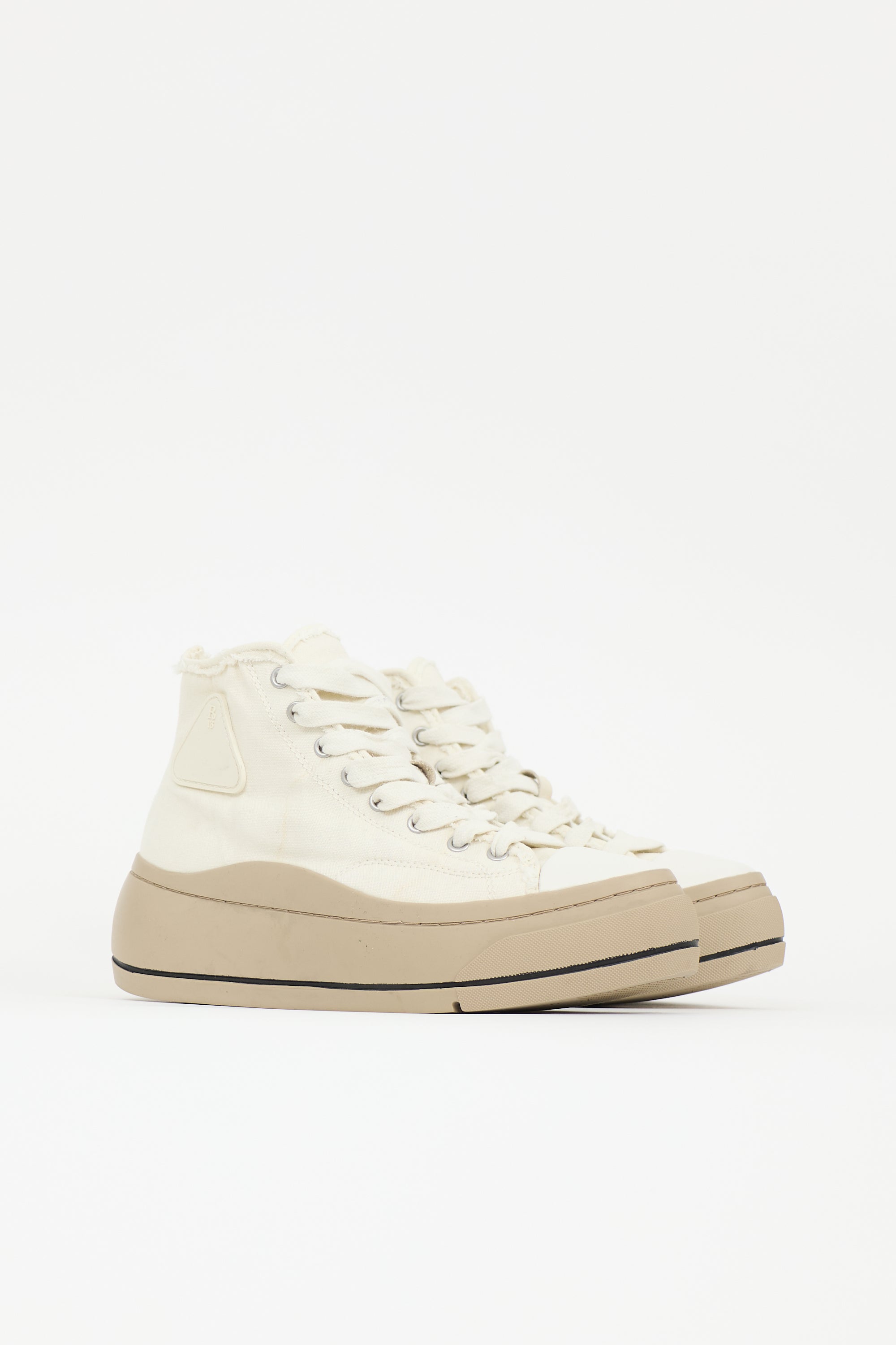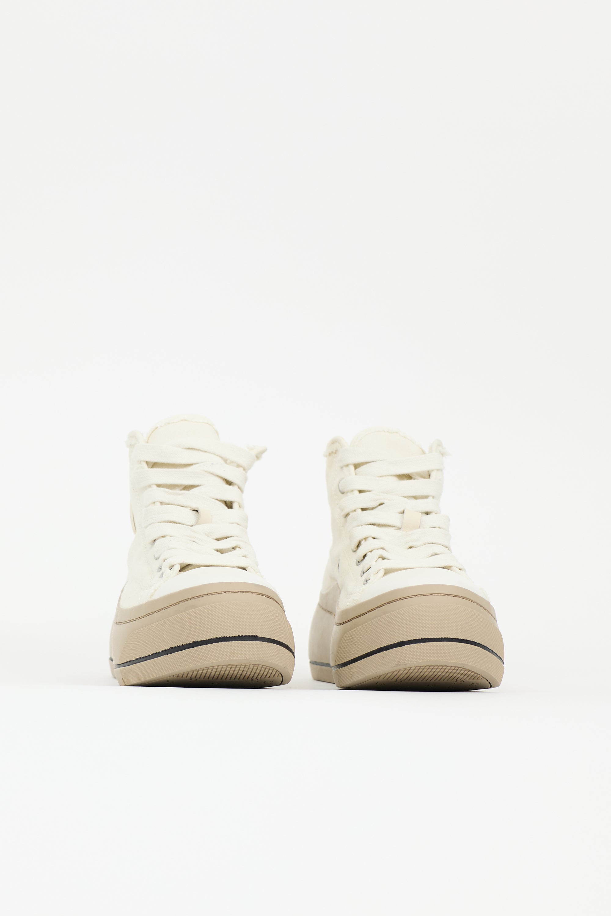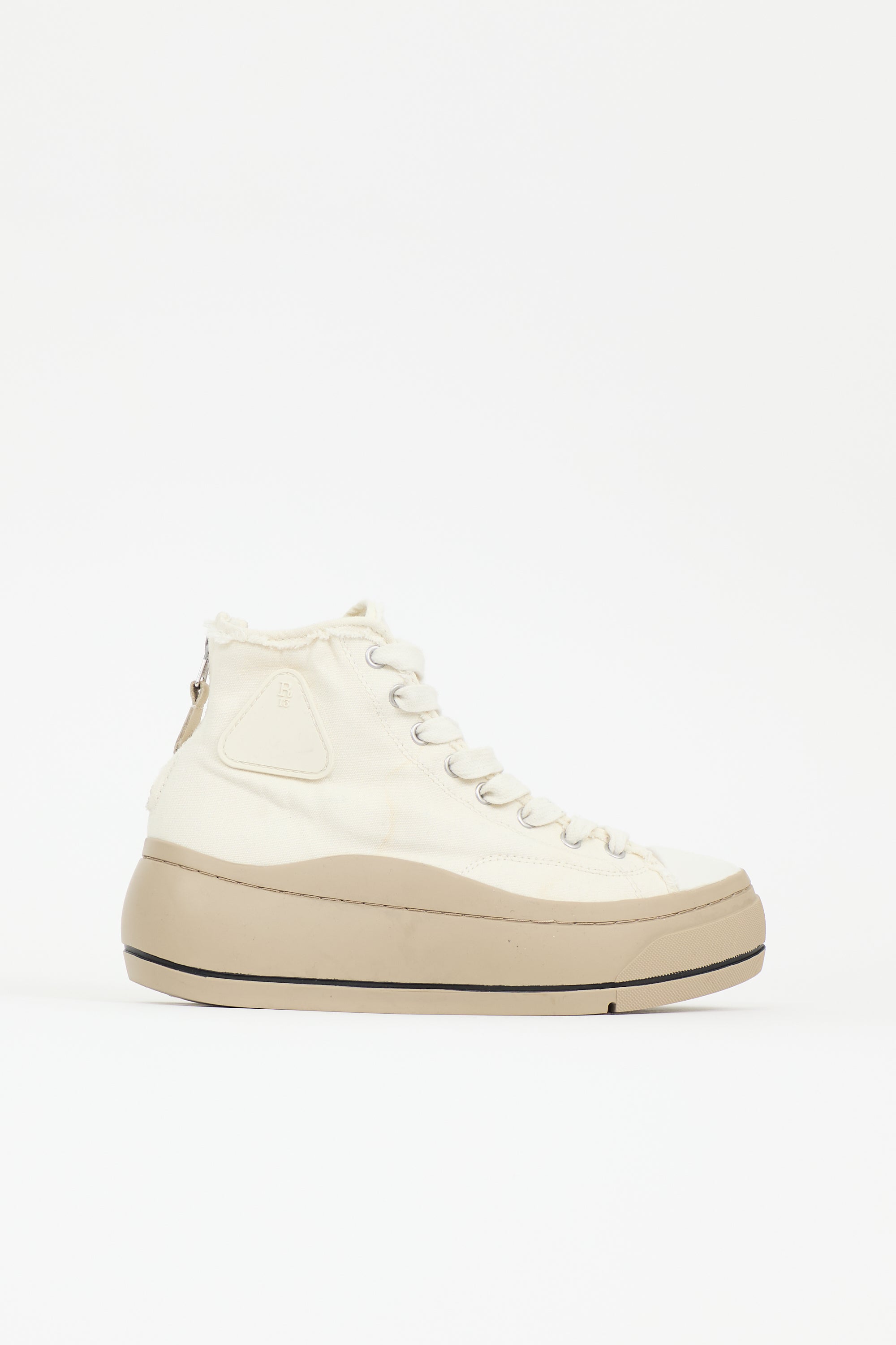 Pre-owned R13 white canvas Kurt sneakers featuring rounded toe, lace up front, zip closure at back, and rubber platform sole.