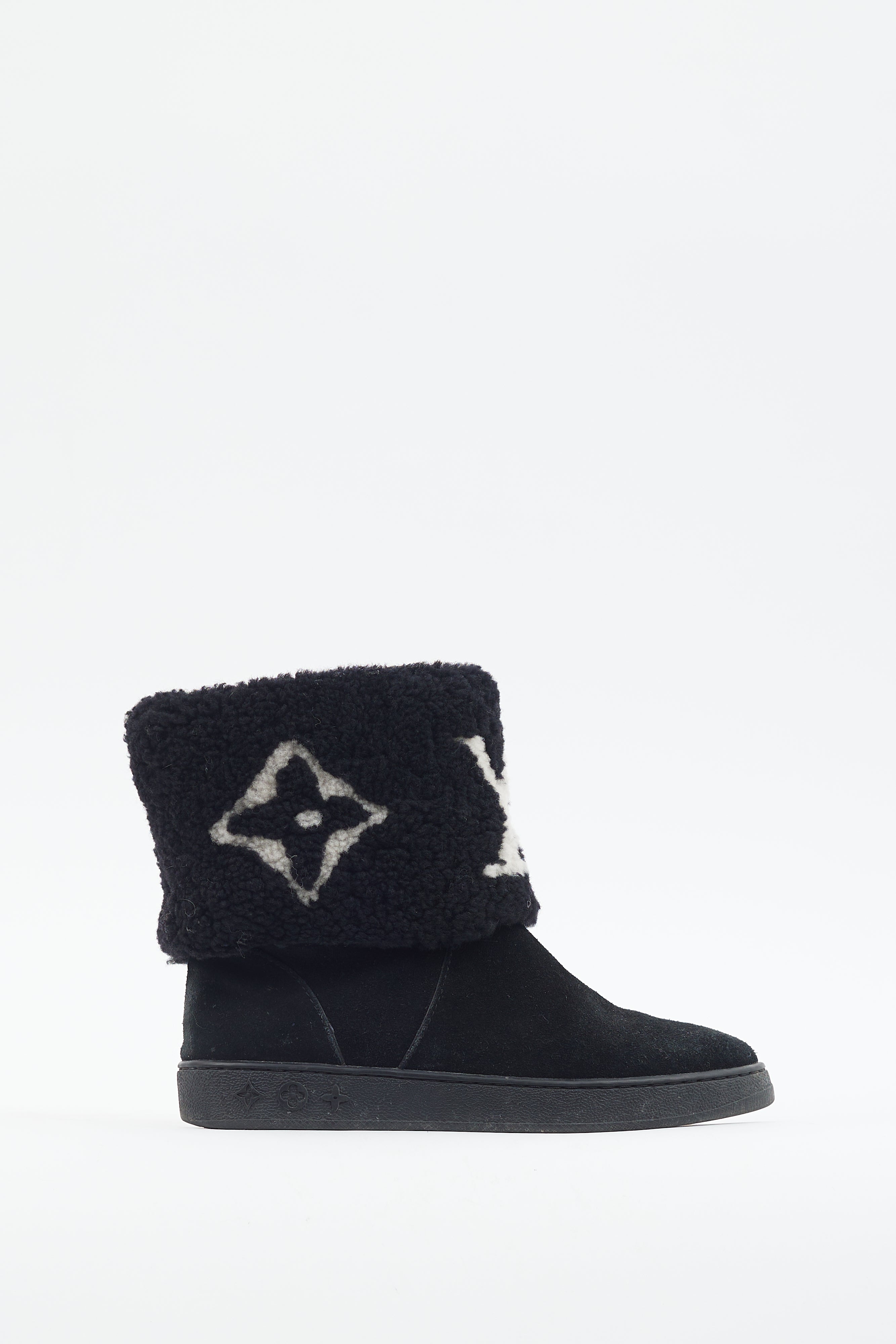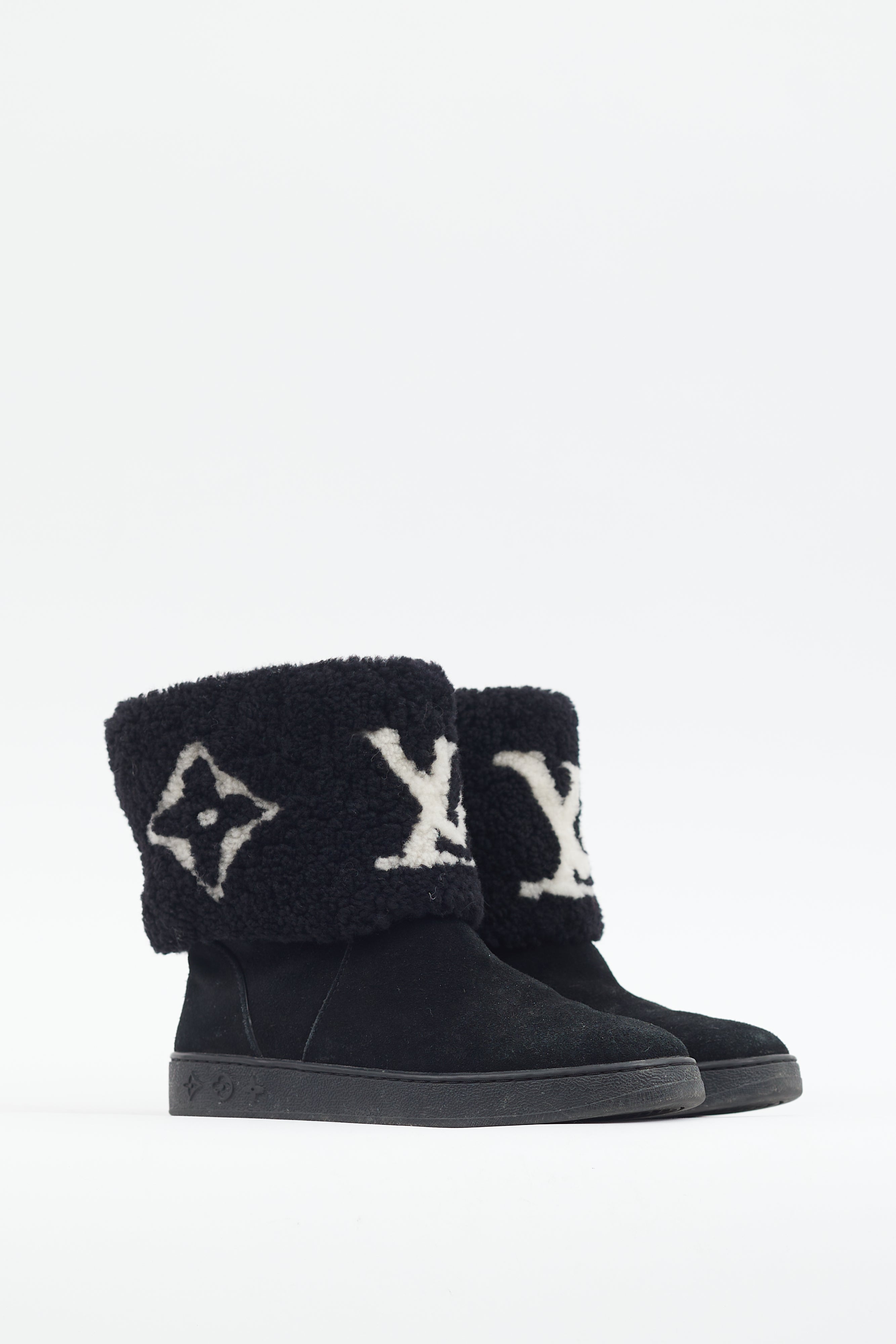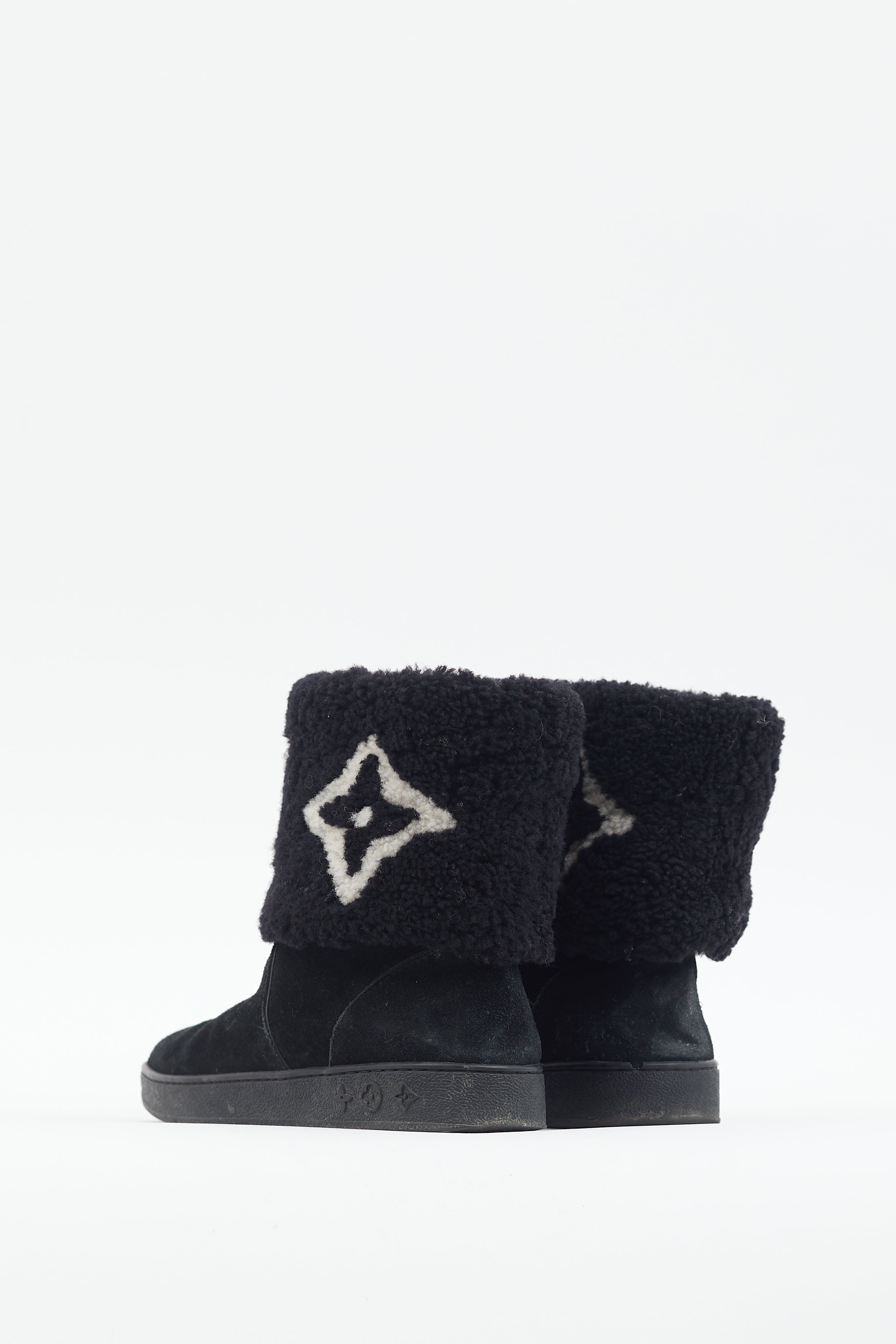 Pre-owned Louis Vuitton black suede boots featuring a rounded toe, folded sherpa shaft with white logo intarsia, and rubber sole with embossed logo.