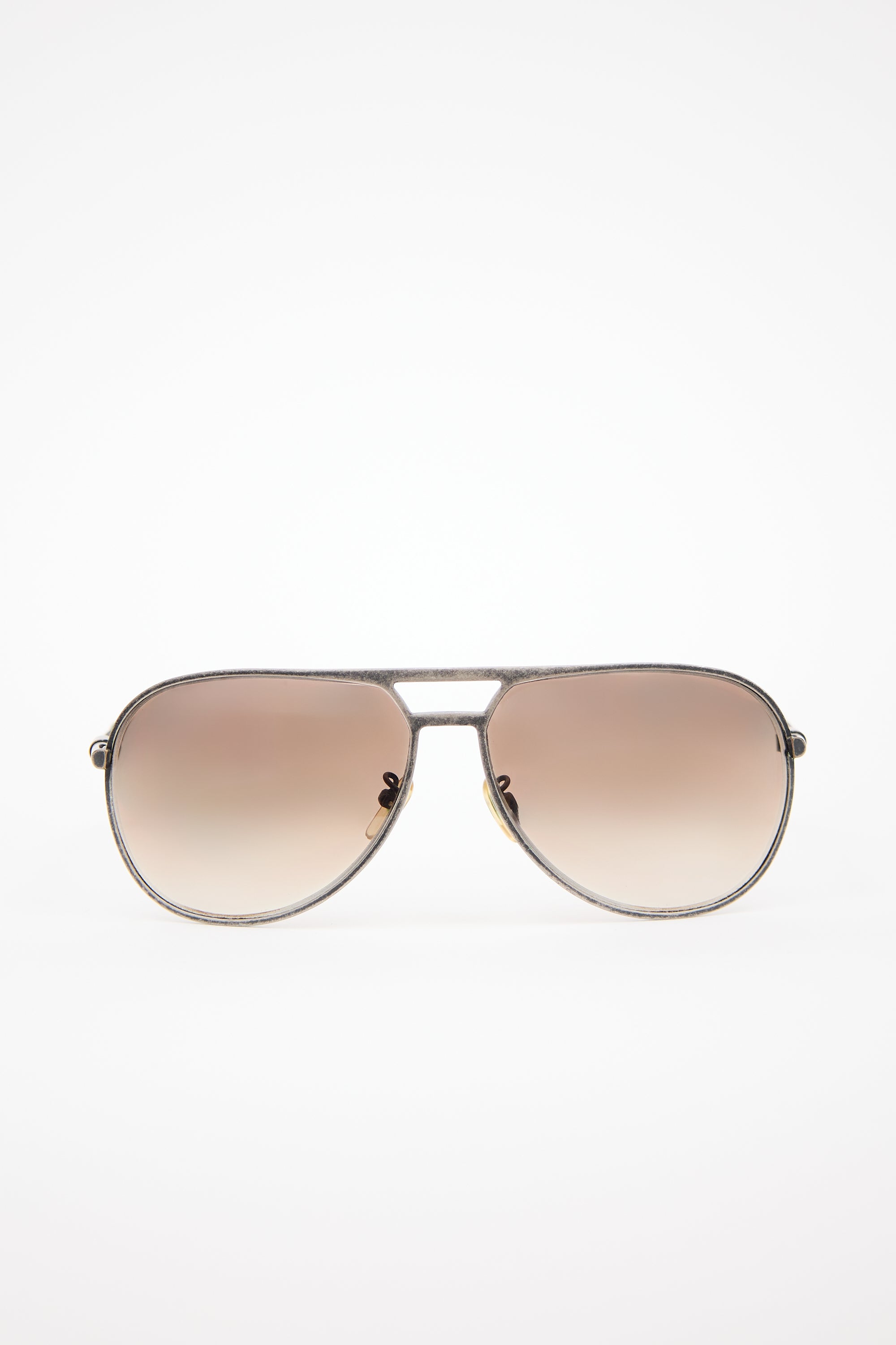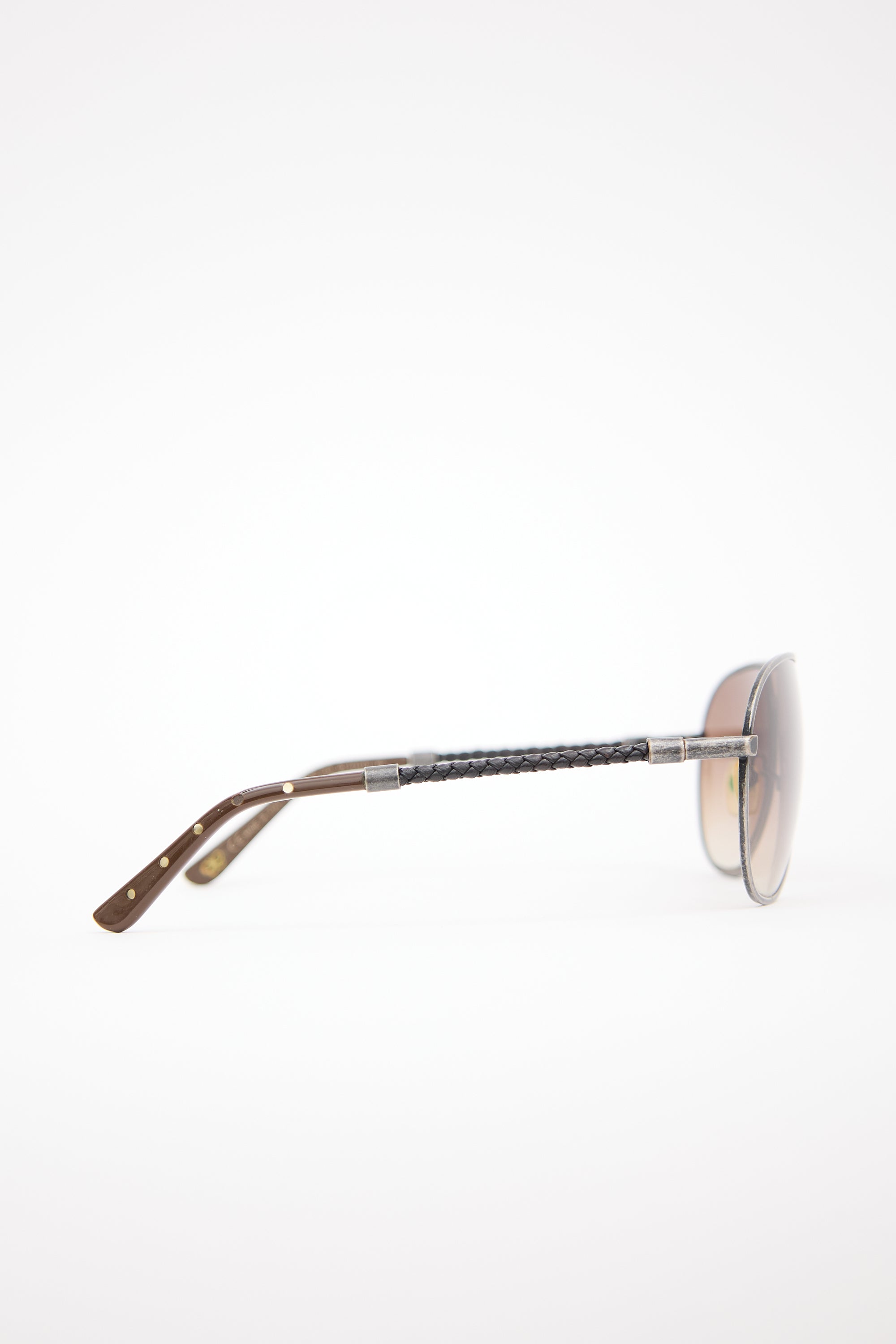 Pre-owned Bottega Veneta grey BV102FS sunglasses featuring grey gradient tinted lenses, wire Aviator frame, and signature brown leather Intrecciato detail at temples. Comes with original case.