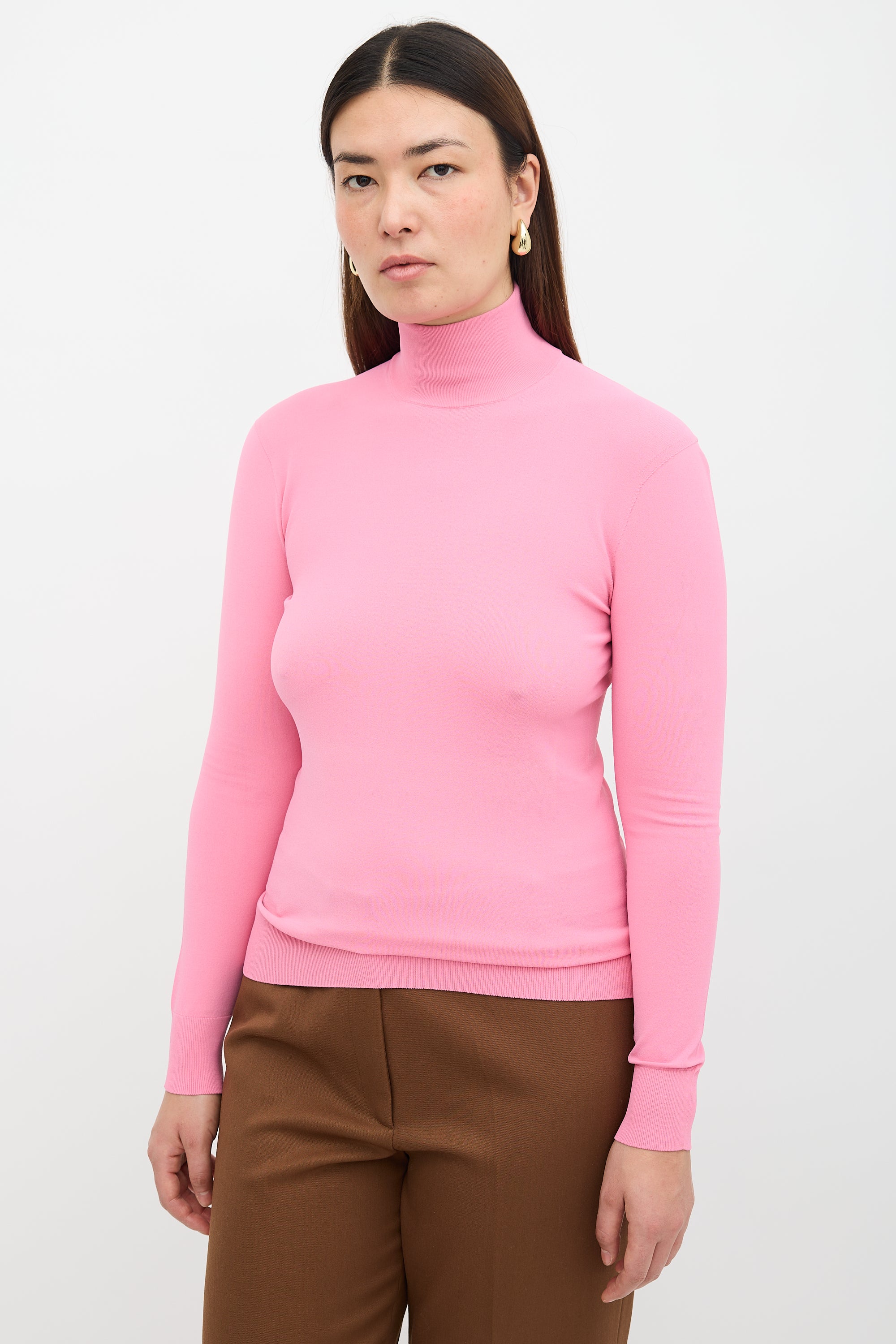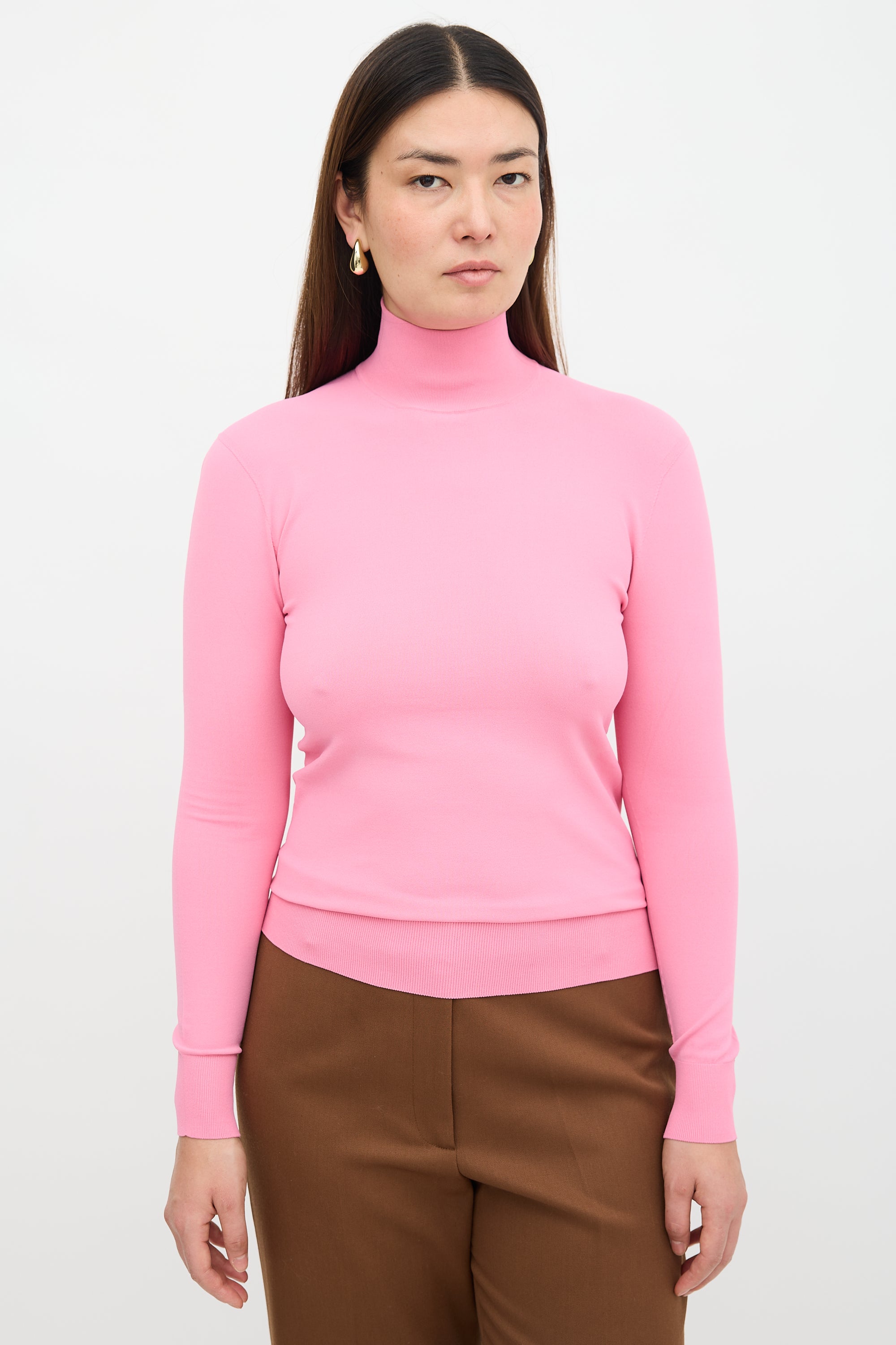 Bottega Veneta Pre Fall 2020 pink Technoskin knit sweater featuring a turtleneck, long sleeves, and ribbed hem.