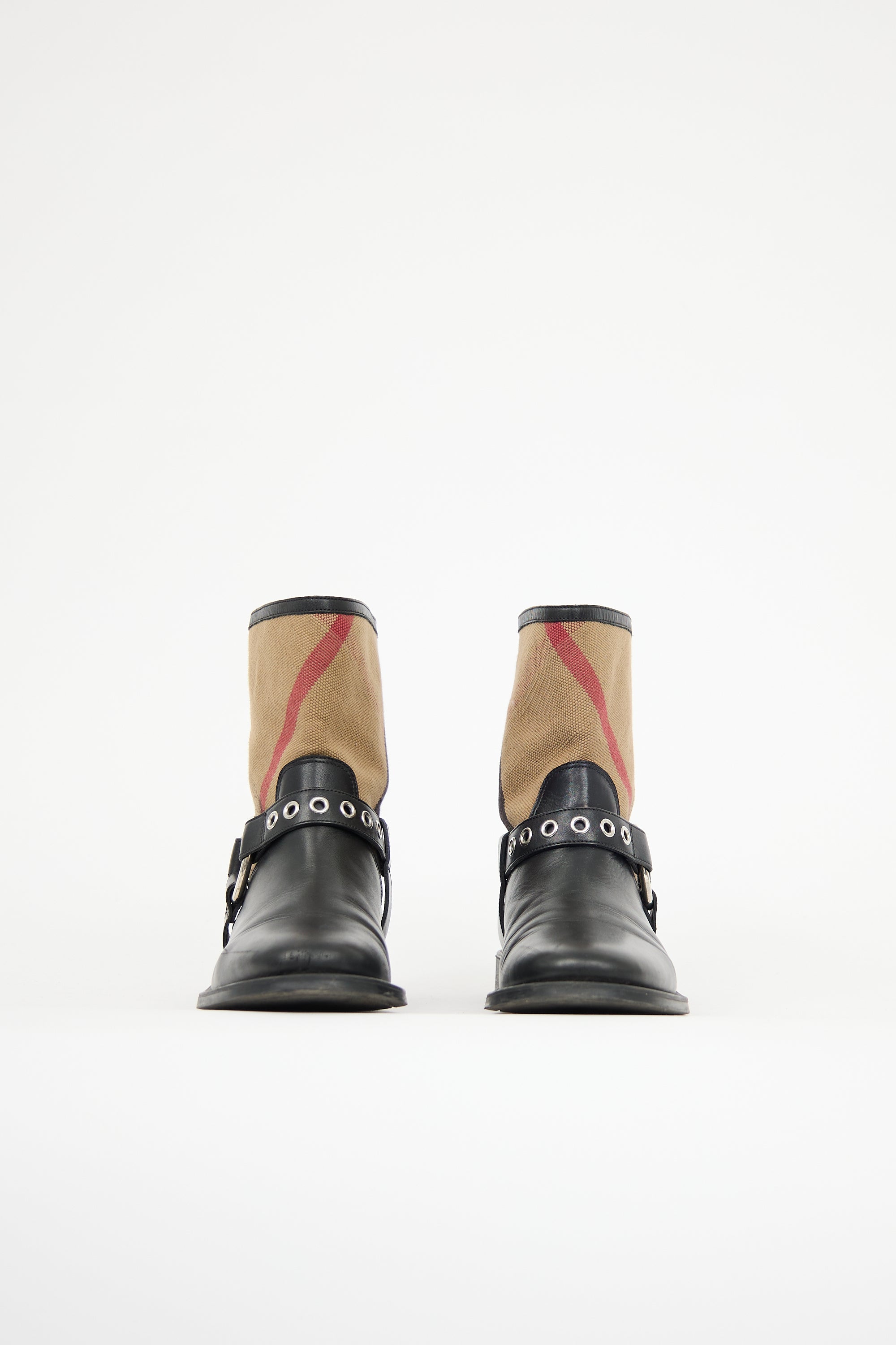 Pre-owned Burberry black leather Queenstead boots featuring a rounded toe, harness detail at vamp, signature Check canvas upper, and silver tone logo plaque at counter.