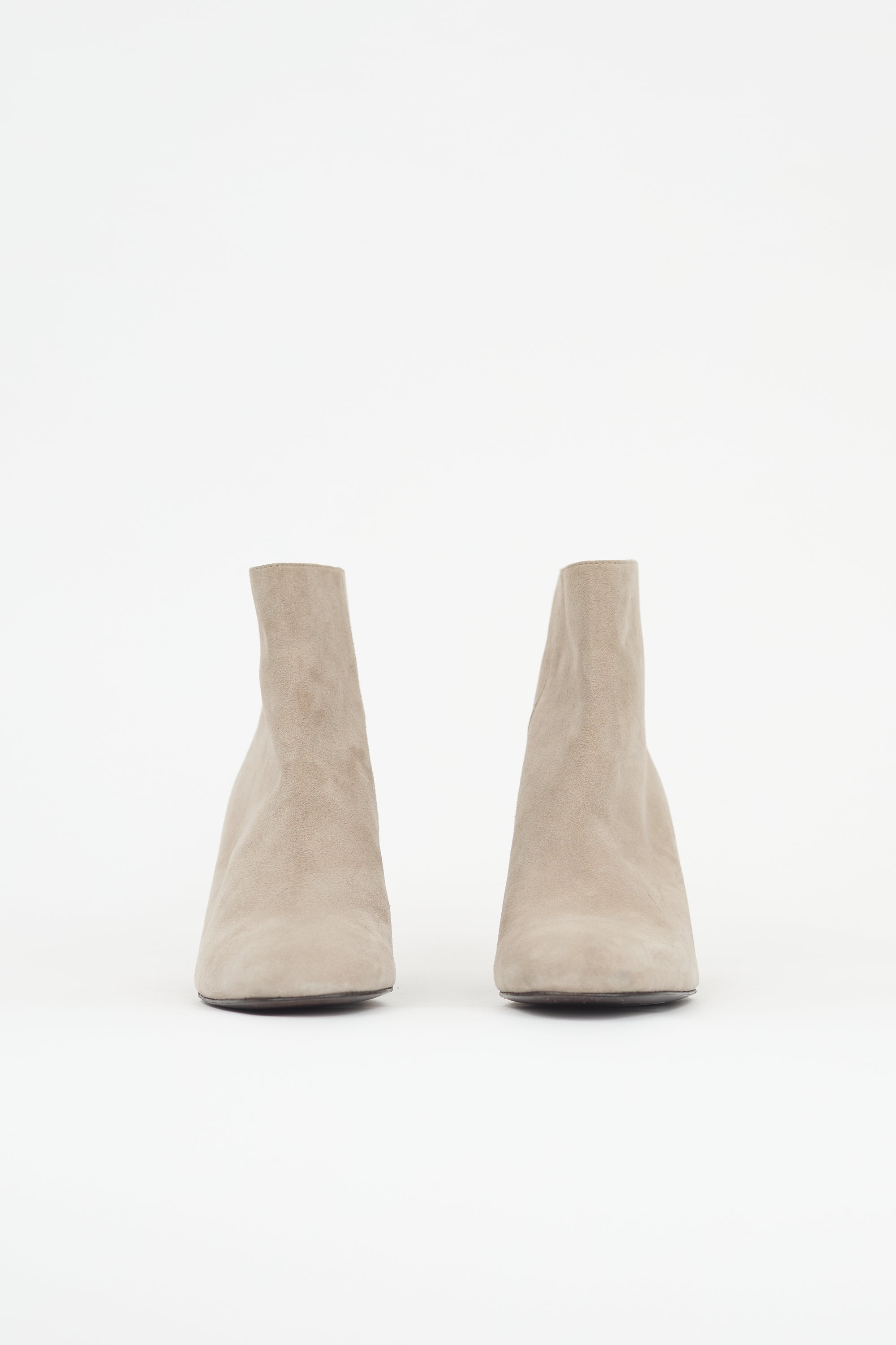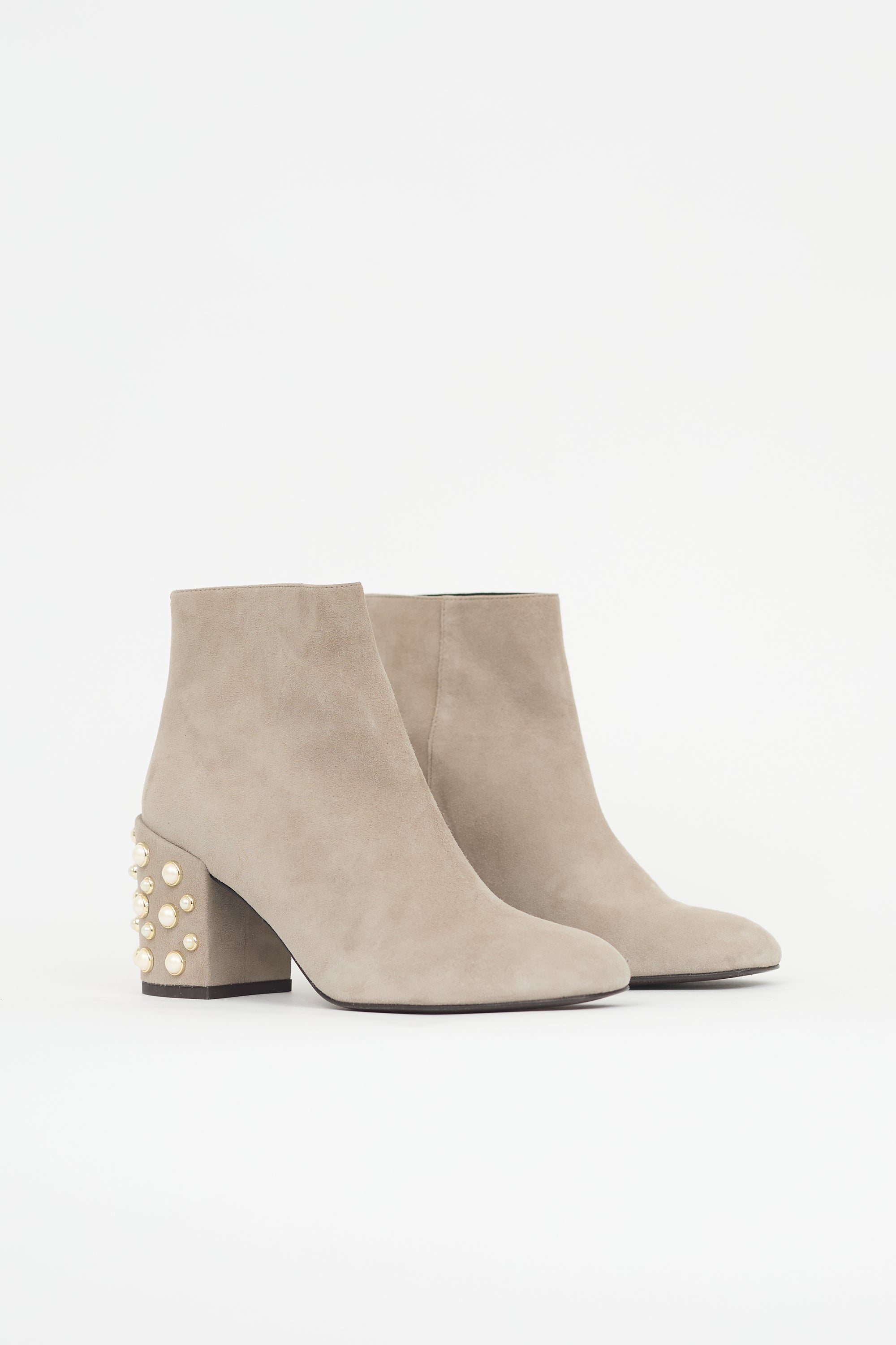 Pre-owned Stuart Weitzman grey suede Bacari boots featuring rounded toe, zip closure at back, and covered block heel with pearl embellishment.