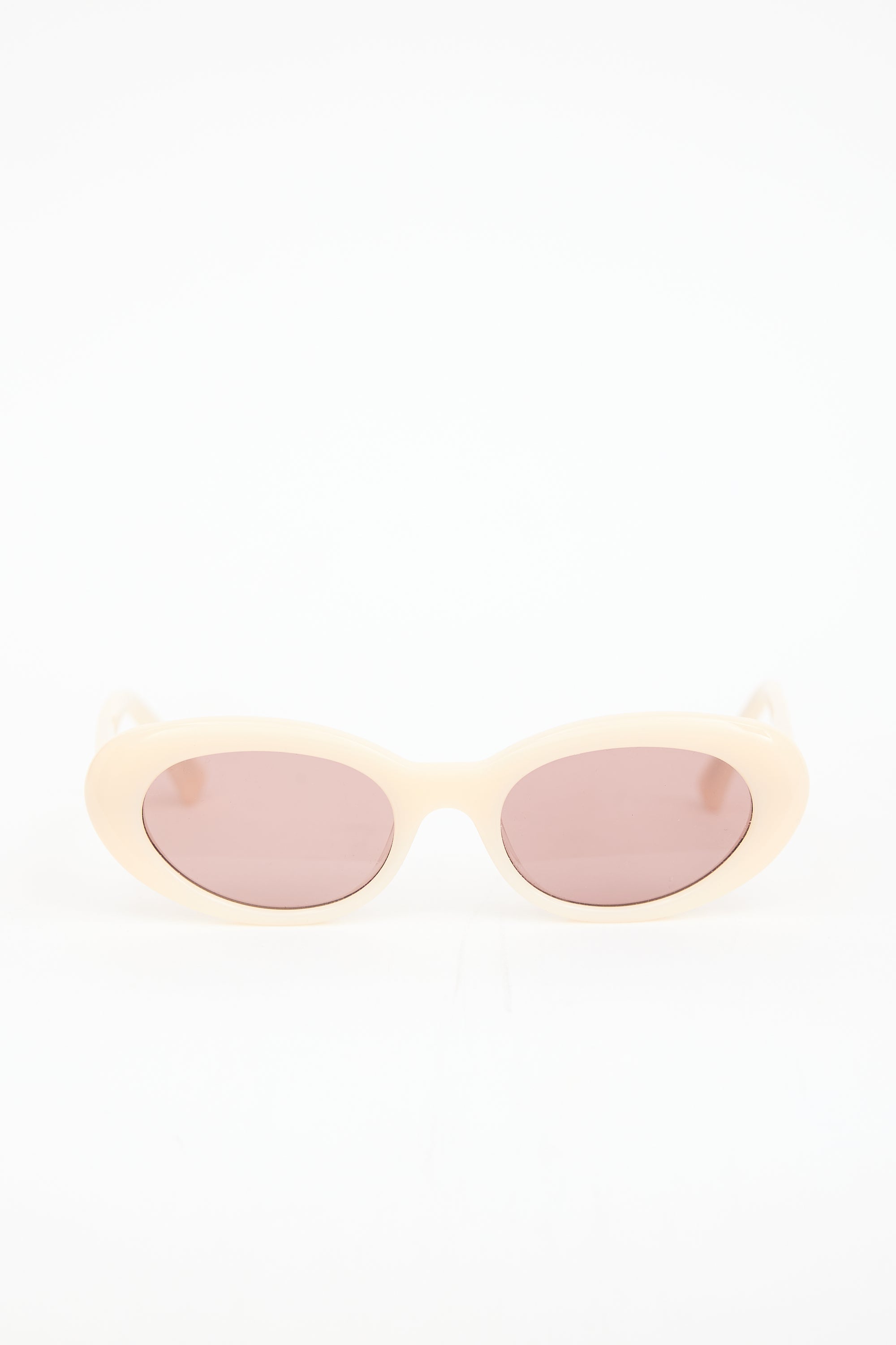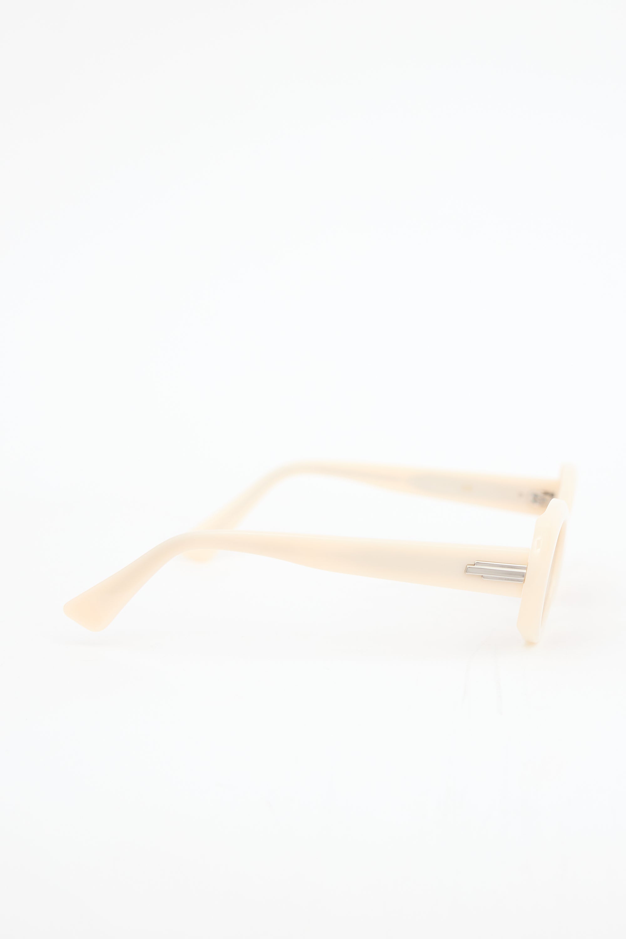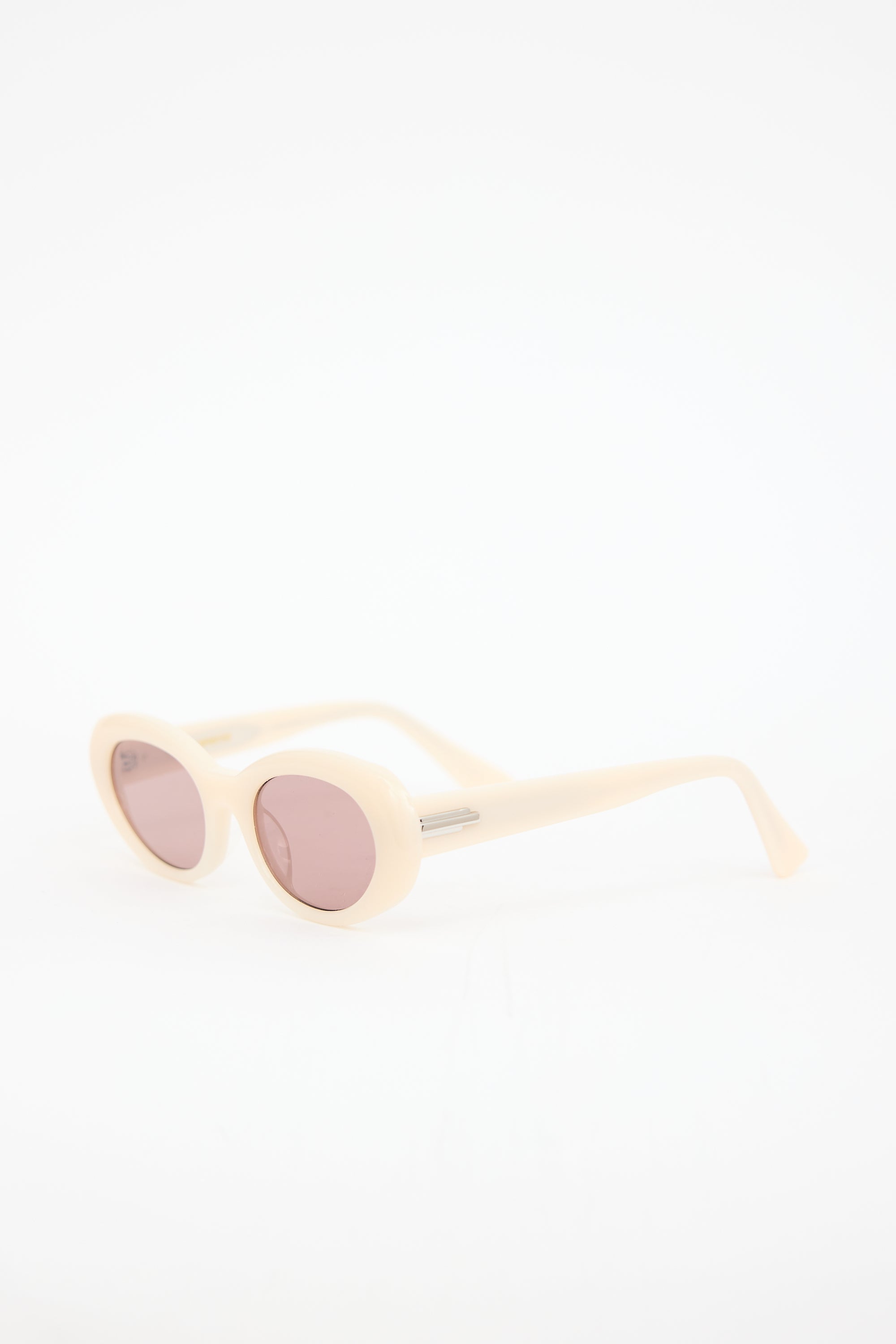 Pre-owned Gentle Monster LE 01 sunglasses featuring brown tinted lenses, nose saddle bridge, cream oval frame, and silver tone embellishment at temples. Comes with original case.