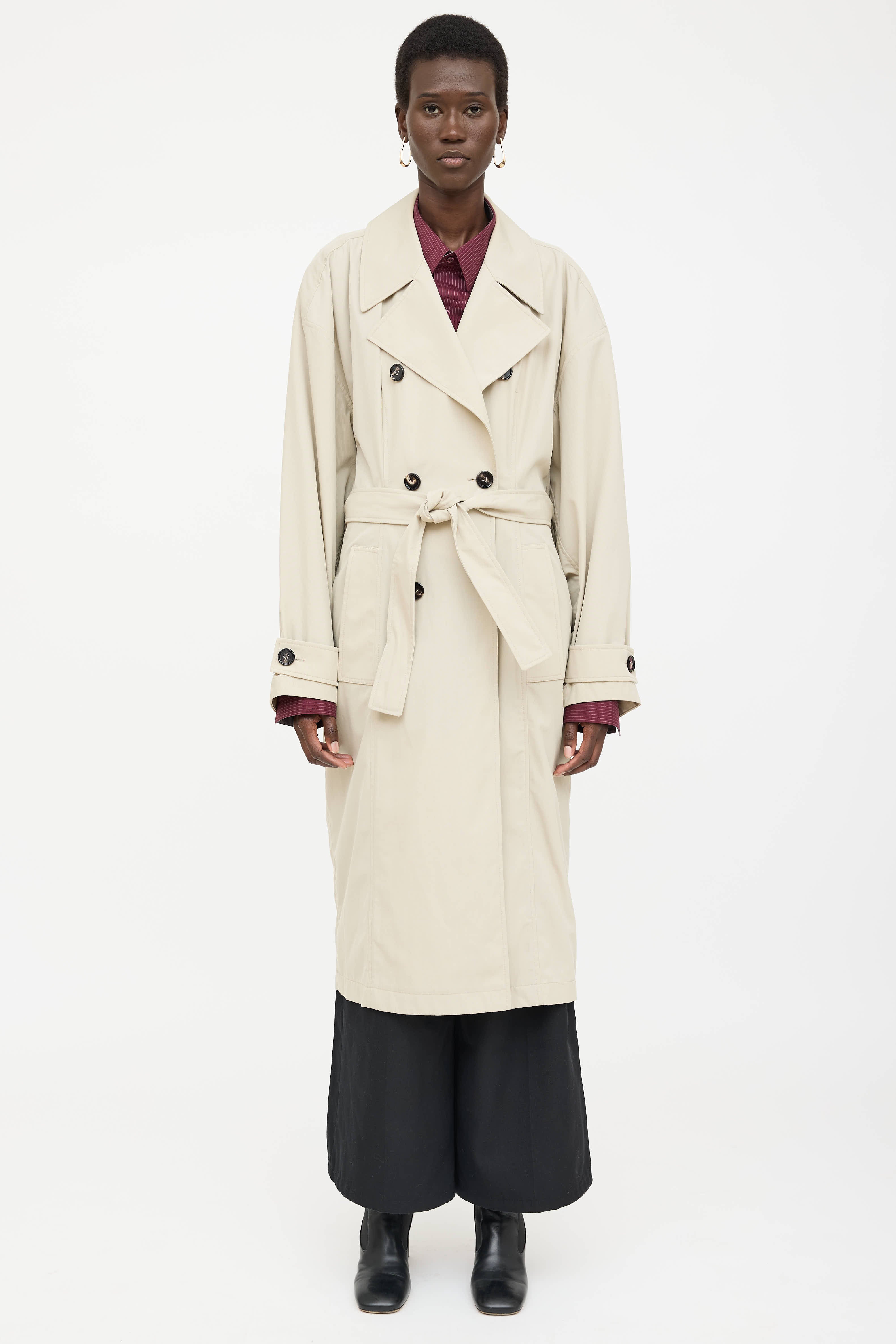 Bottega Veneta beige trench coat featuring a notched collar, short batwing sleeves, two slip pockets at hip, adjustable belt at waist, interior cinch tie, and double breasted button closure.