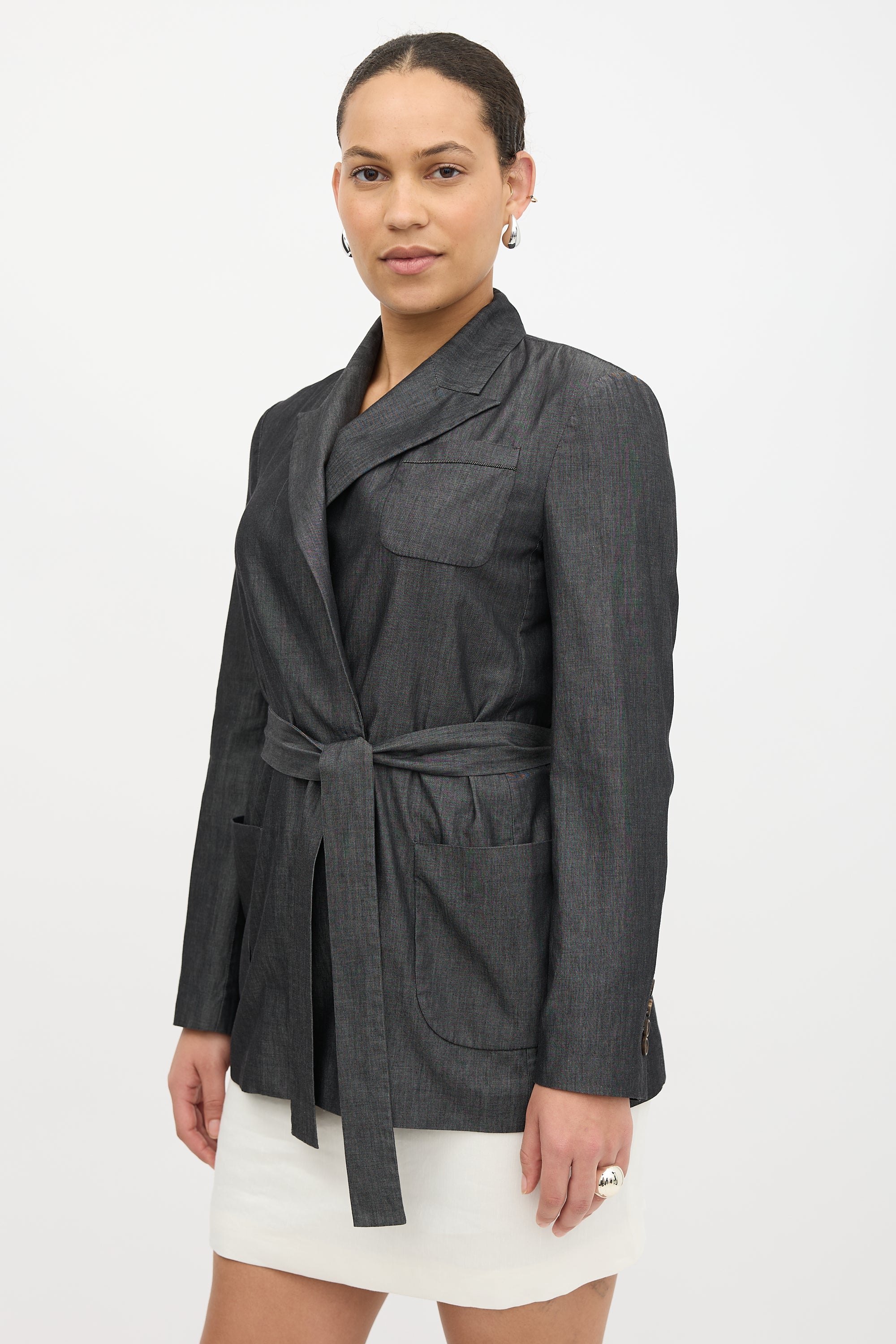 Pre-owned Brunello Cucinelli dark grey chambray blazer featuring peak lapel, concealed double breasted snap button front closure, three front patch pockets, Monili bead trim at chest pocket, back vent, tie waist belt, and buttoned cuffs.