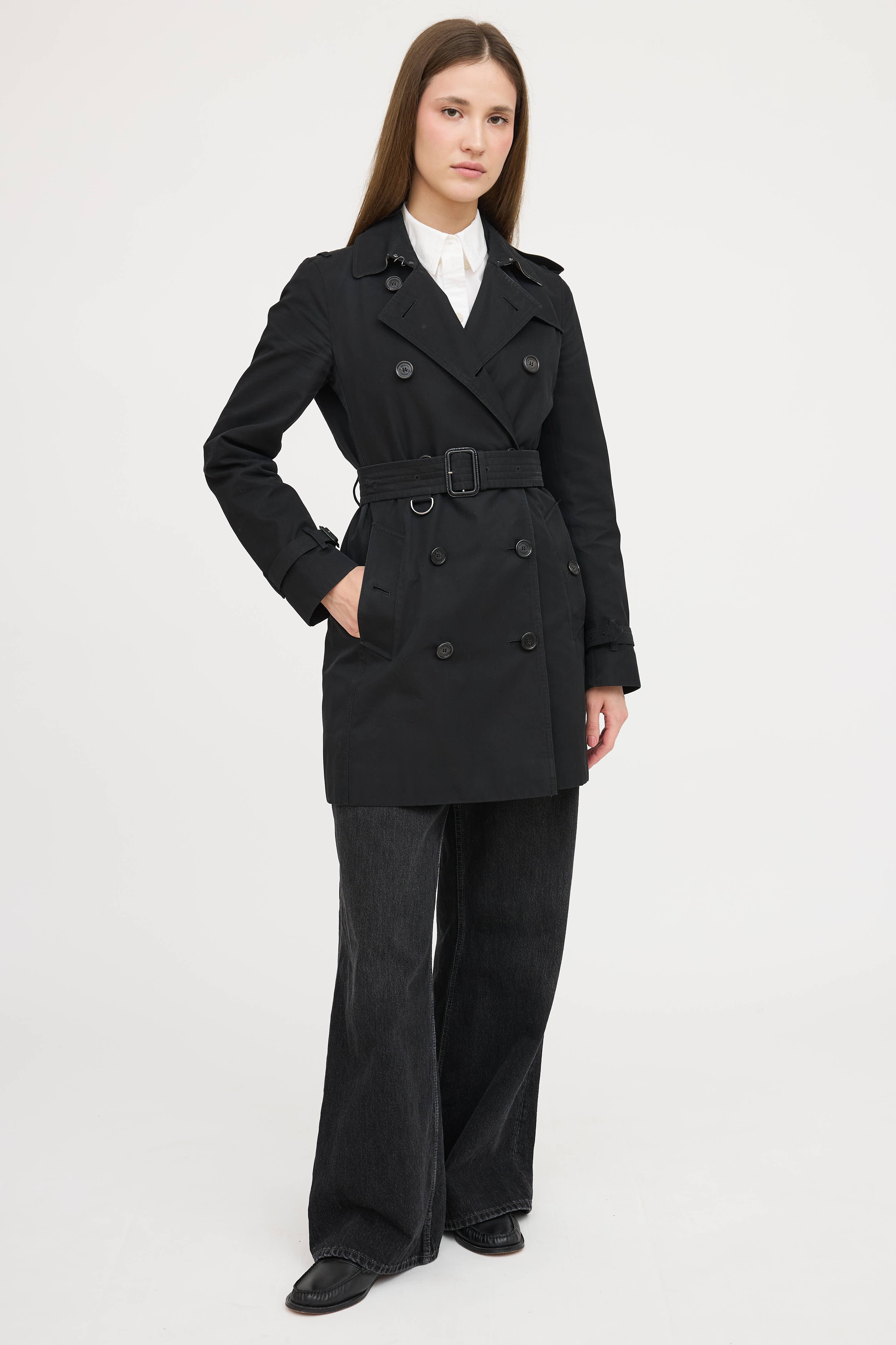 Pre-owned Burberry black cotton trench coat featuring notched lapel collar, epaulettes, double breasted front, adjustable strap at cuffs, slit pockets at side, and adjustable belt at waist.