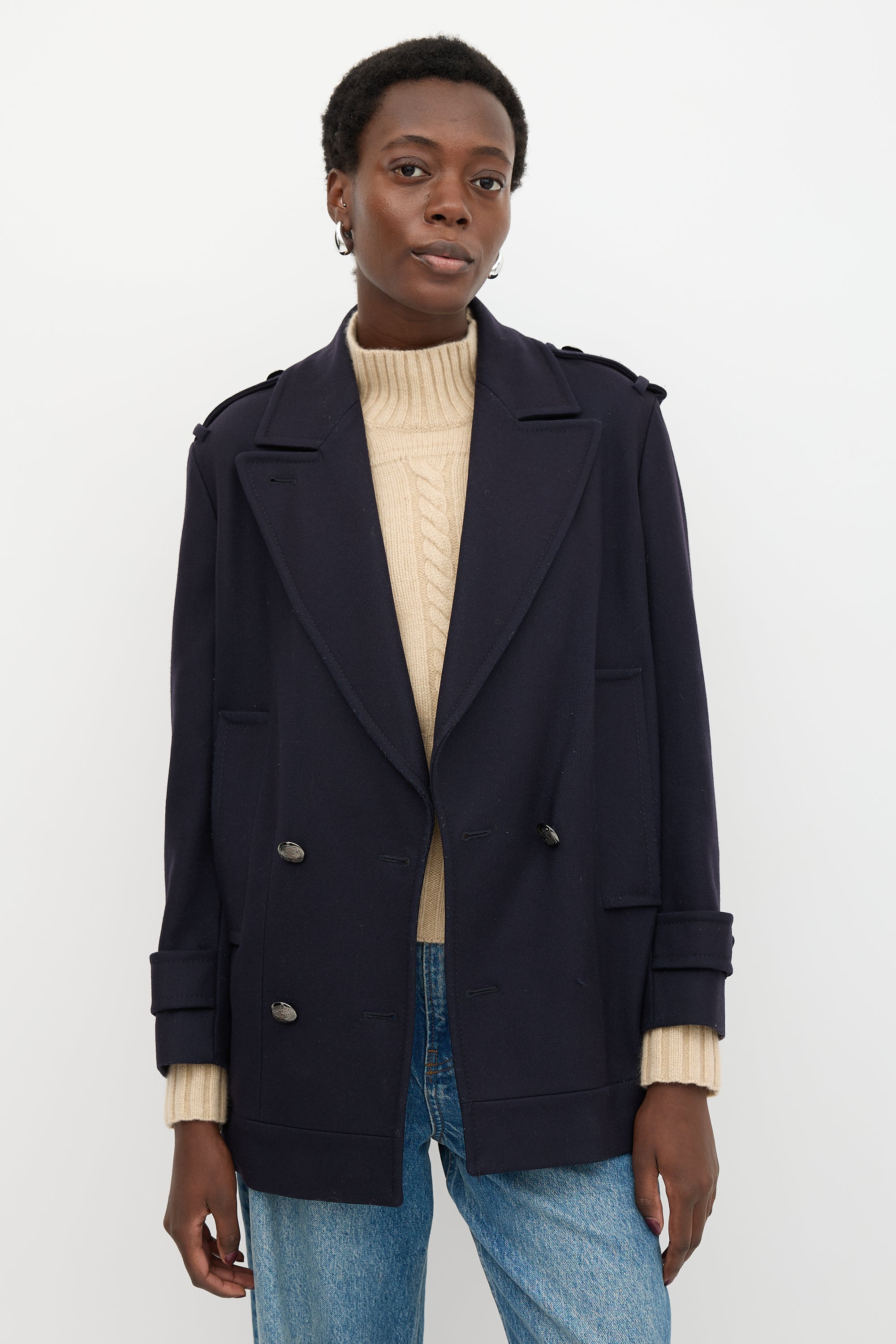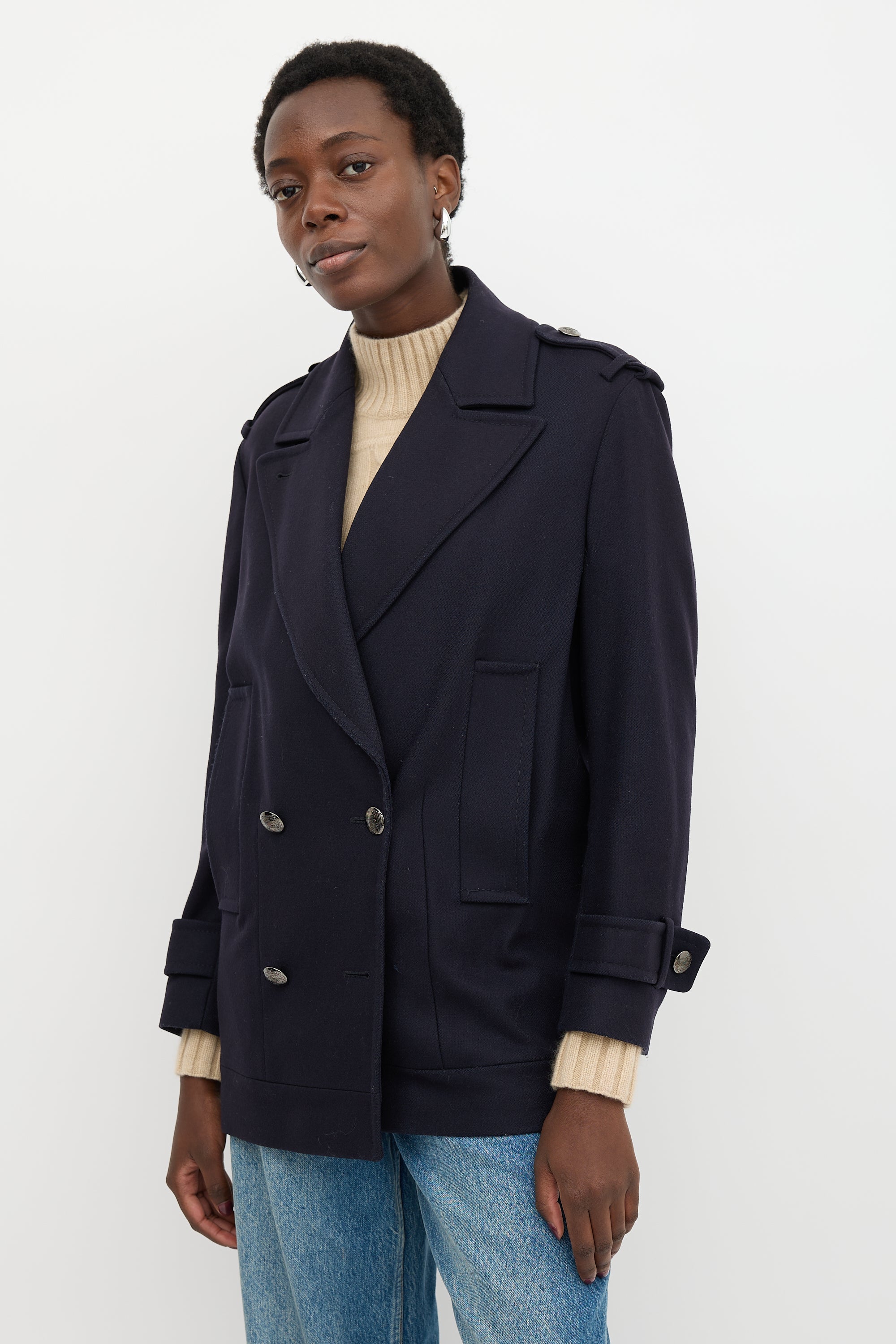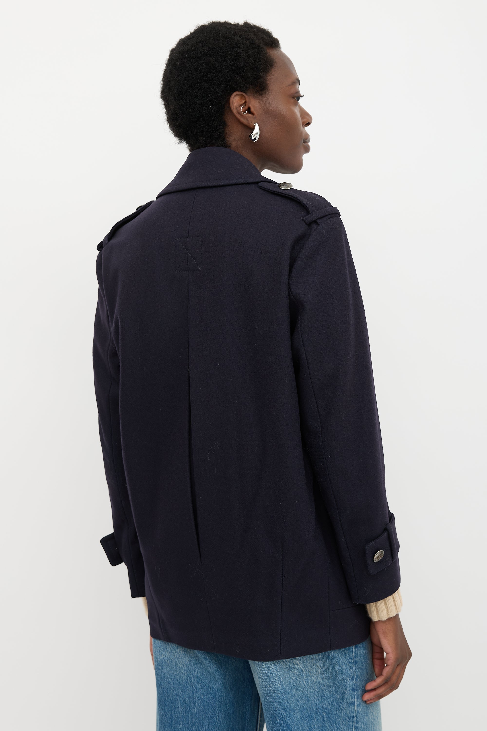 Pre-owned Burberry navy wool blend jacket featuring wide peak lapels, double breasted front, epaulettes, welt pockets, and pleated back. Lined.