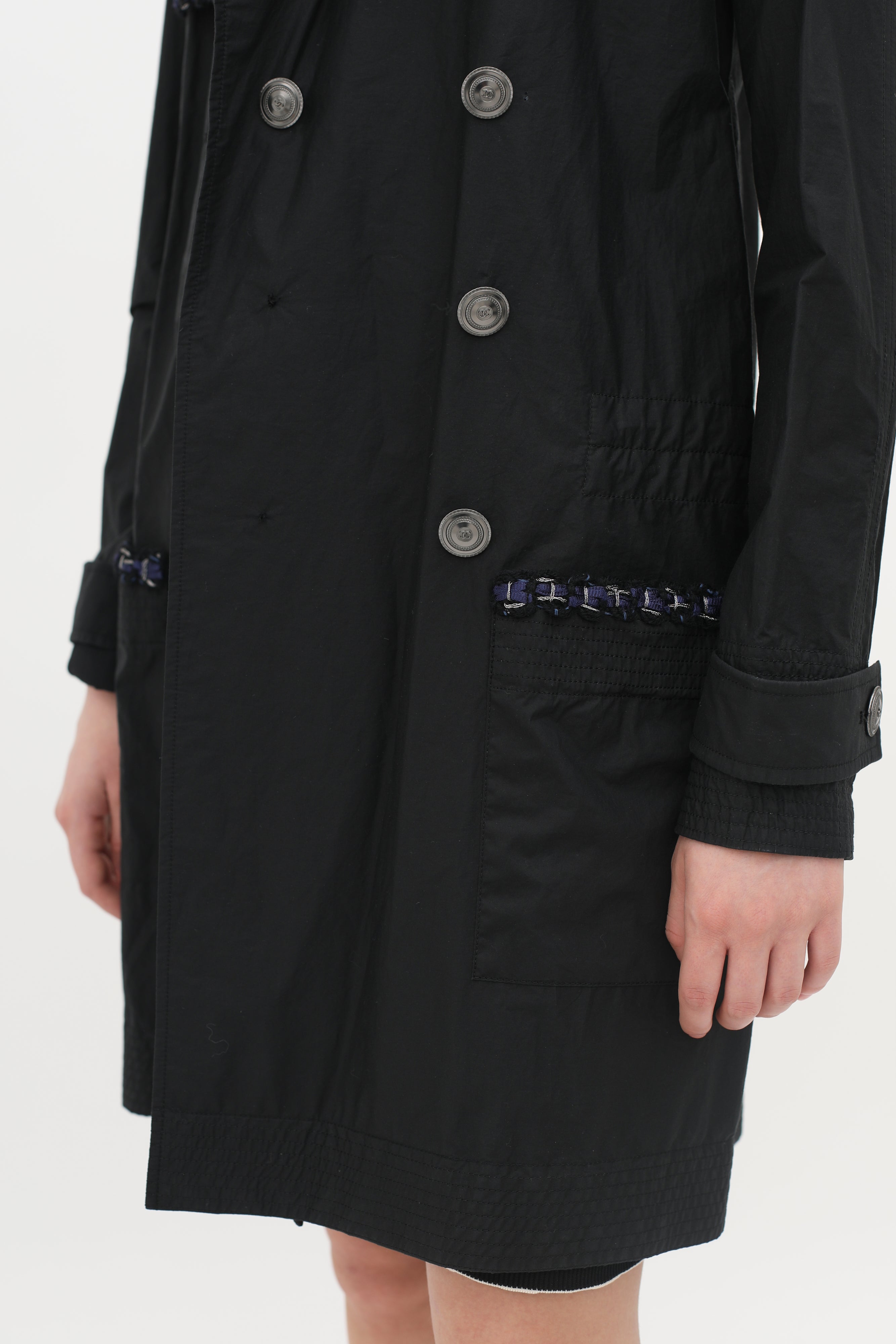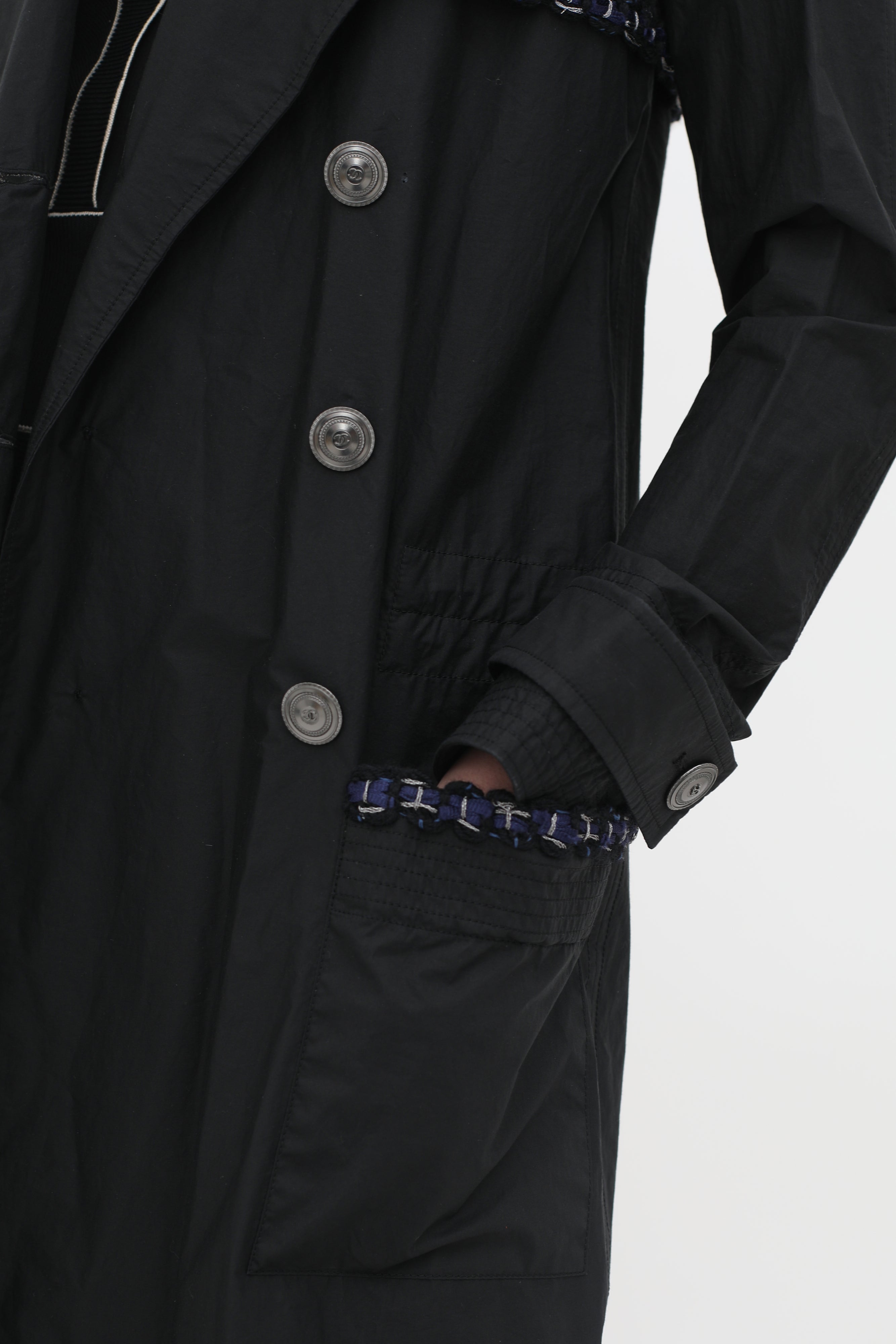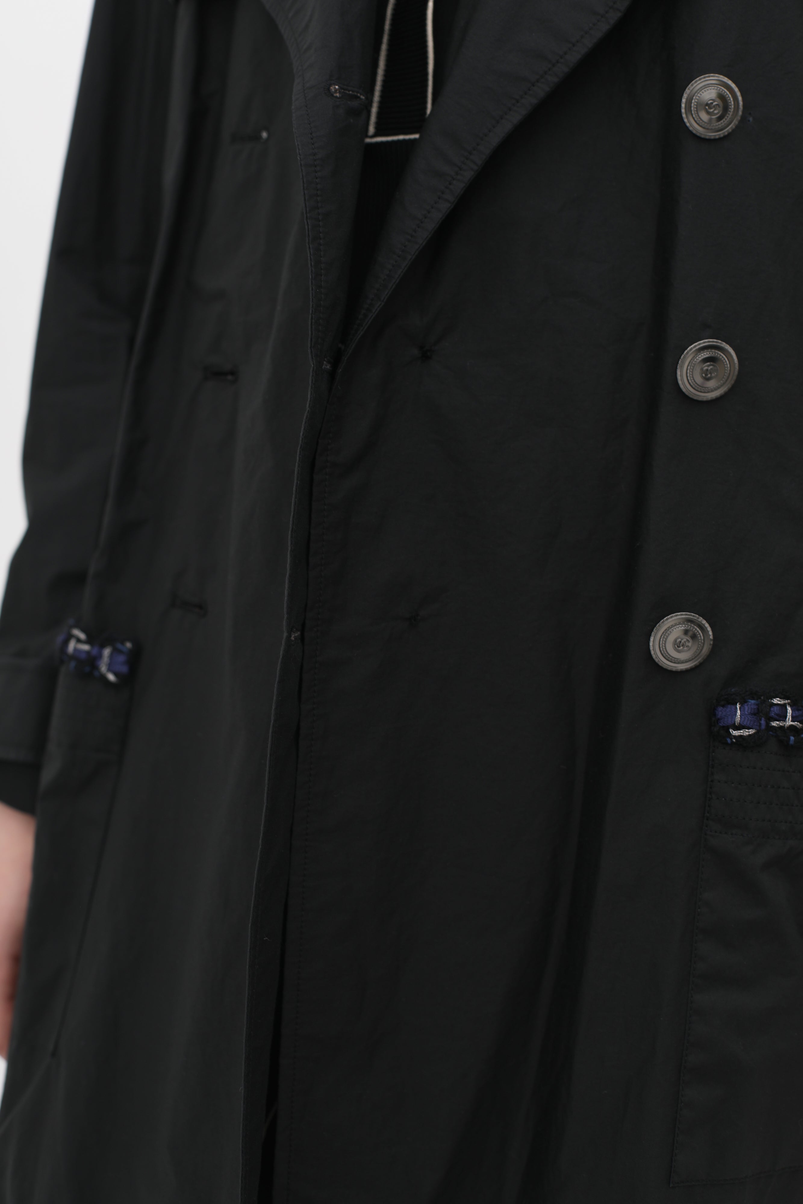 Pre-owned Chanel black raincoat in classic double breasted trench style, button-front closure in silver-toned logo embossed hardware, blue and metallic silver-toned woven trim at pockets, back, and chest, buttoned strap cuffs, rounded lapel collar, two front patch pockets, concealed waist drawstring.