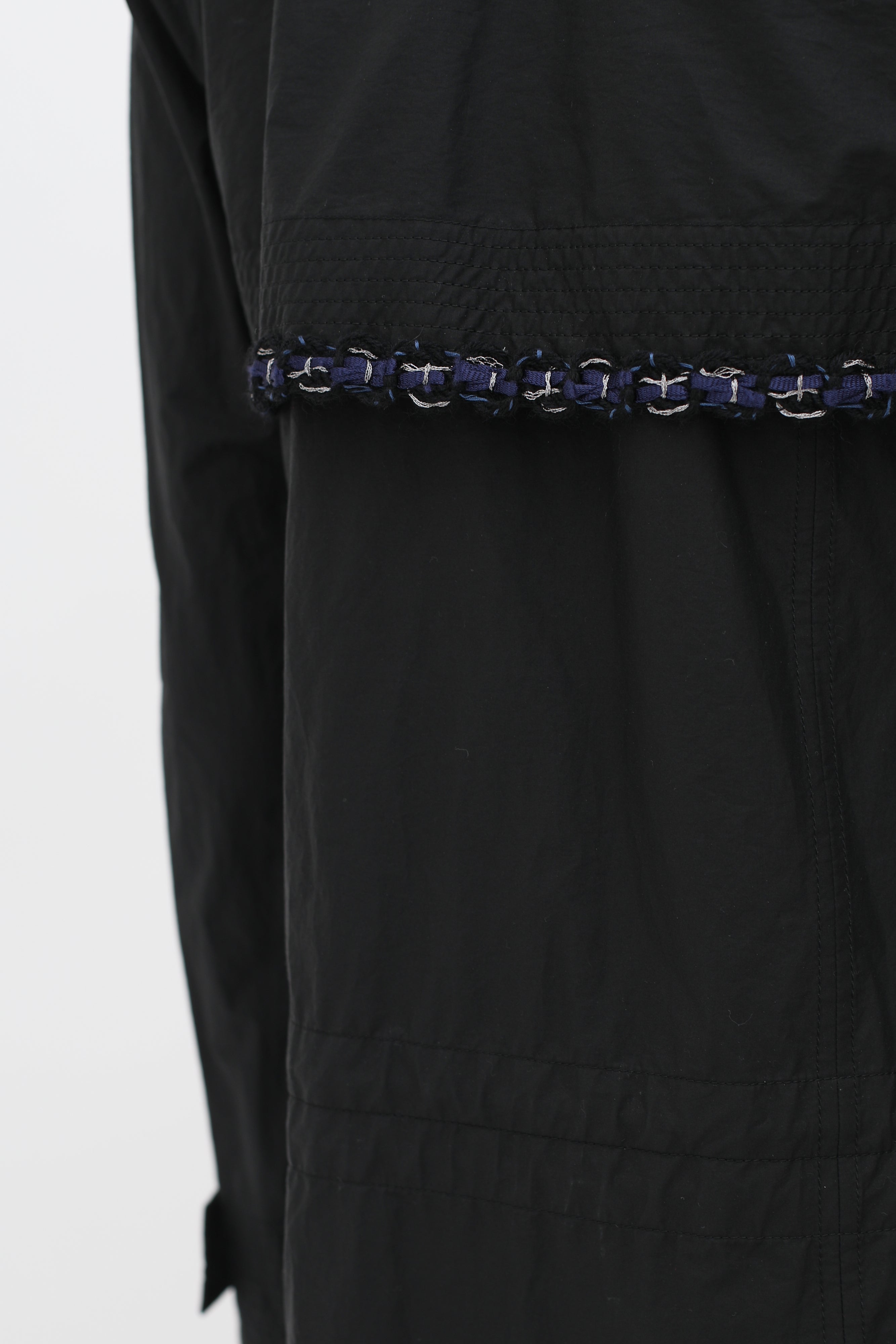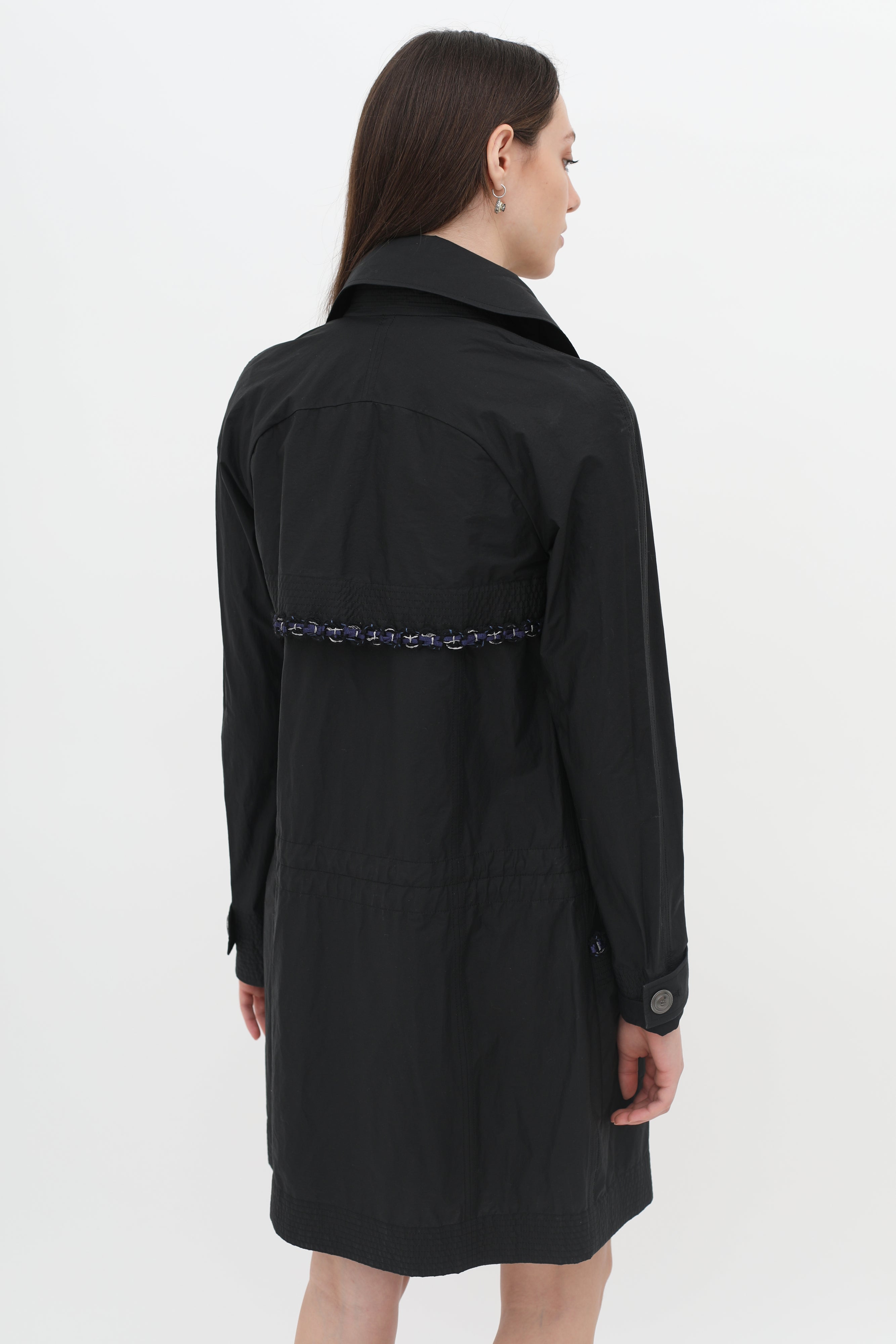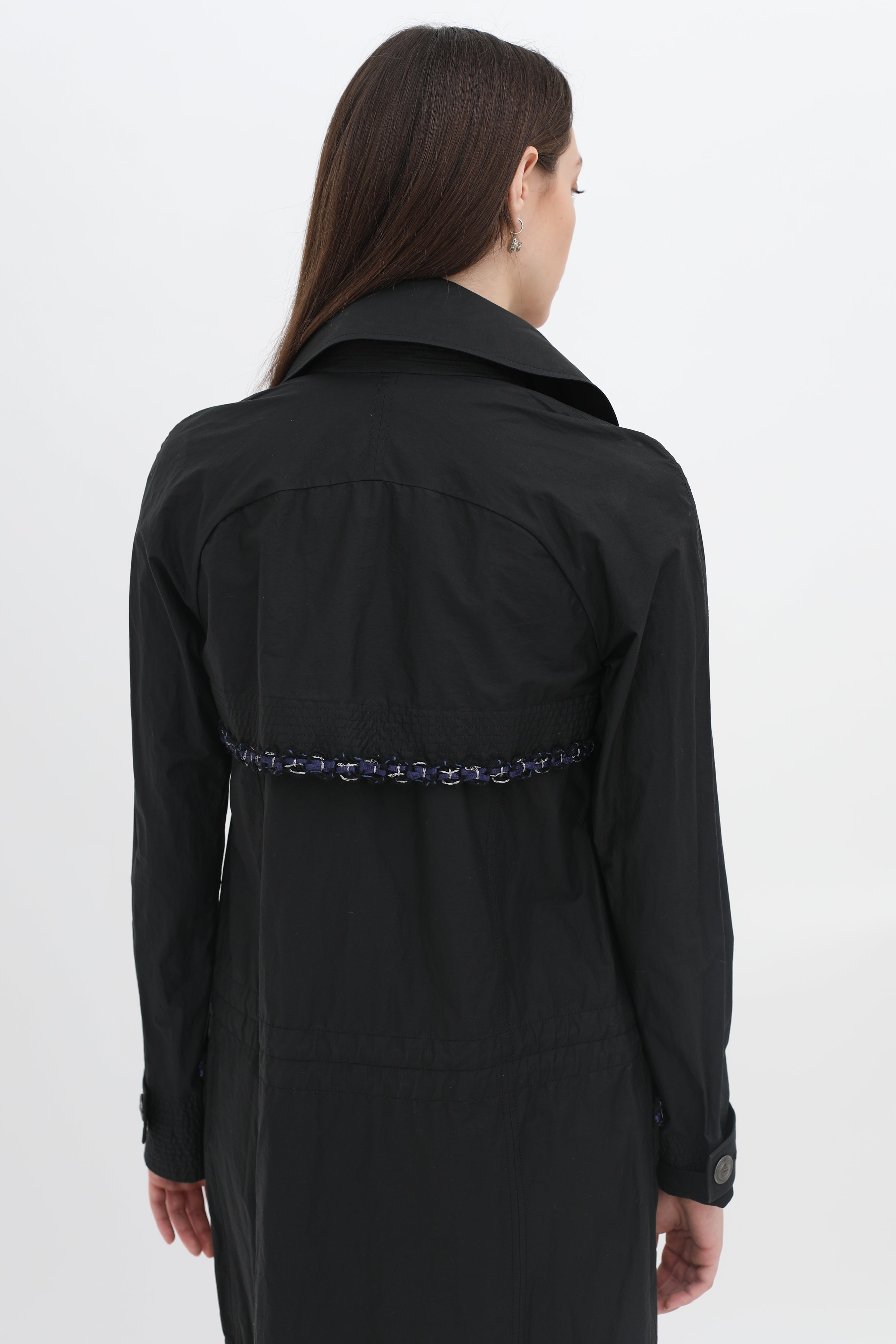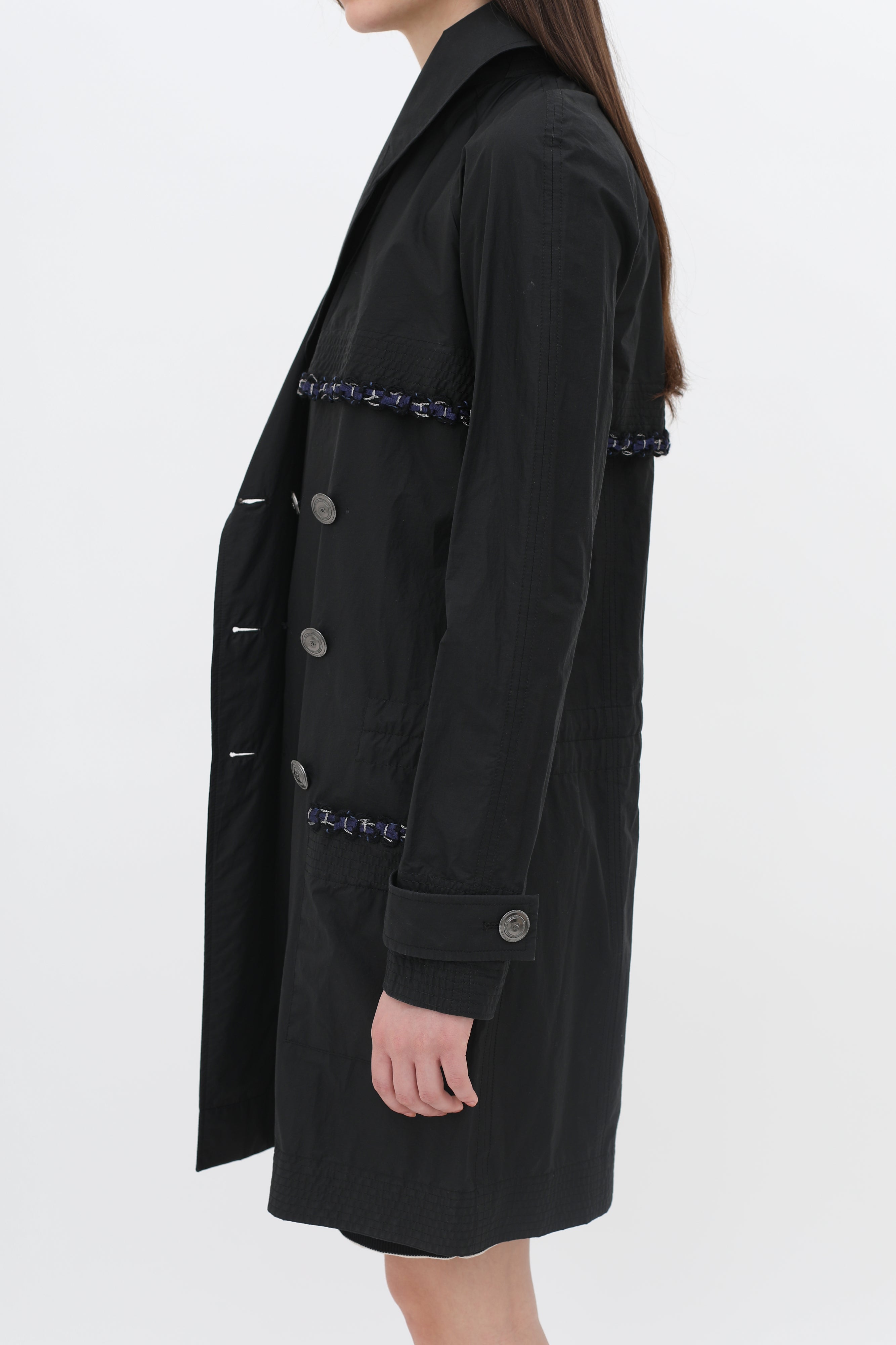 Pre-owned Chanel black raincoat in classic double breasted trench style, button-front closure in silver-toned logo embossed hardware, blue and metallic silver-toned woven trim at pockets, back, and chest, buttoned strap cuffs, rounded lapel collar, two front patch pockets, concealed waist drawstring.