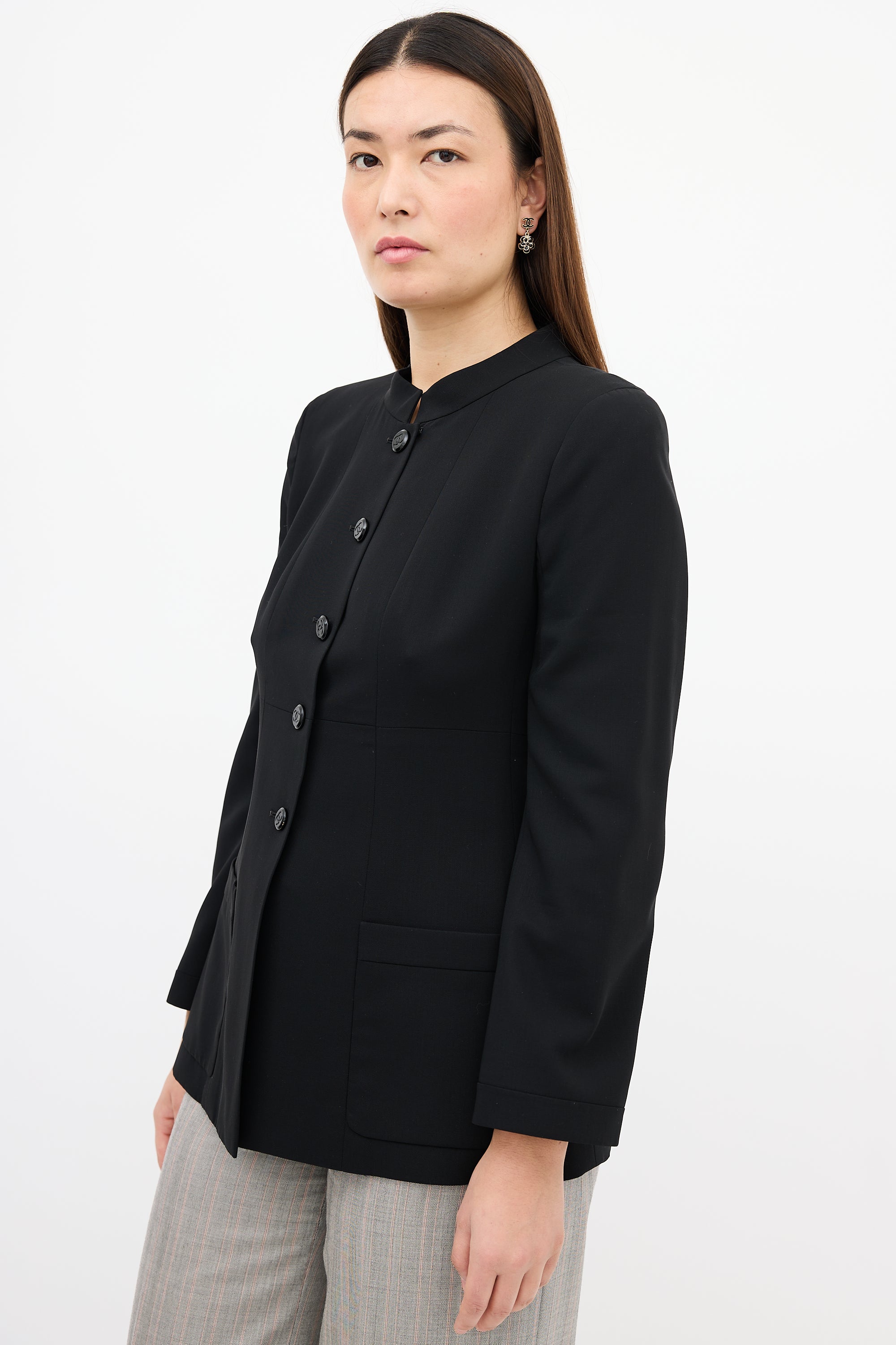 Pre-owned Chanel Fall 1998 black wool blazer featuring a stand collar, logo buttoned front, two front patch pockets, and padded shoulders. Lined.