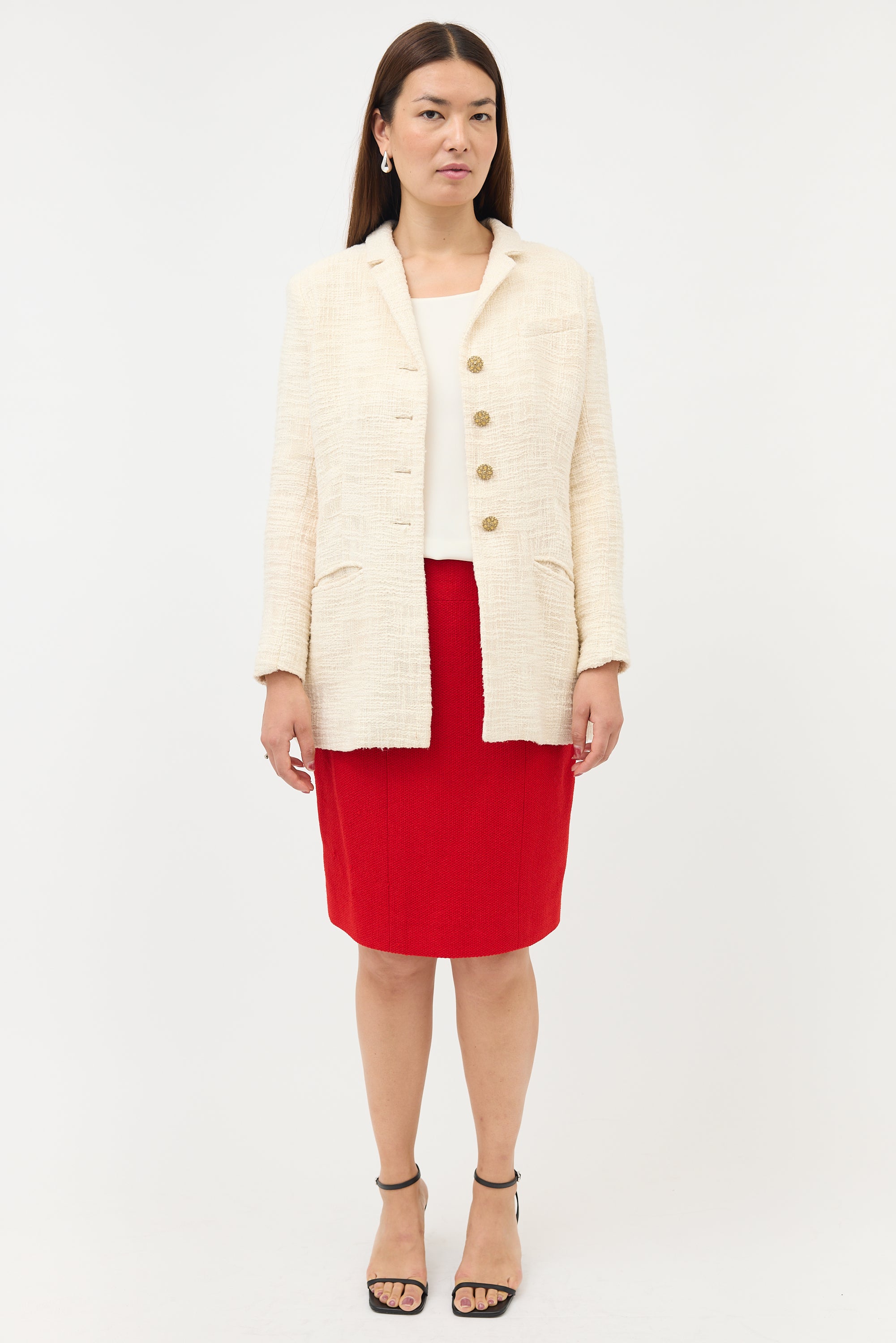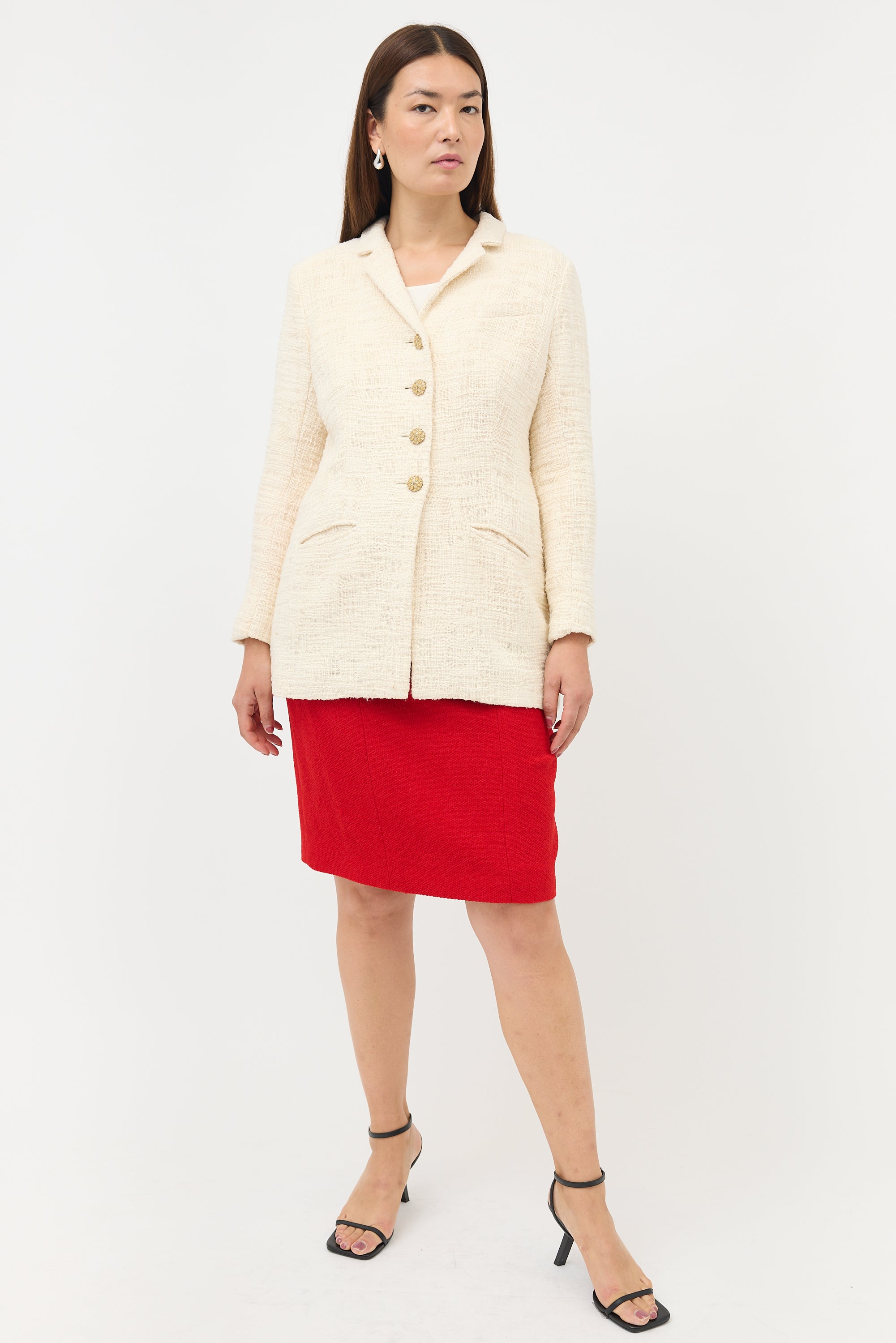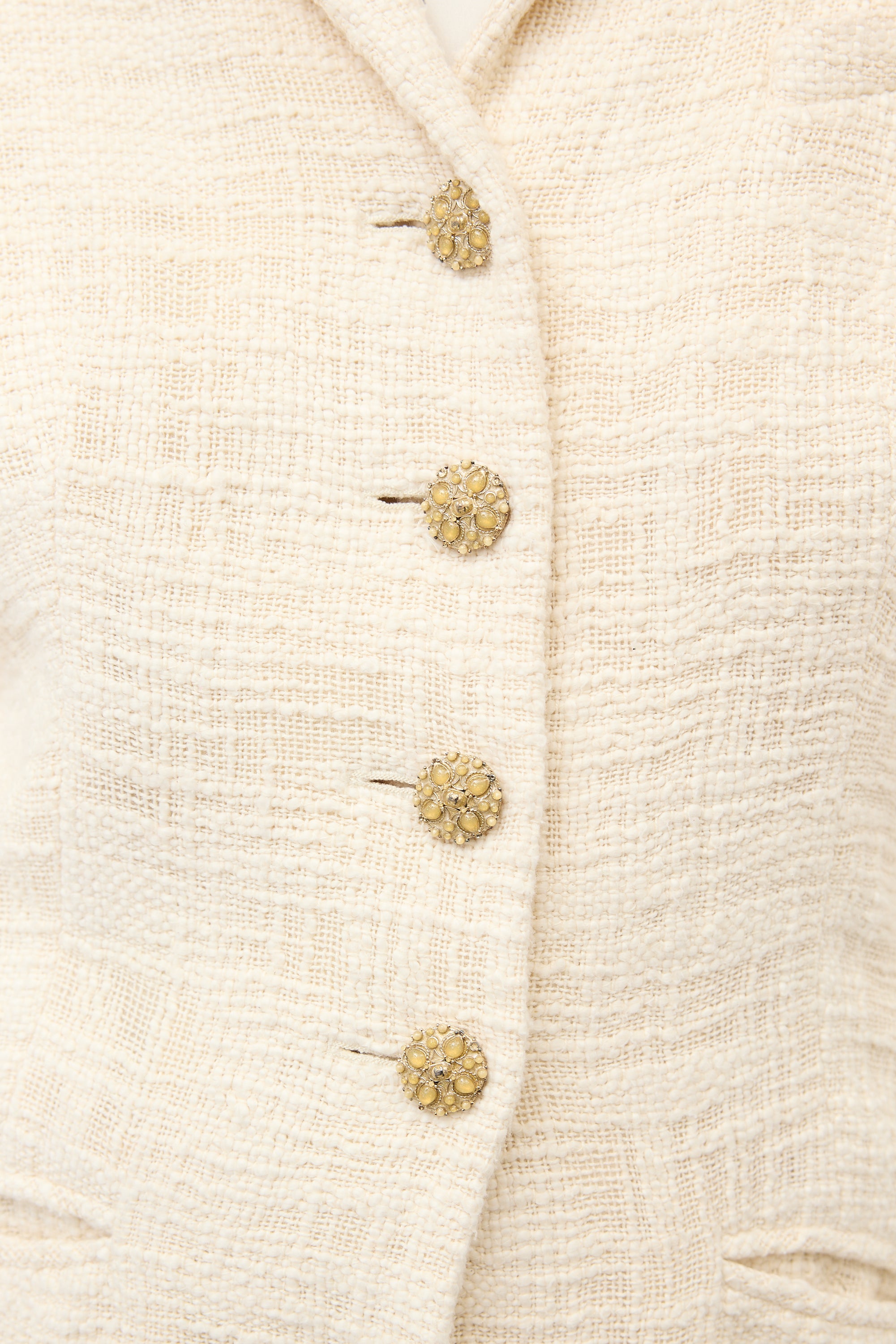 Pre-owned Chanel Pre-Fall 2012 cream tweed jacket featuring a notched lapel, padded shoulders, embellished CC button front, three welt pockets, back vent, and buttoned cuffs. Lined. Karl Lagerfeld era design.