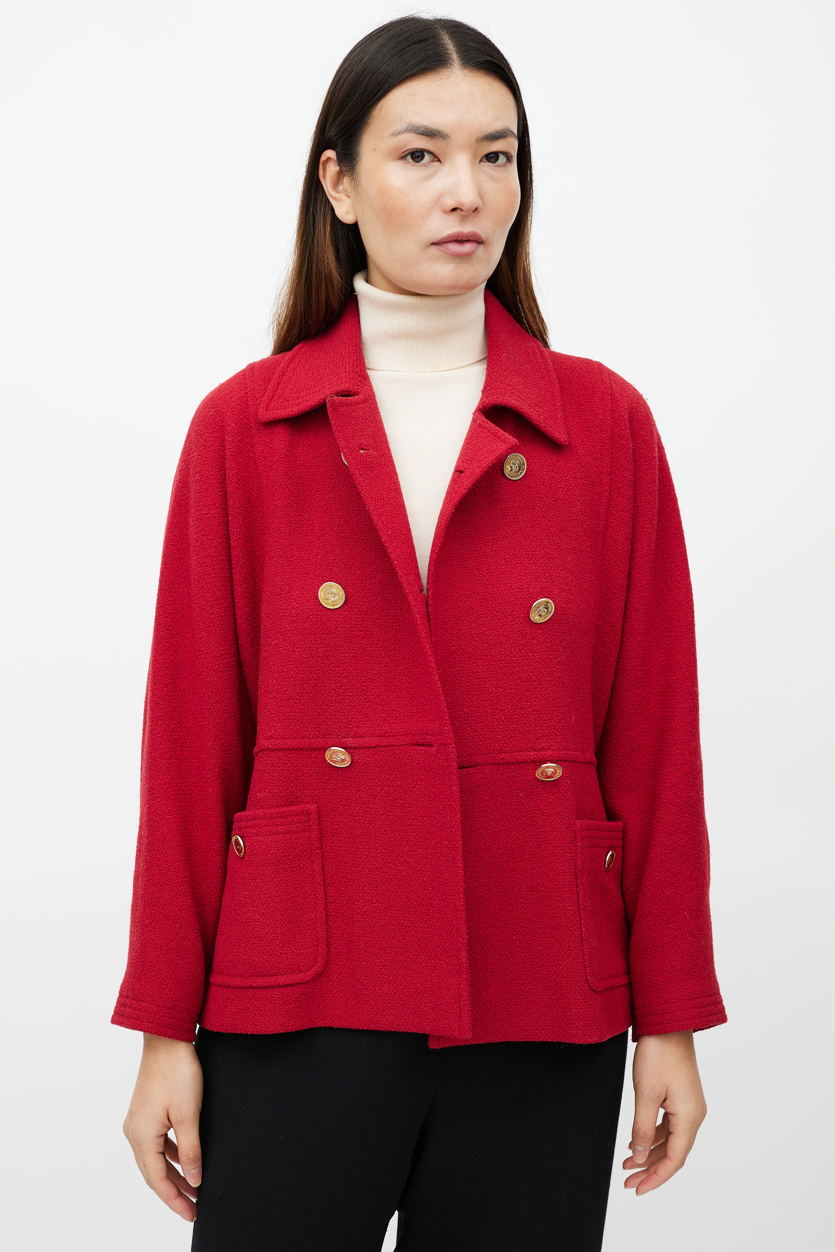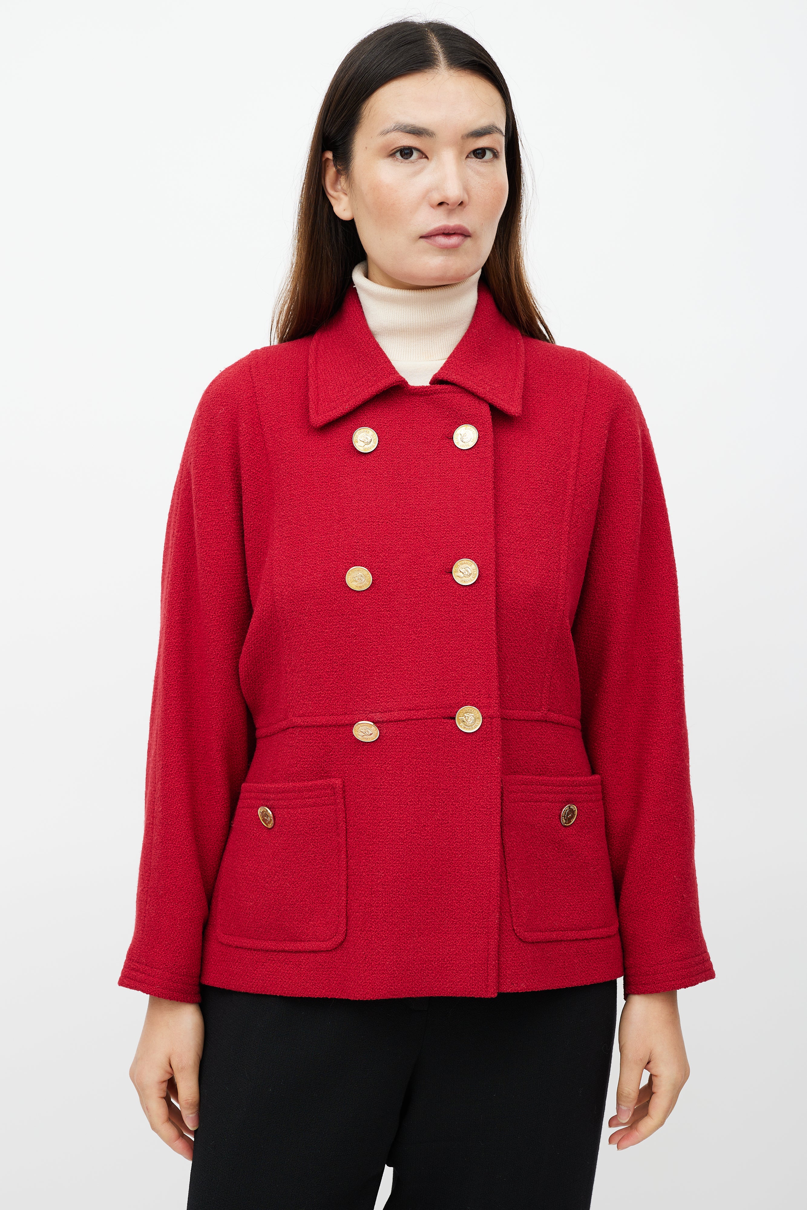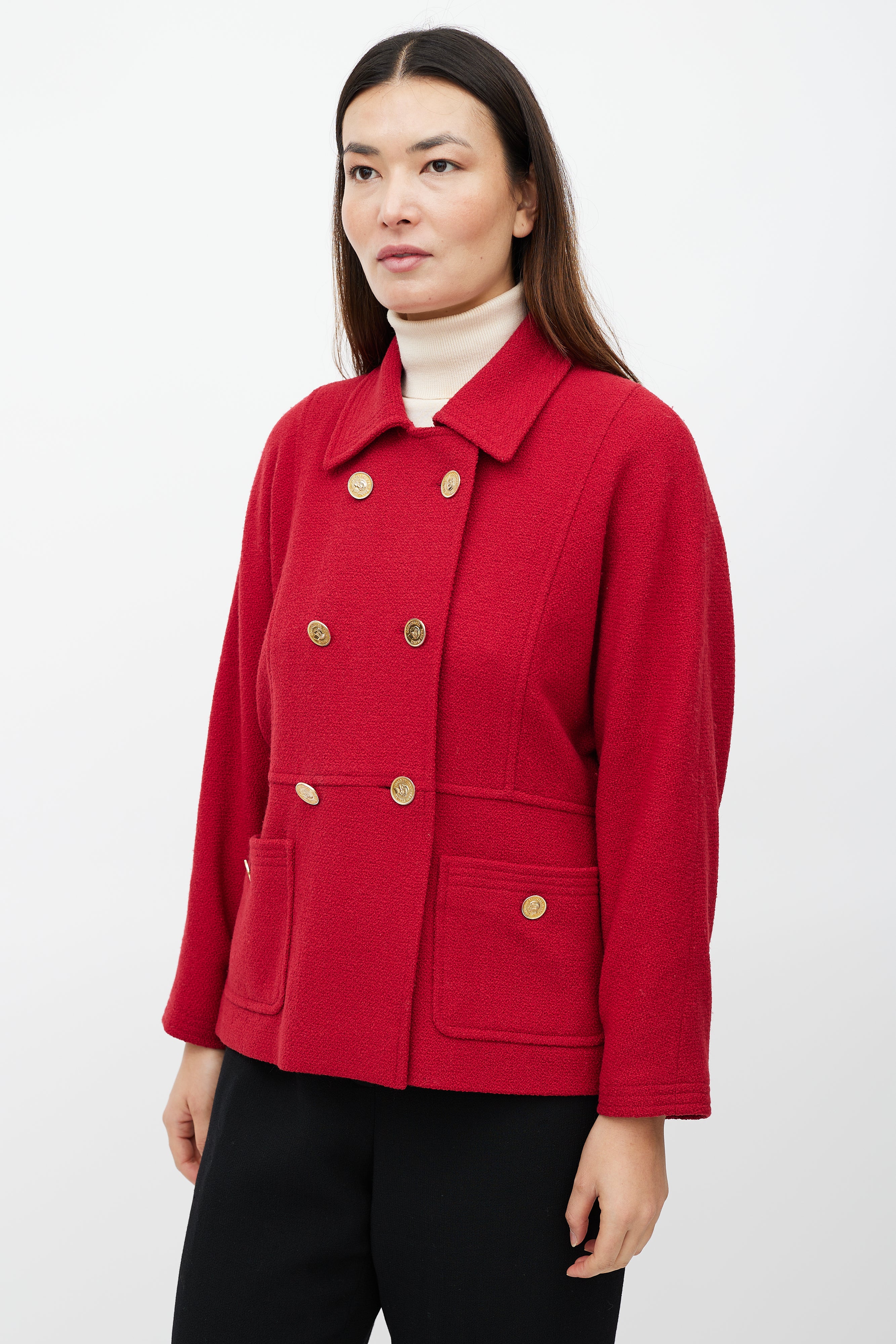 Pre-owned Chanel Boutique red jacket featuring a pointed collar, long sleeves with buttoned cuffs, two patch pockets at hip, button detail at back and double breasted gold tone button closure. Lined.