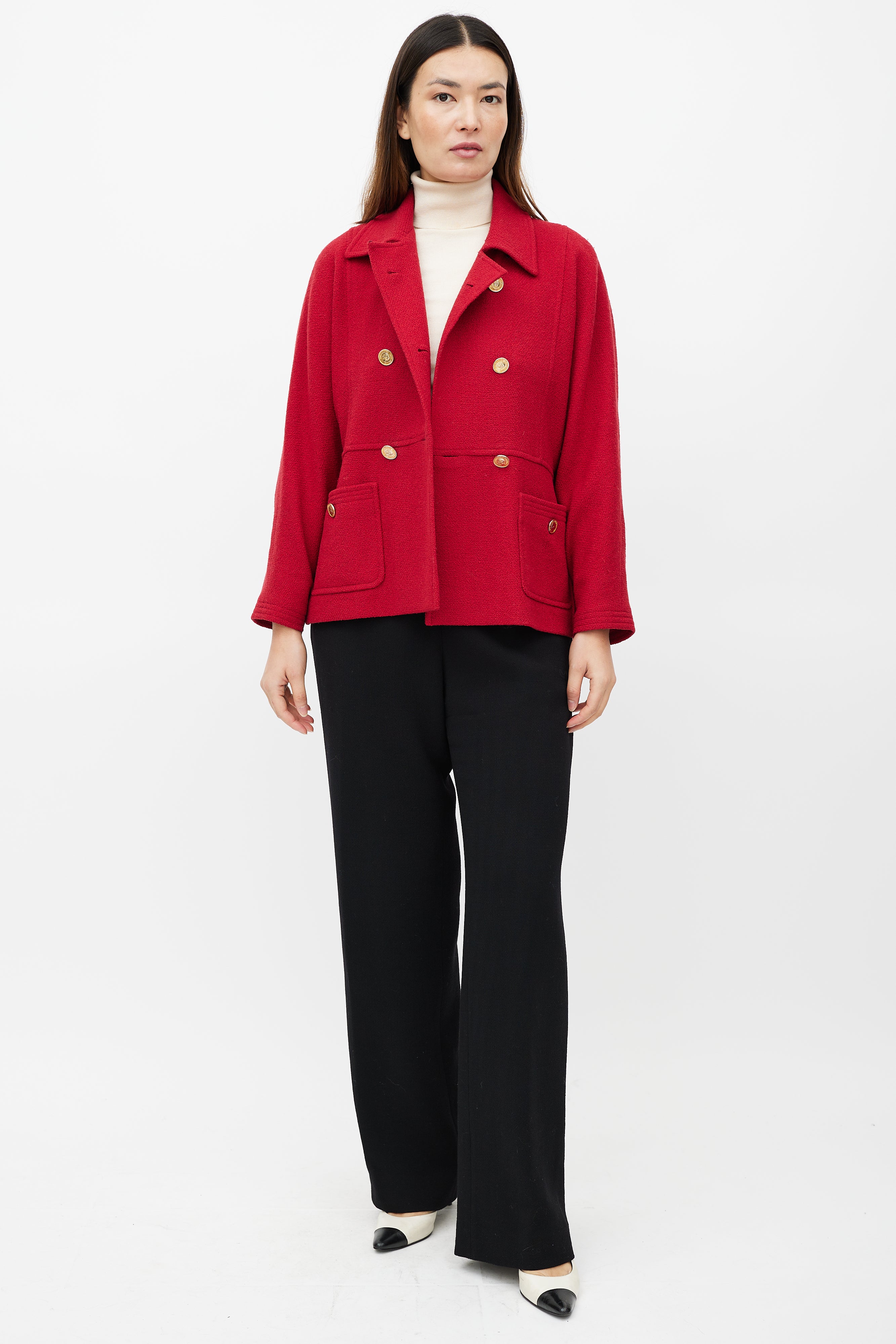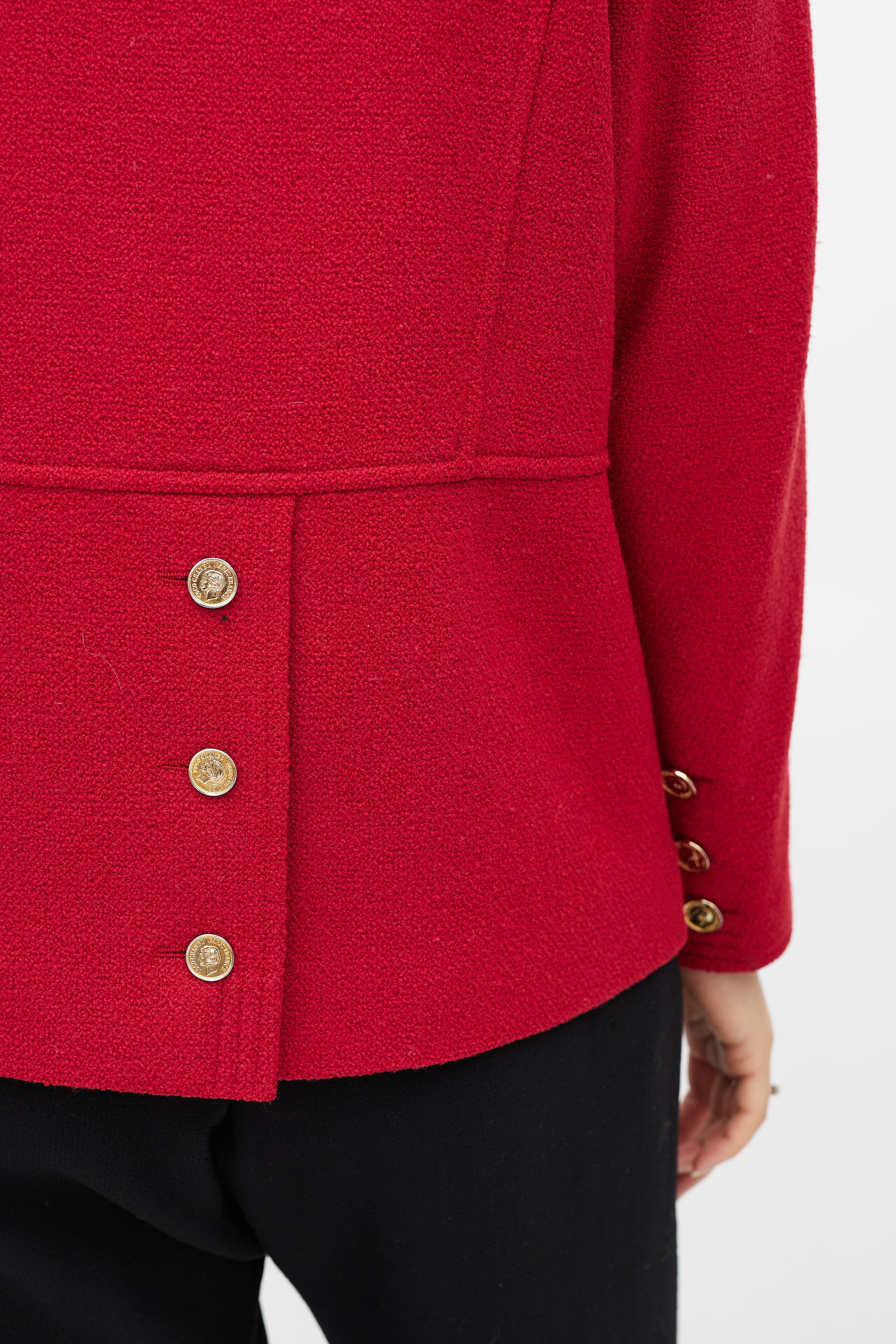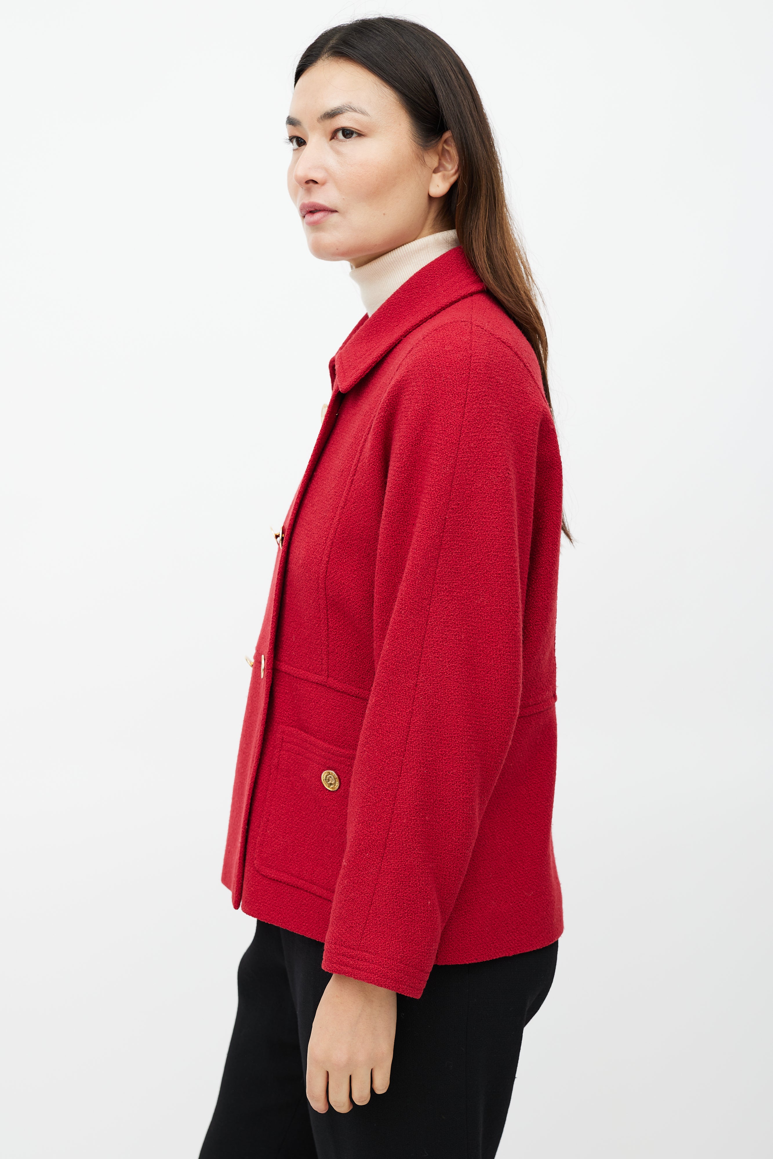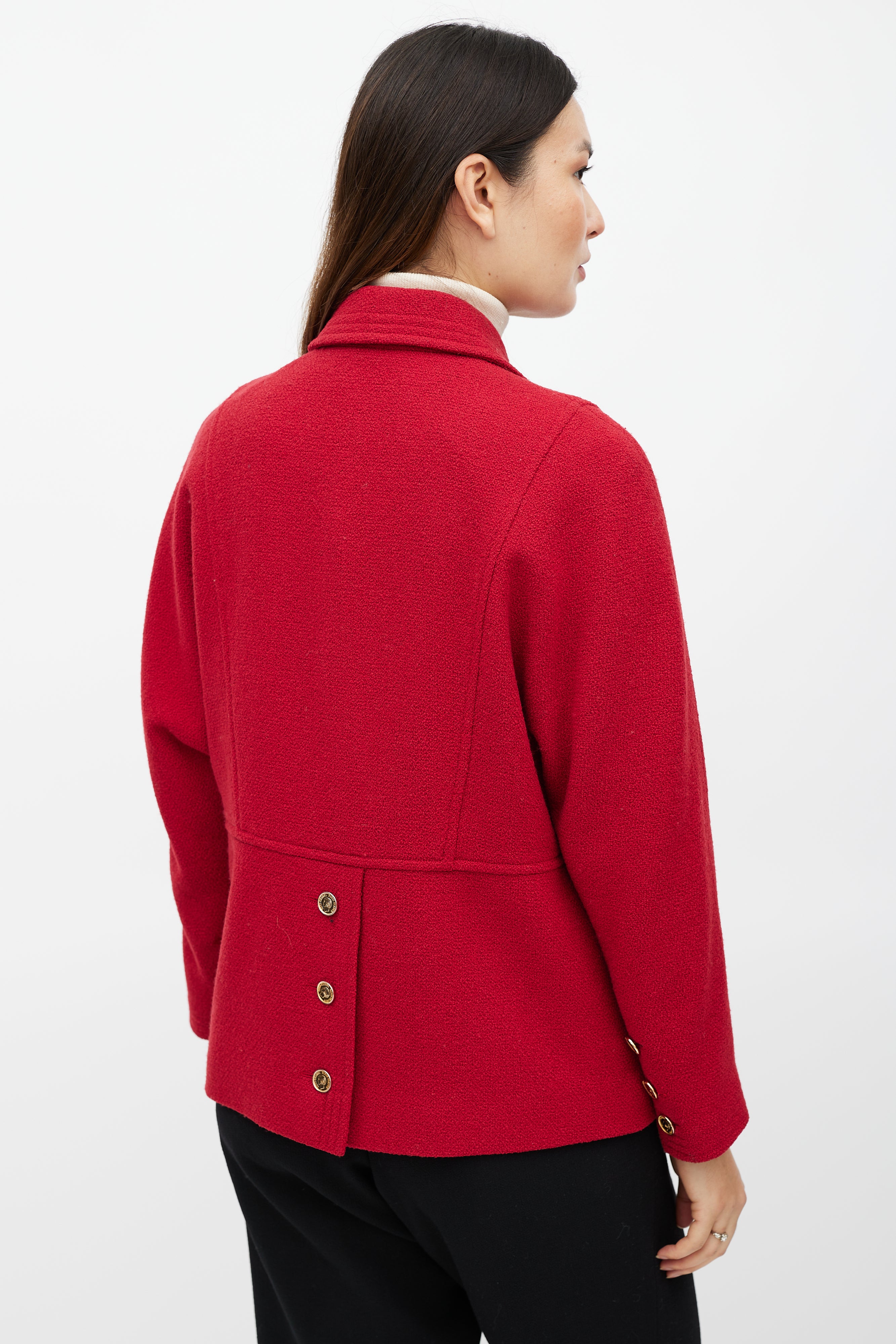 Pre-owned Chanel Boutique red jacket featuring a pointed collar, long sleeves with buttoned cuffs, two patch pockets at hip, button detail at back and double breasted gold tone button closure. Lined.