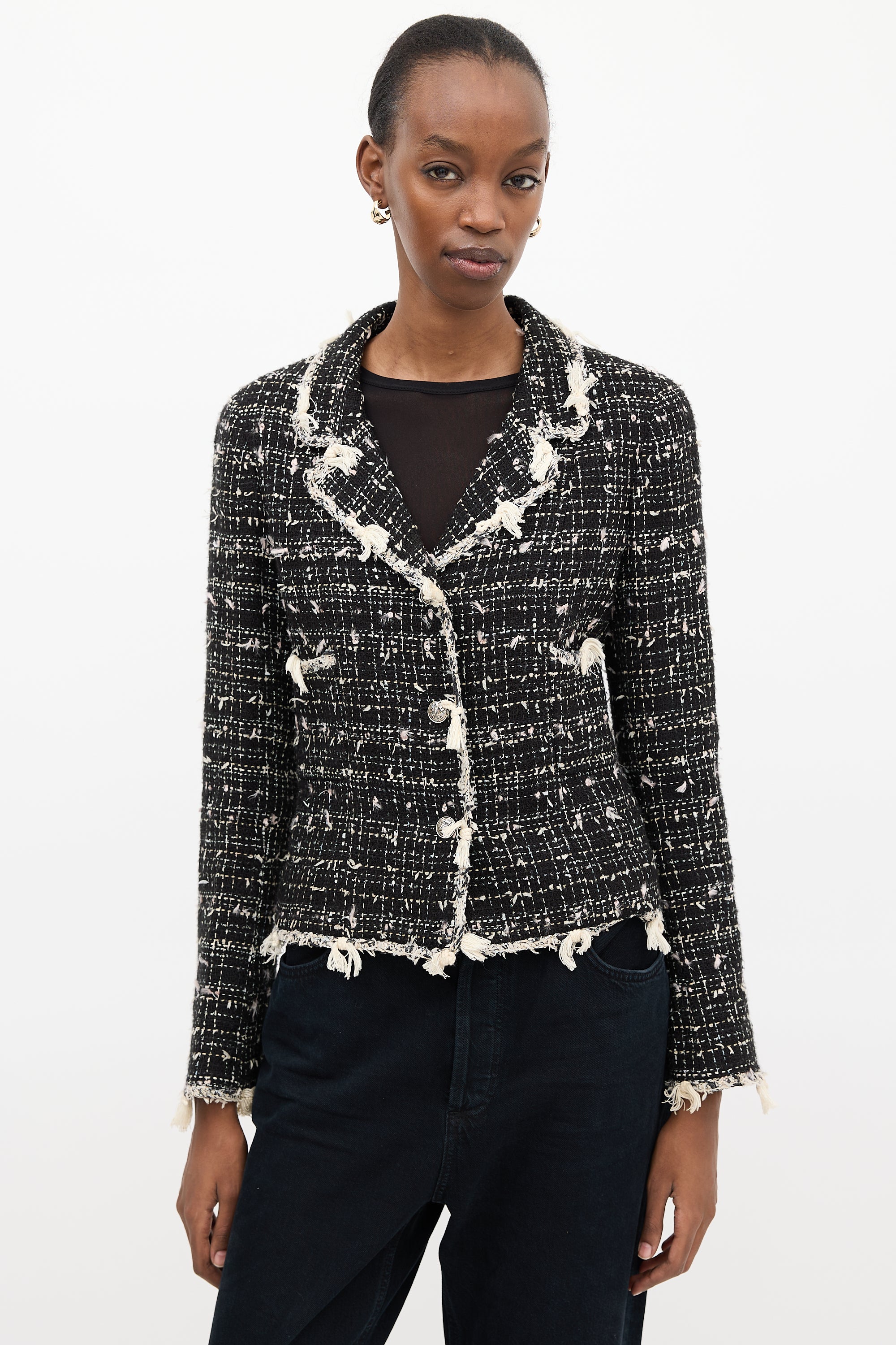 Pre-owned Chanel Spring 2005 black and cream tweed jacket featuring pink and silver tone tweed accents, notched collar, button up front, two patch pockets at waist, buttoned cuffs, and knotted fringe trim throughout. Lined. Comes with extra button.