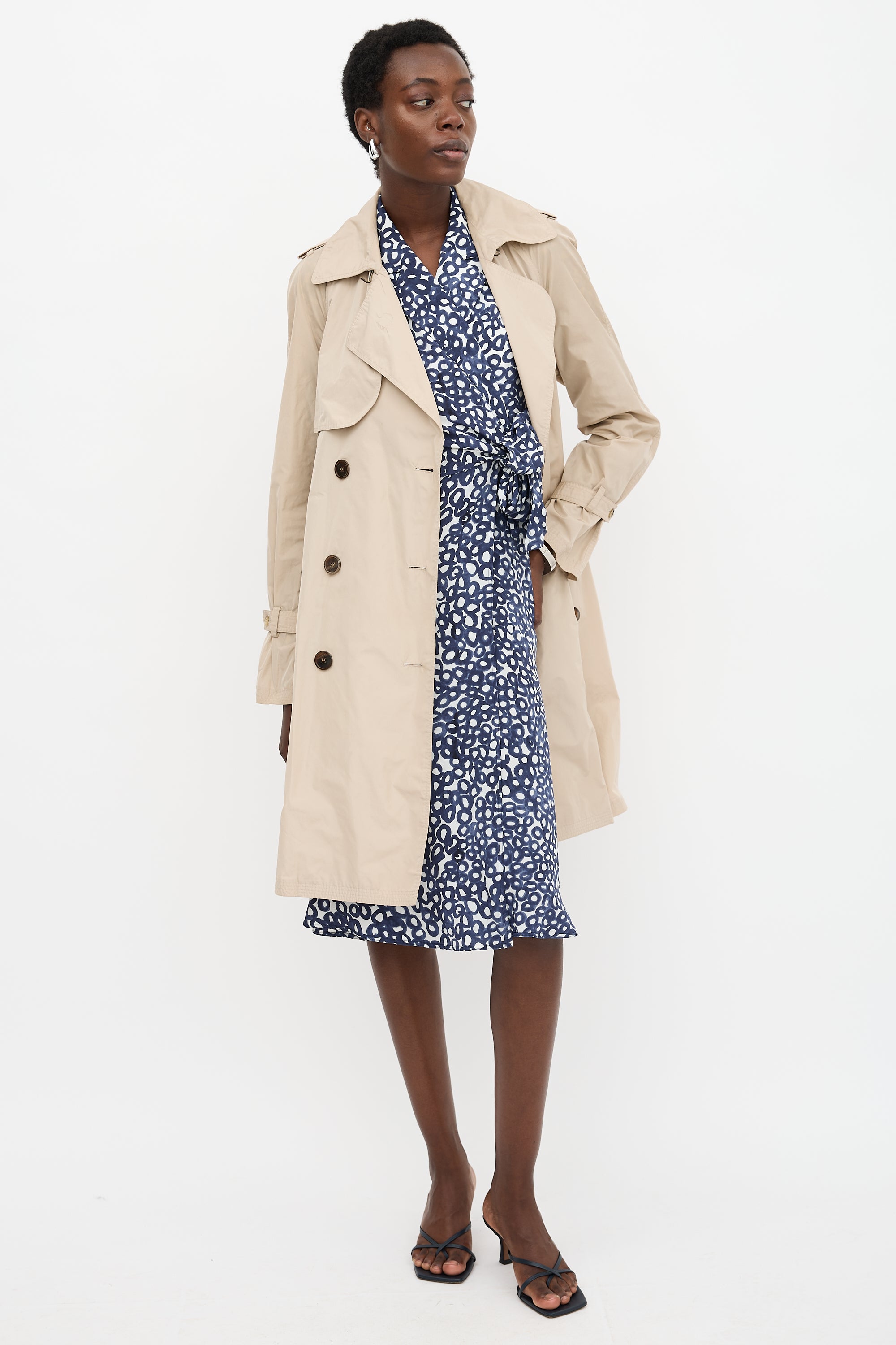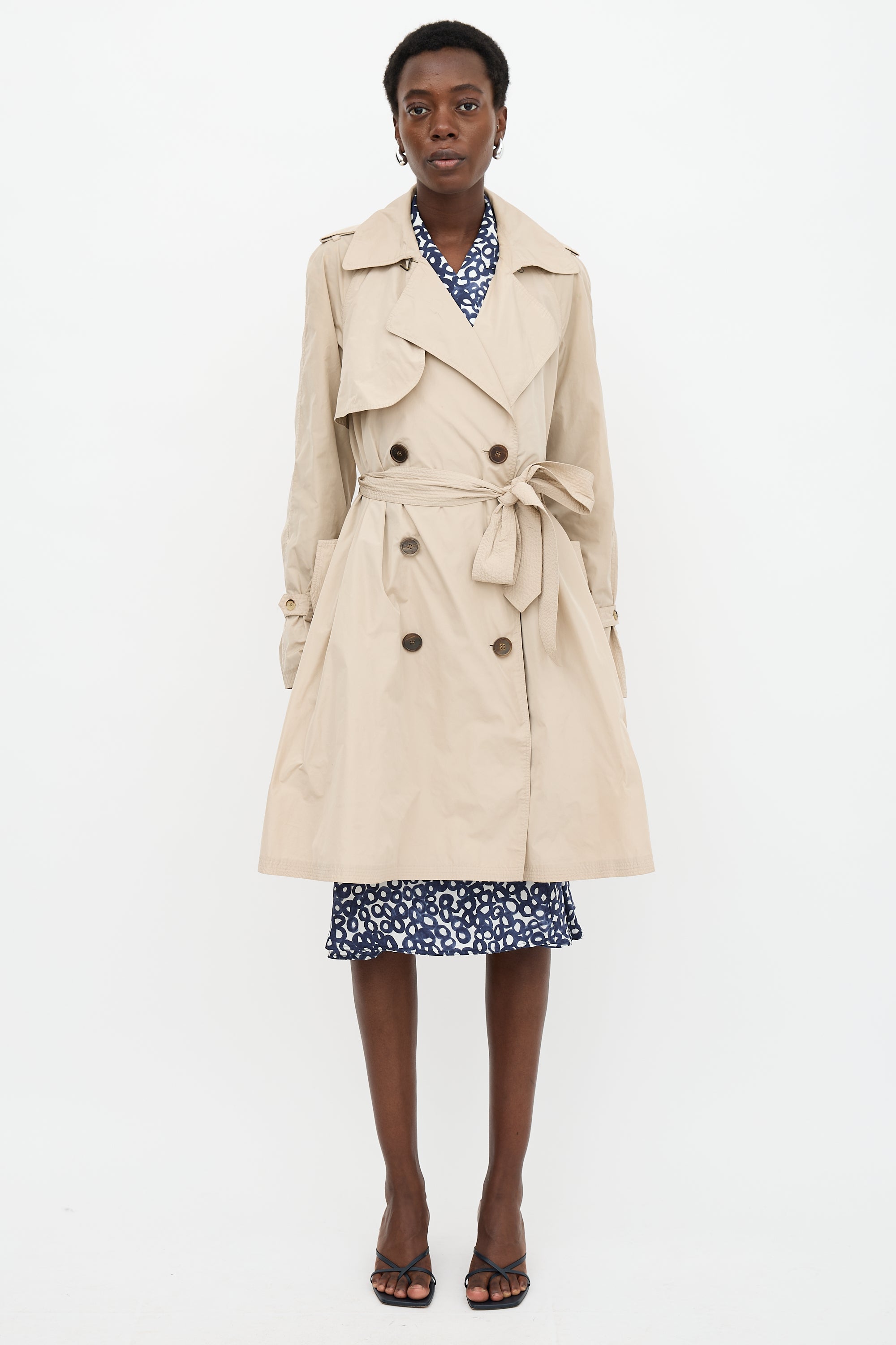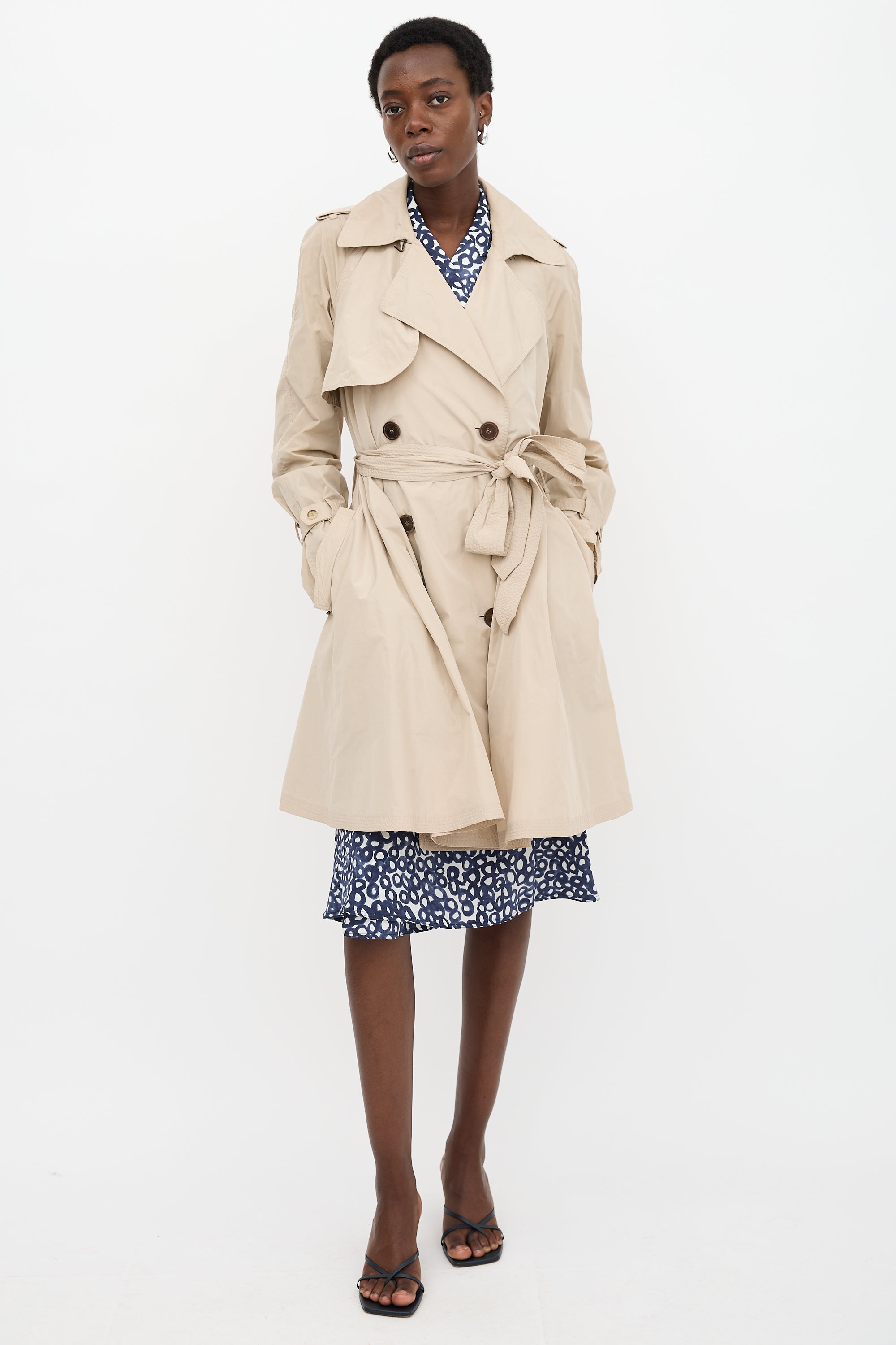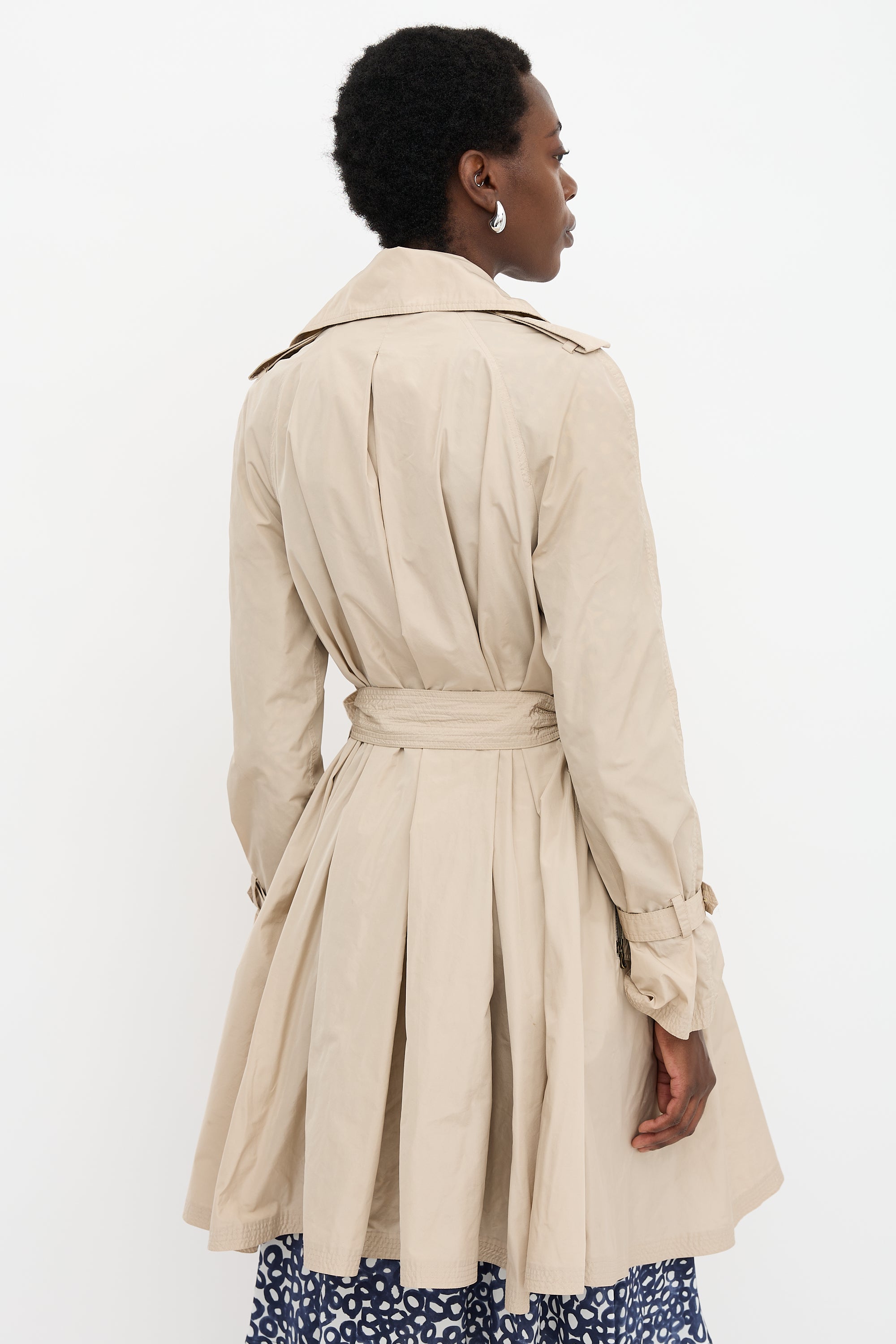 Pre-owned Lanvin beige trench coat featuring a wide collar and lapels, epaulettes, double breasted button front, adjustable belt, storm flap, pleated back, and zip pockets with flap detail. Unlined.