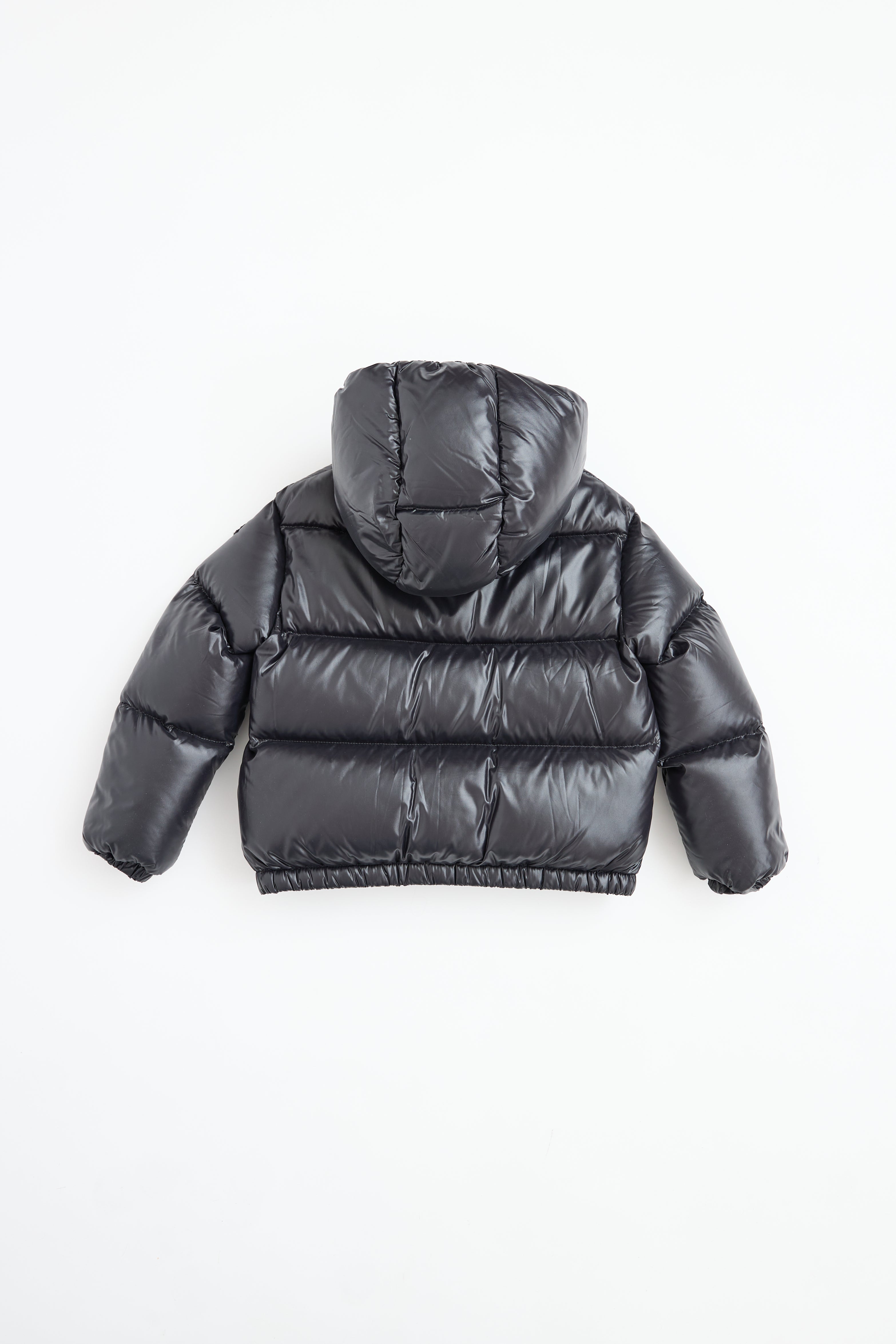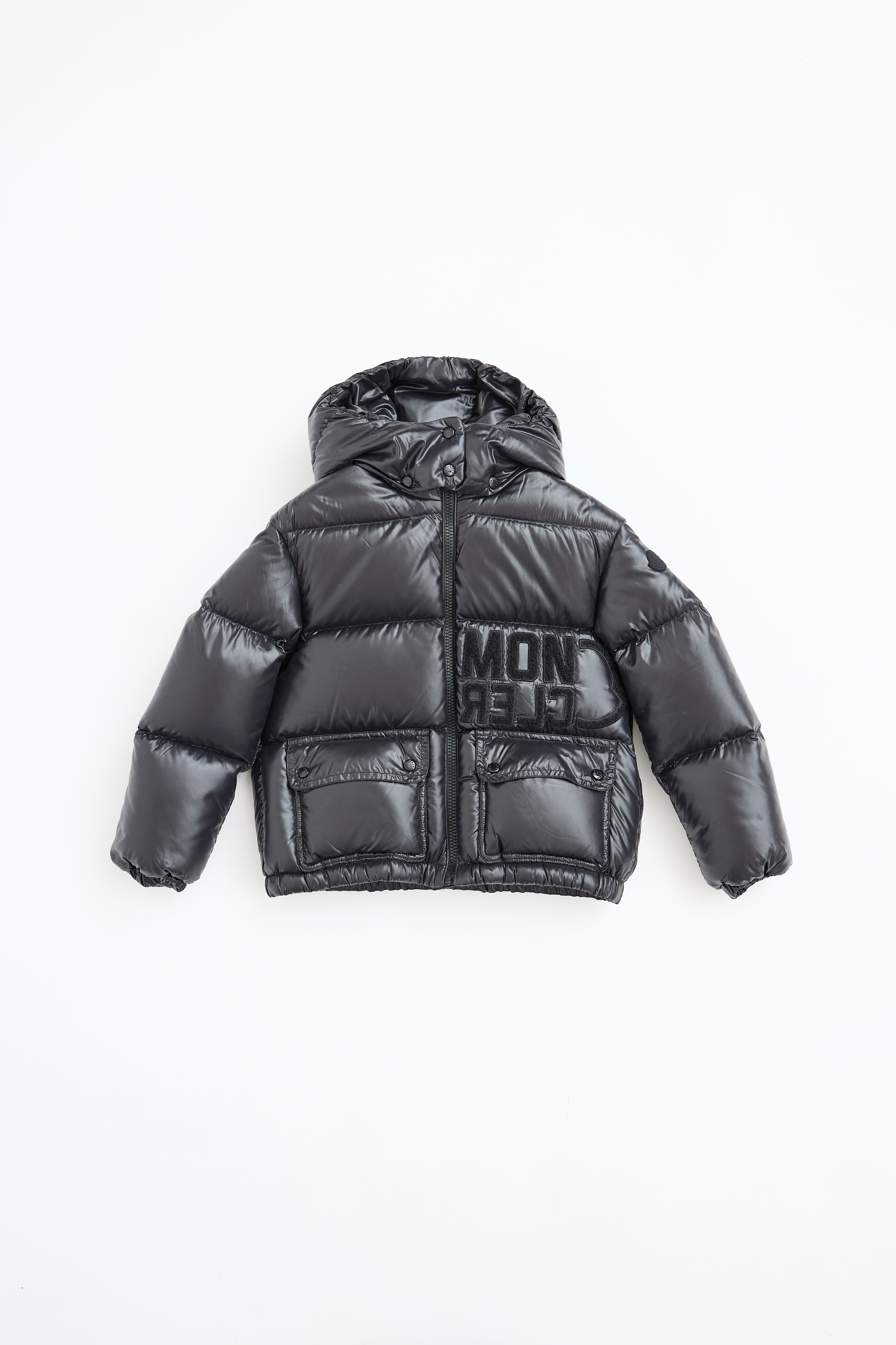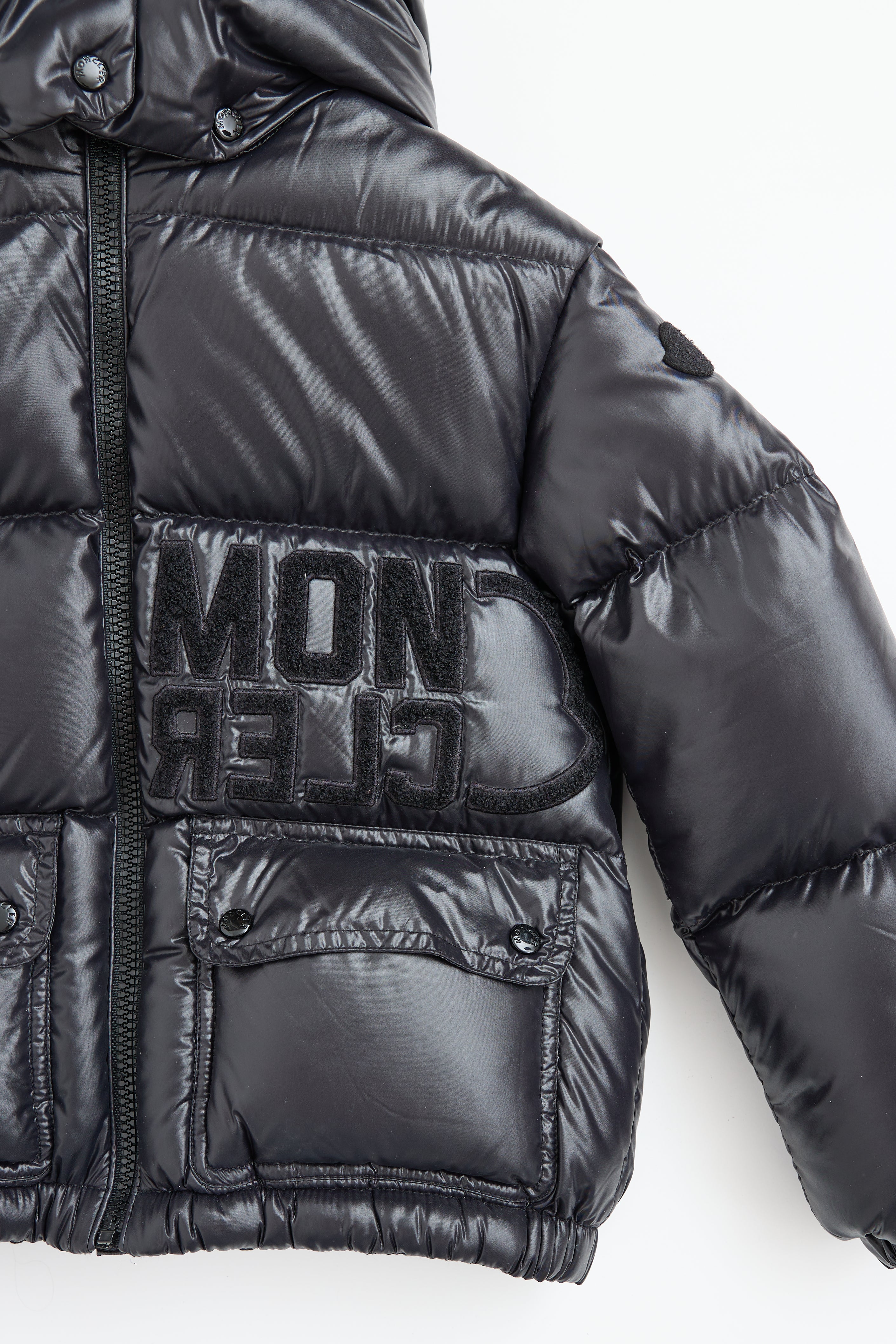 Pre-owned Moncler kids black Abbaye Giubbotto puffer jacket featuring a removable hood, front zip closure, embroidered logo at left chest, flap pockets with snap button closure at front of waist, logo patch at left sleeve, and cinched cuffs and hem.
