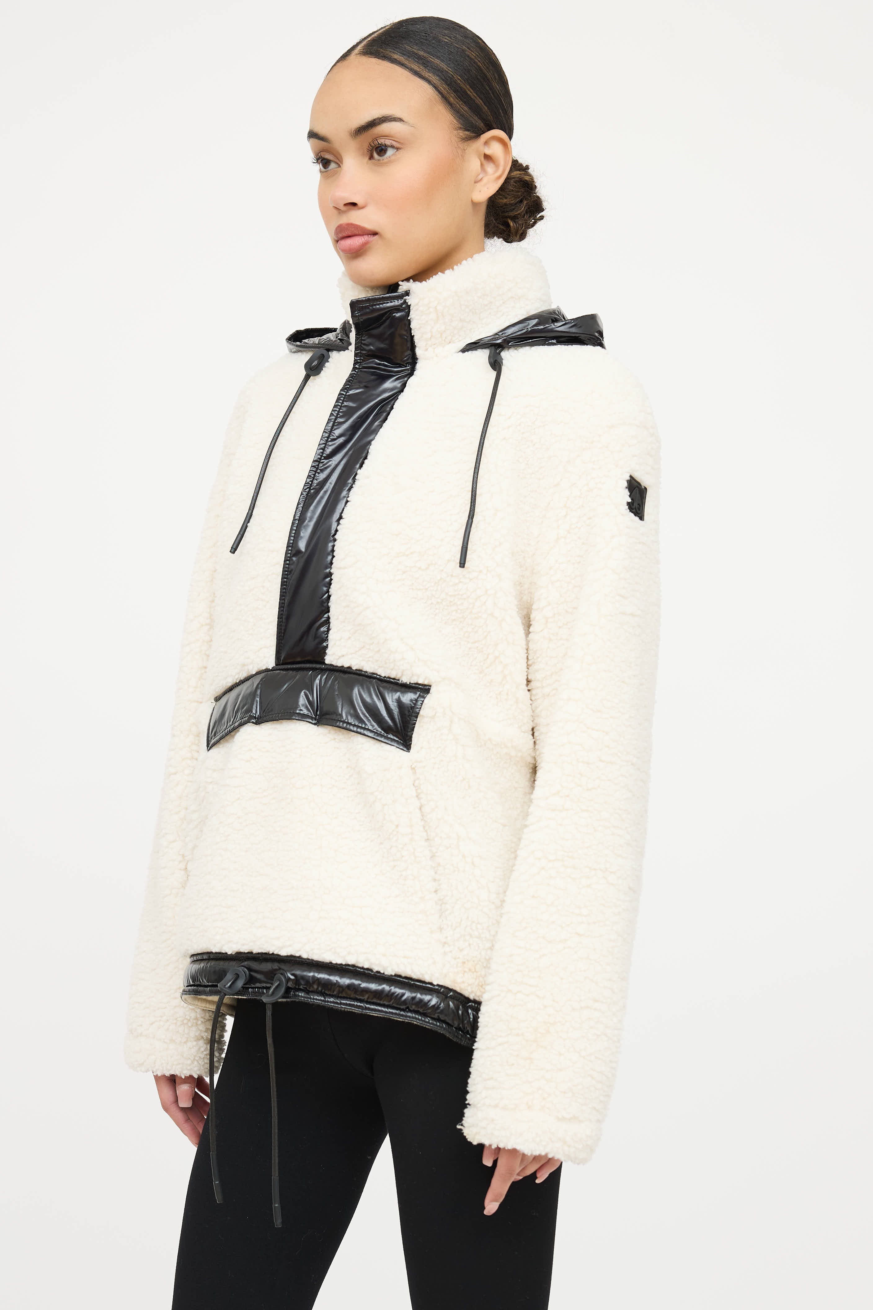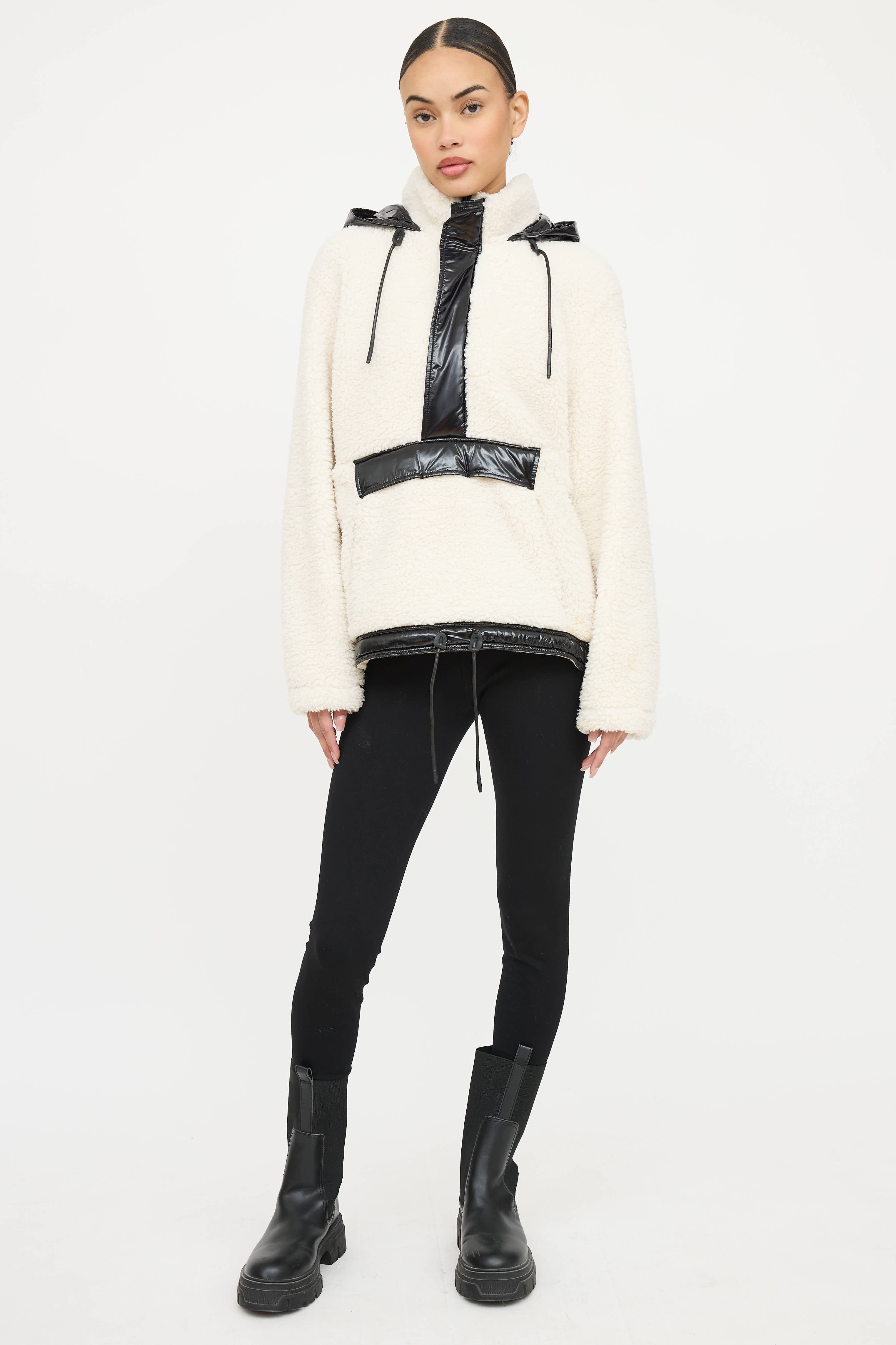 Pre-owned Moose Knuckles cream sherpa pullover jacket featuring a mock neck collar with black patent drawstring hood, long sleeves, leather logo tab at shoulder, kangaroo pocket at front, drawstring hem, and quarter zip closure. Lined.