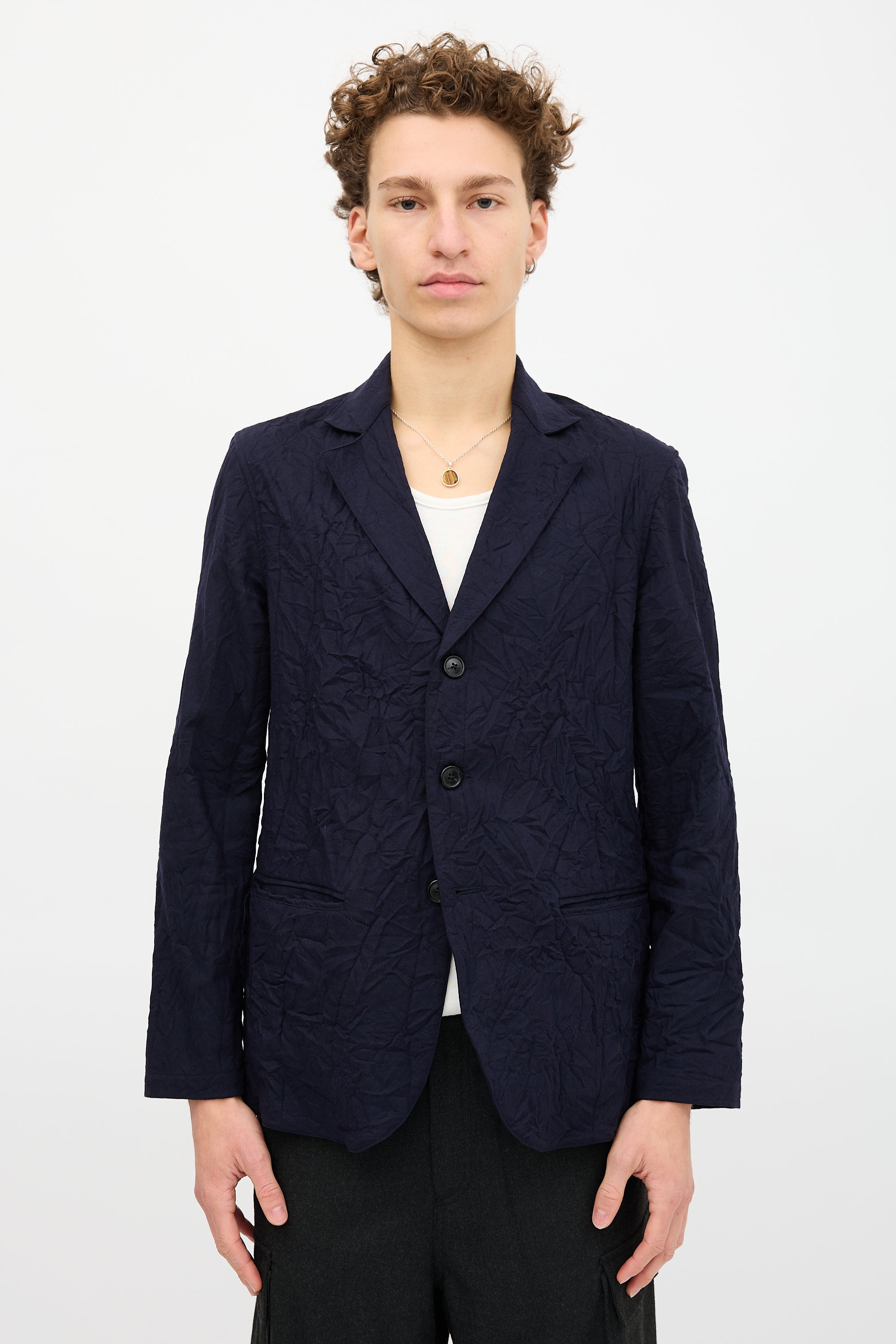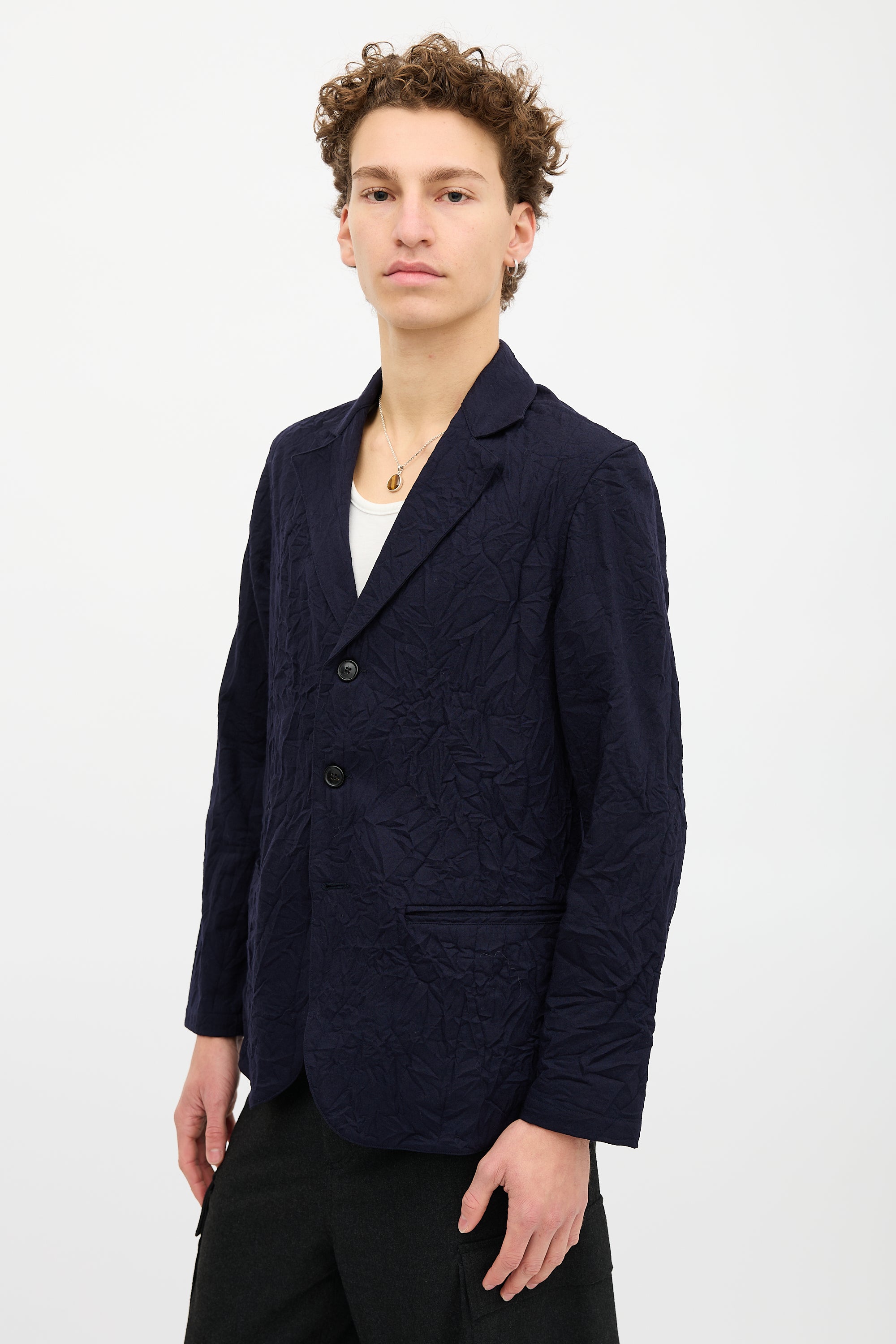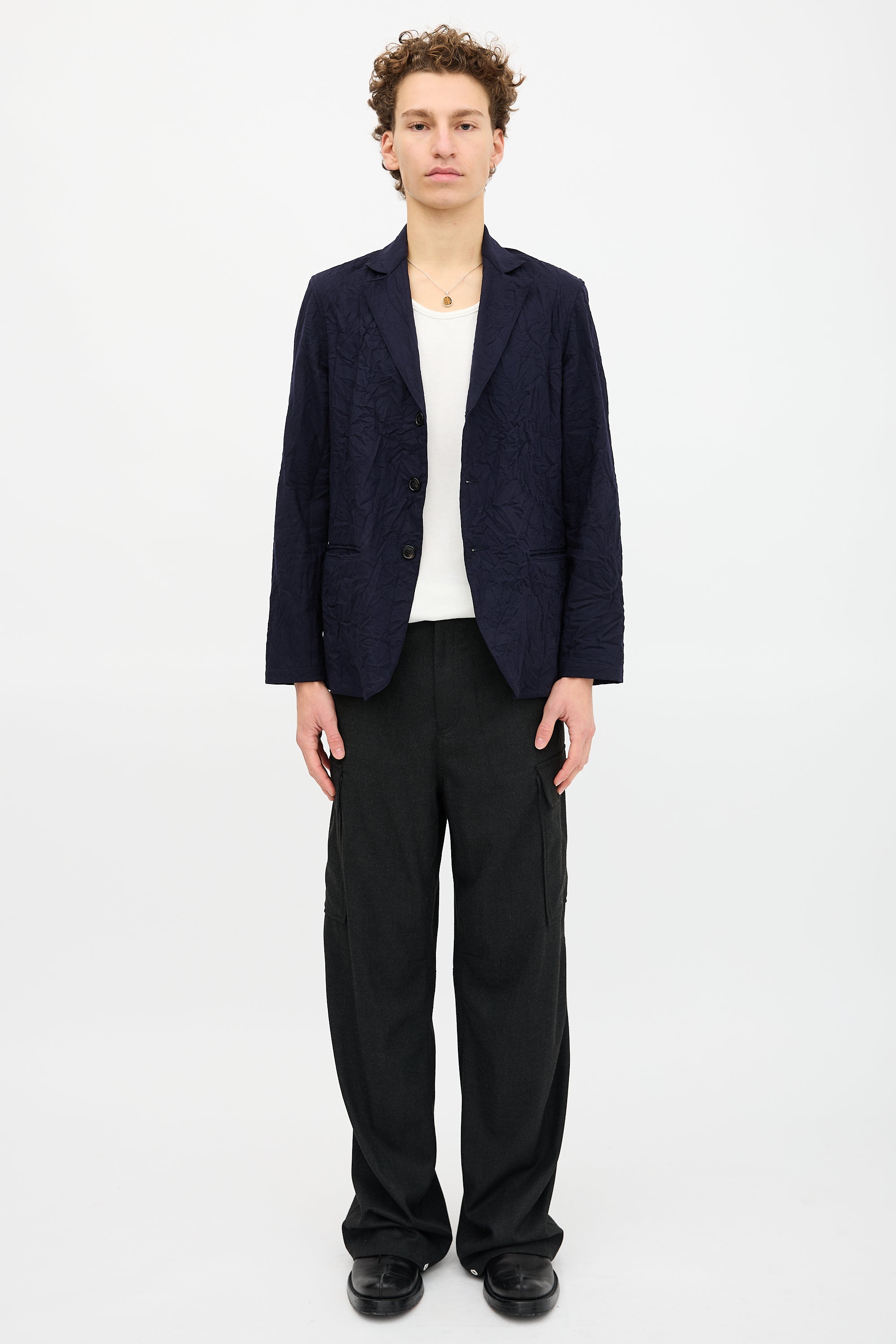 Pre-owned Our Legacy navy crinkled wool blazer featuring a notched collar, button front, double welt pockets, and interior patch pockets. Unlined.