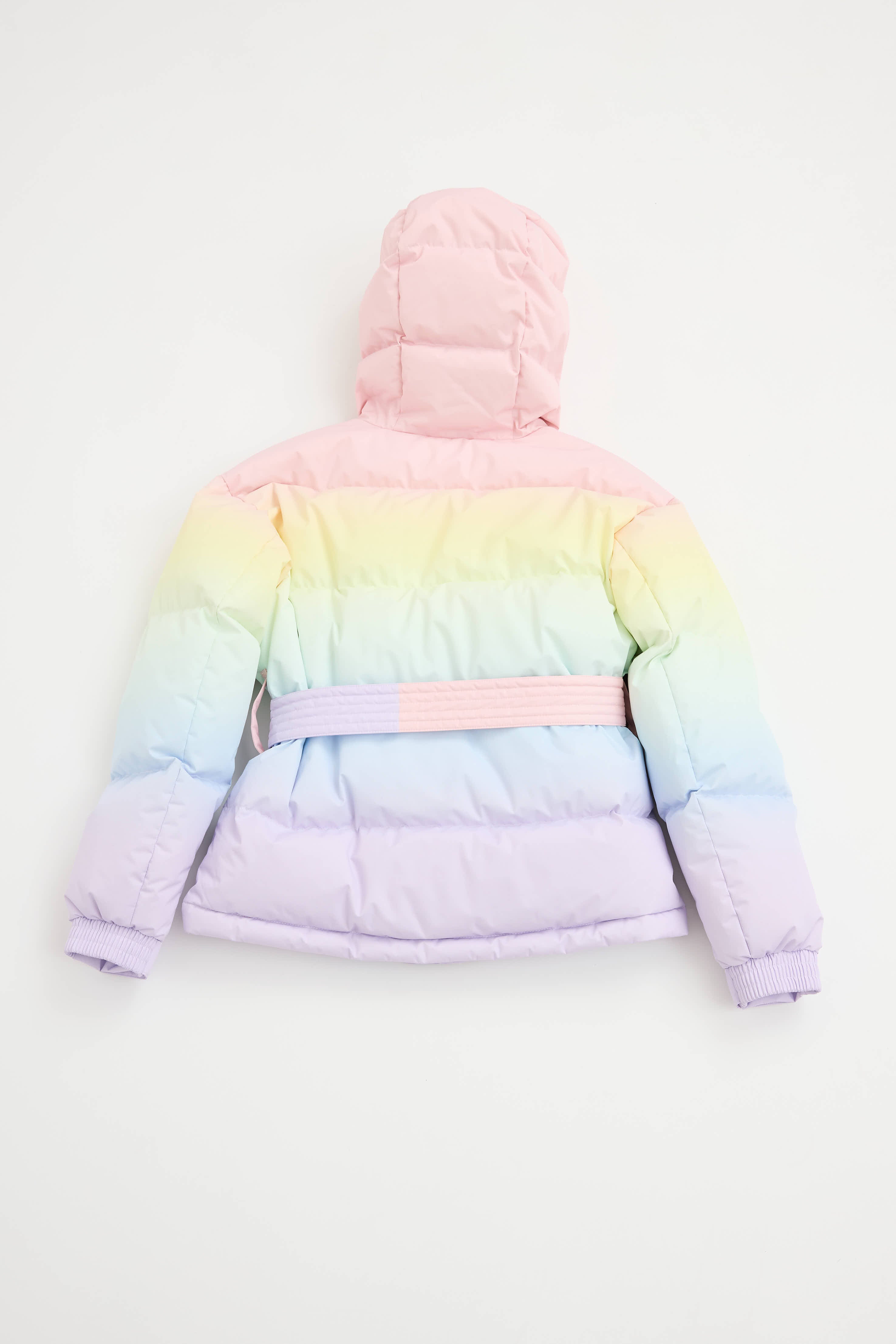Pre-owned Perfect Moment pink ski parka jacket featuring a multicolour gradient pattern throughout, oversized fit, attached hood, embroidered red star at collar, long sleeves with elastic cuffs, zip pockets at waist, adjustable belt at waist, and zip closure. Lined. Includes additional blue elastic waist belt.