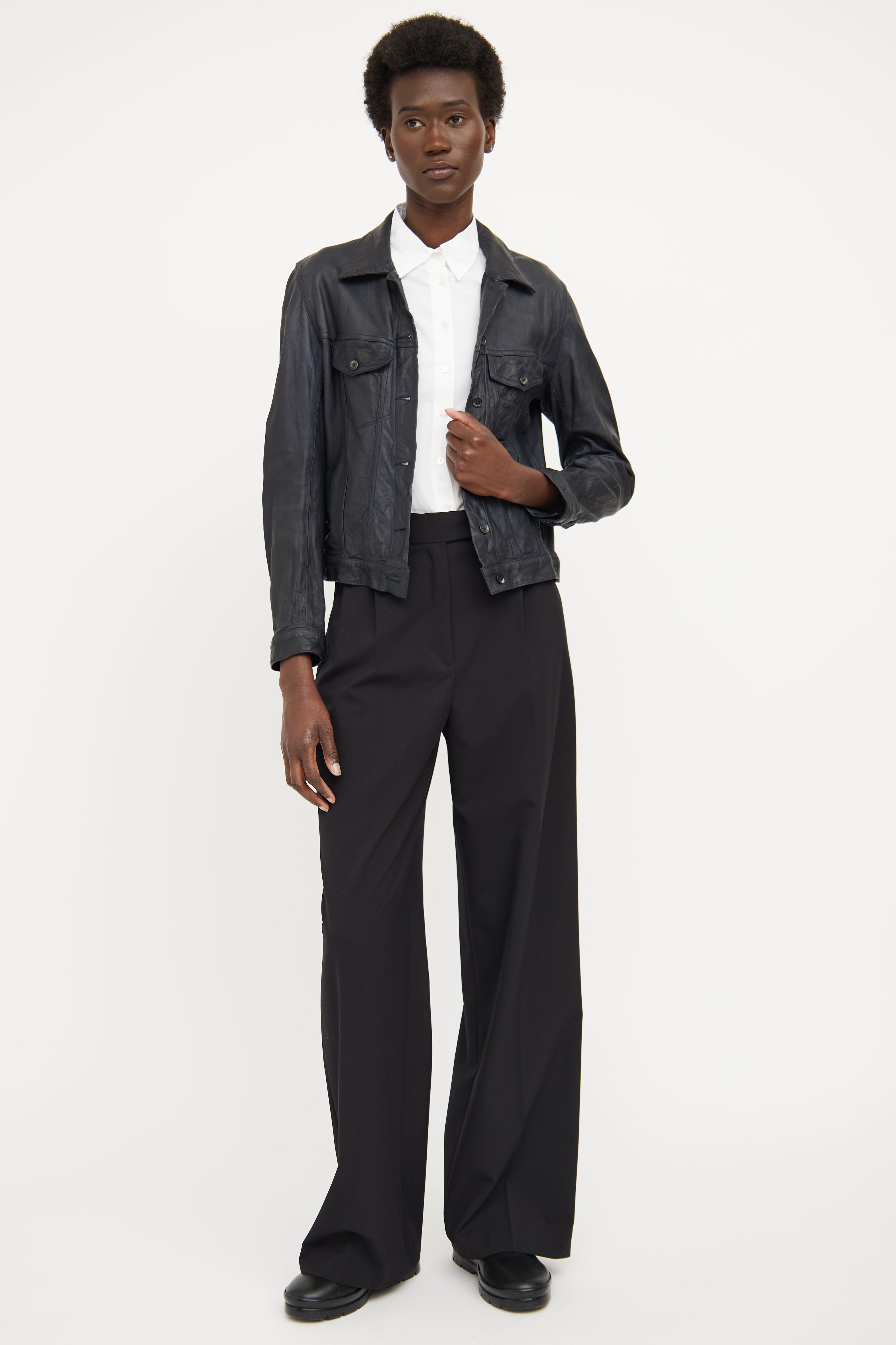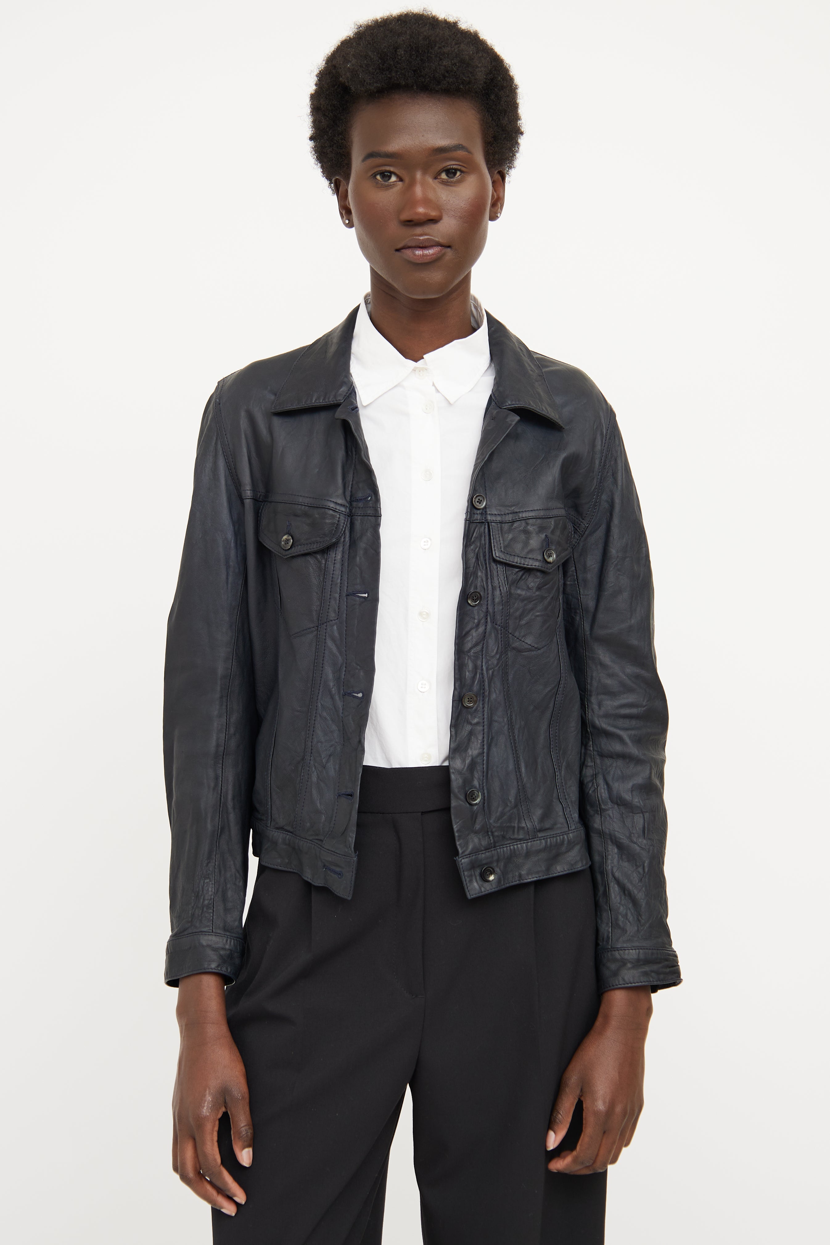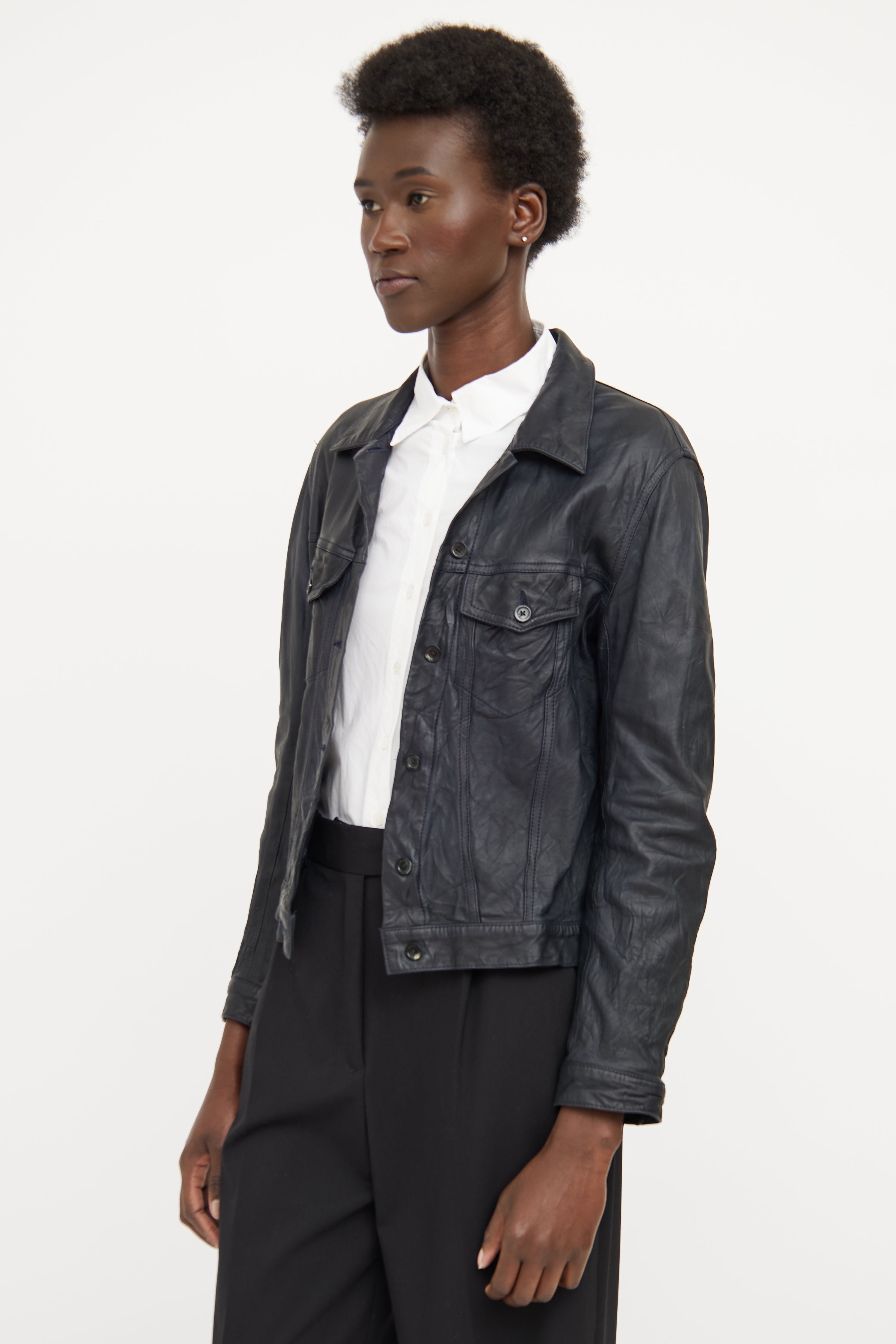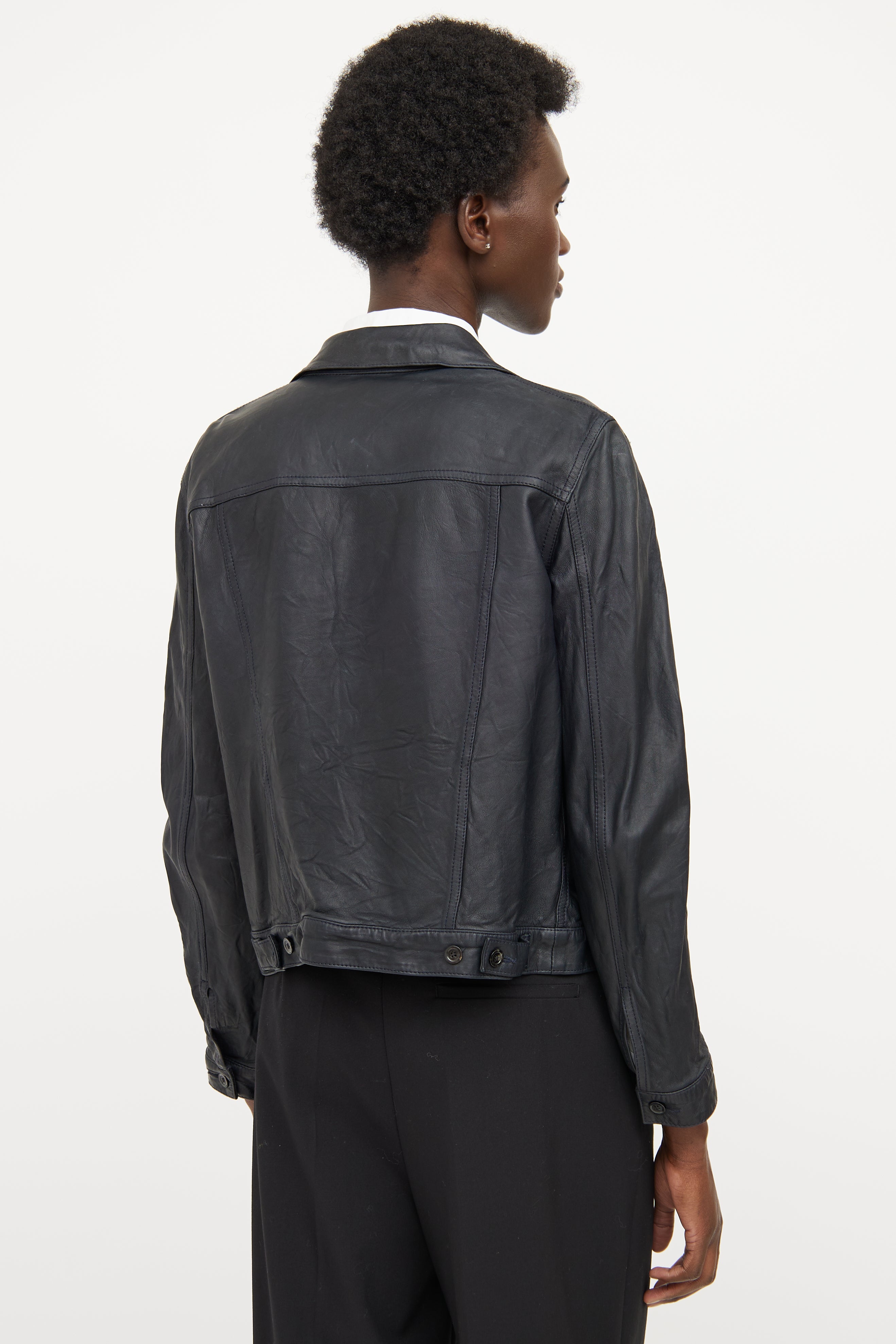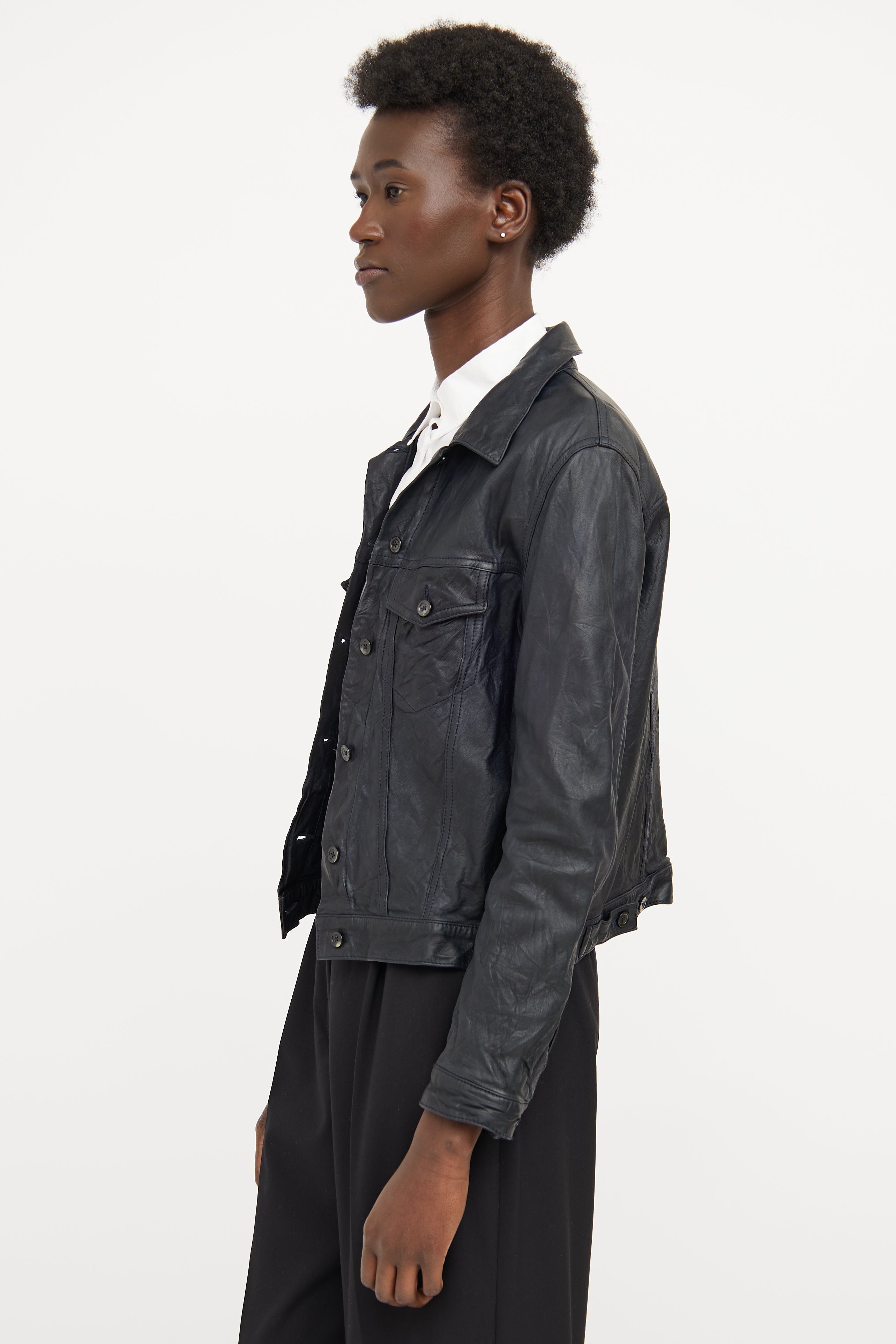 Pre-owned The Row black leather trucker jacket featuring point collar, button detailing on cuffs, button up front, distressed finish, dual flap pockets on chest, paneling and button tab waist adjustment.