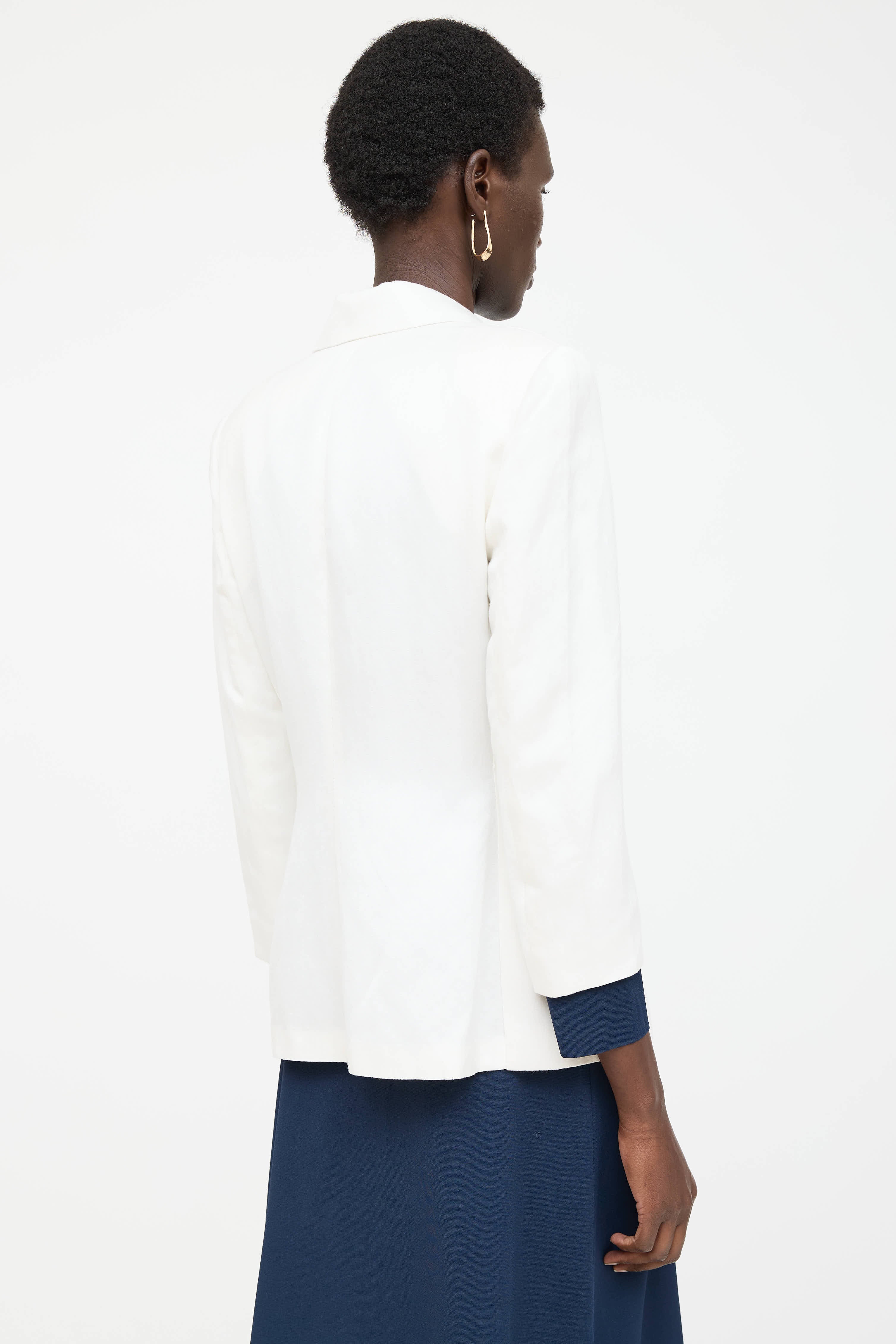 Pre-owned The Row white blazer featuring a notched lapel, long sleeves, one welt pocket at chest, two slip pockets at hip, and gold tone button up closure. Lined.