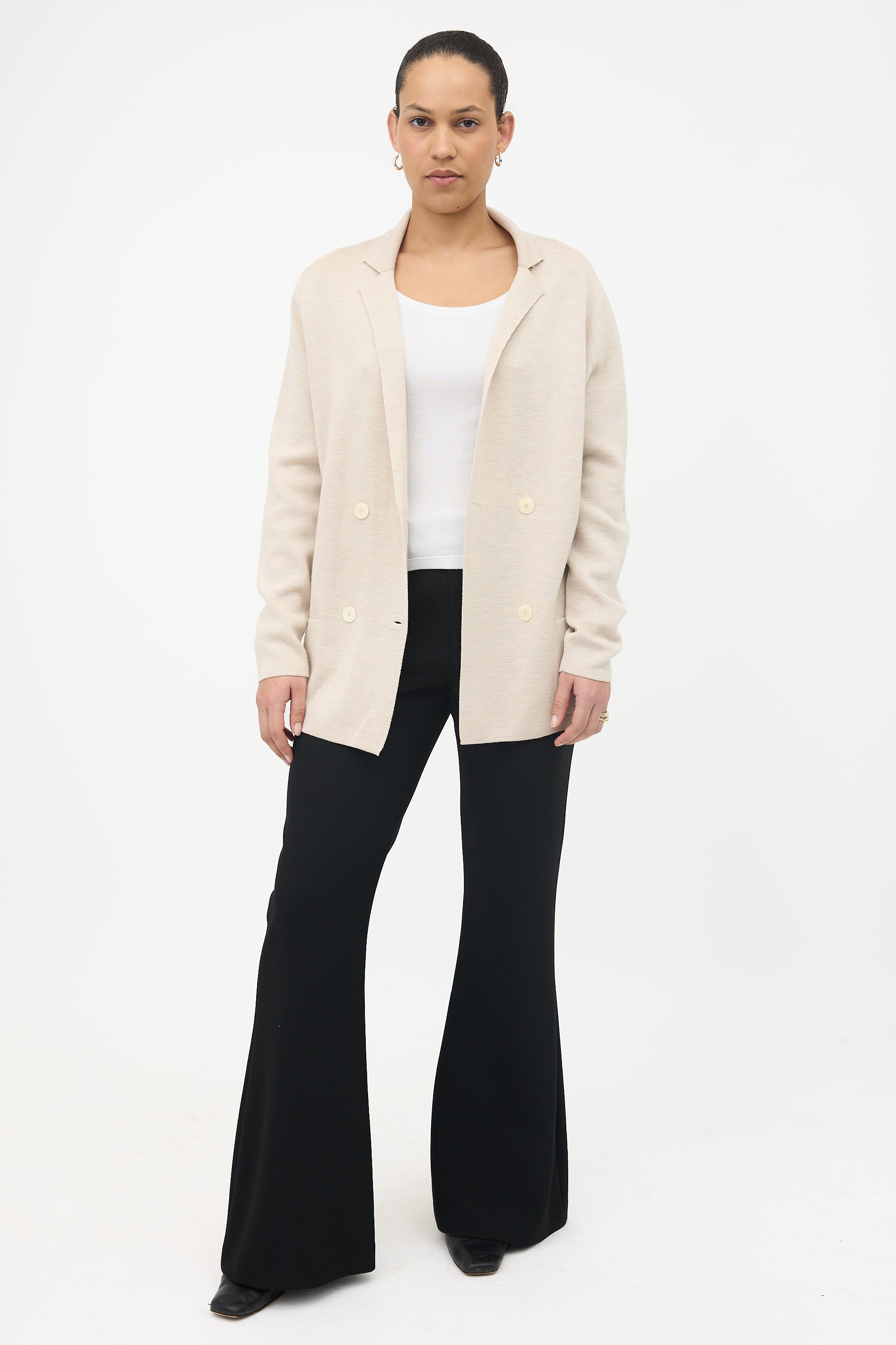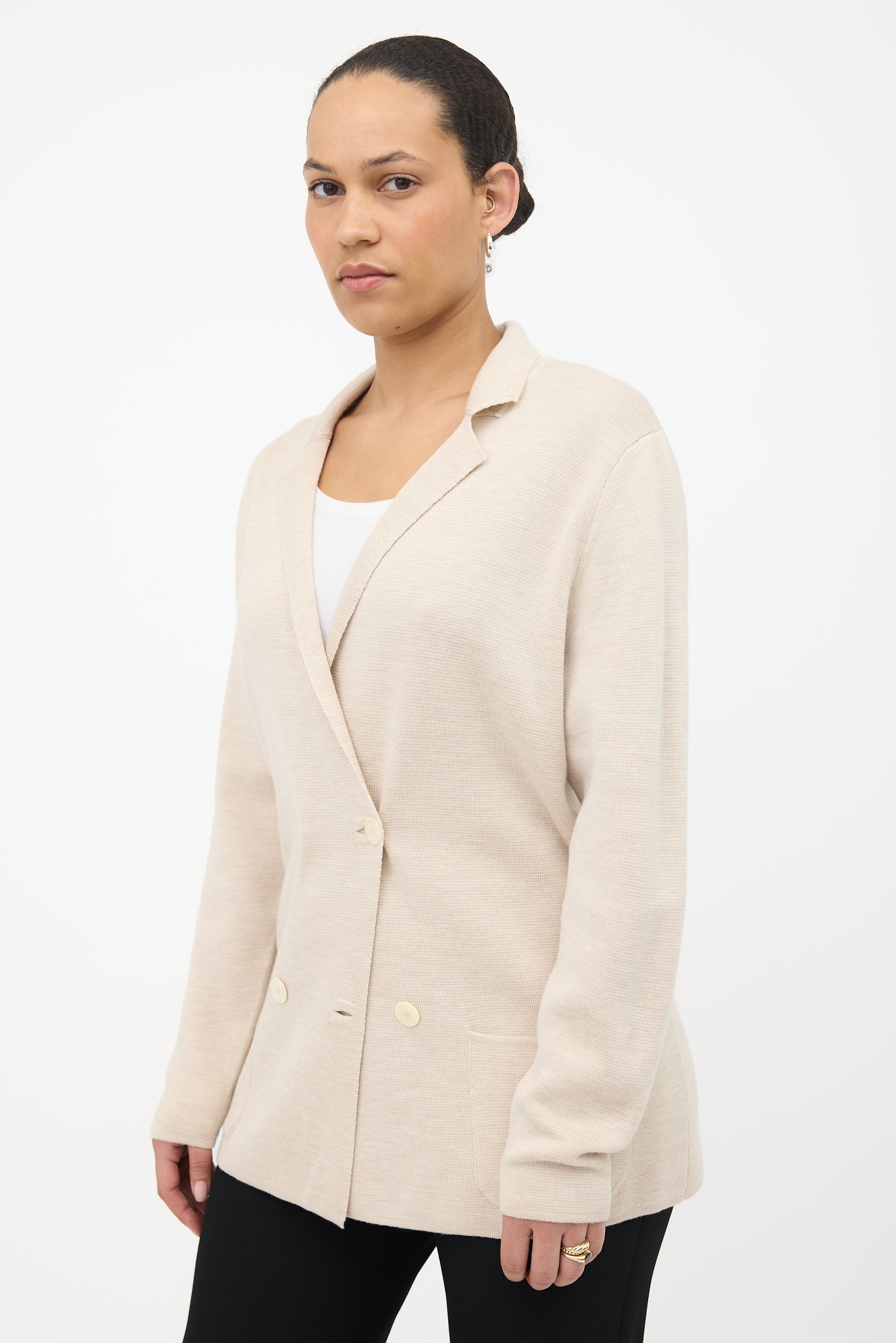 Pre-owned The Row beige merino wool and silk knit Chopok blazer featuring notched lapels, double breasted front, and patch pockets.