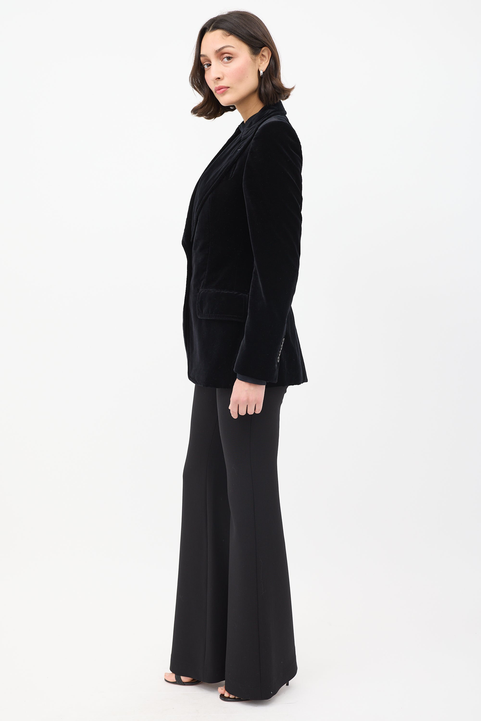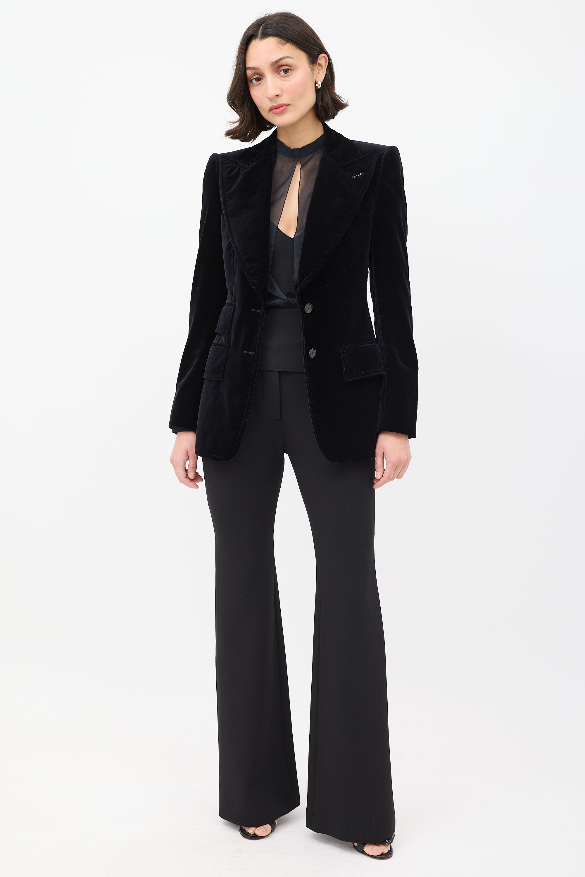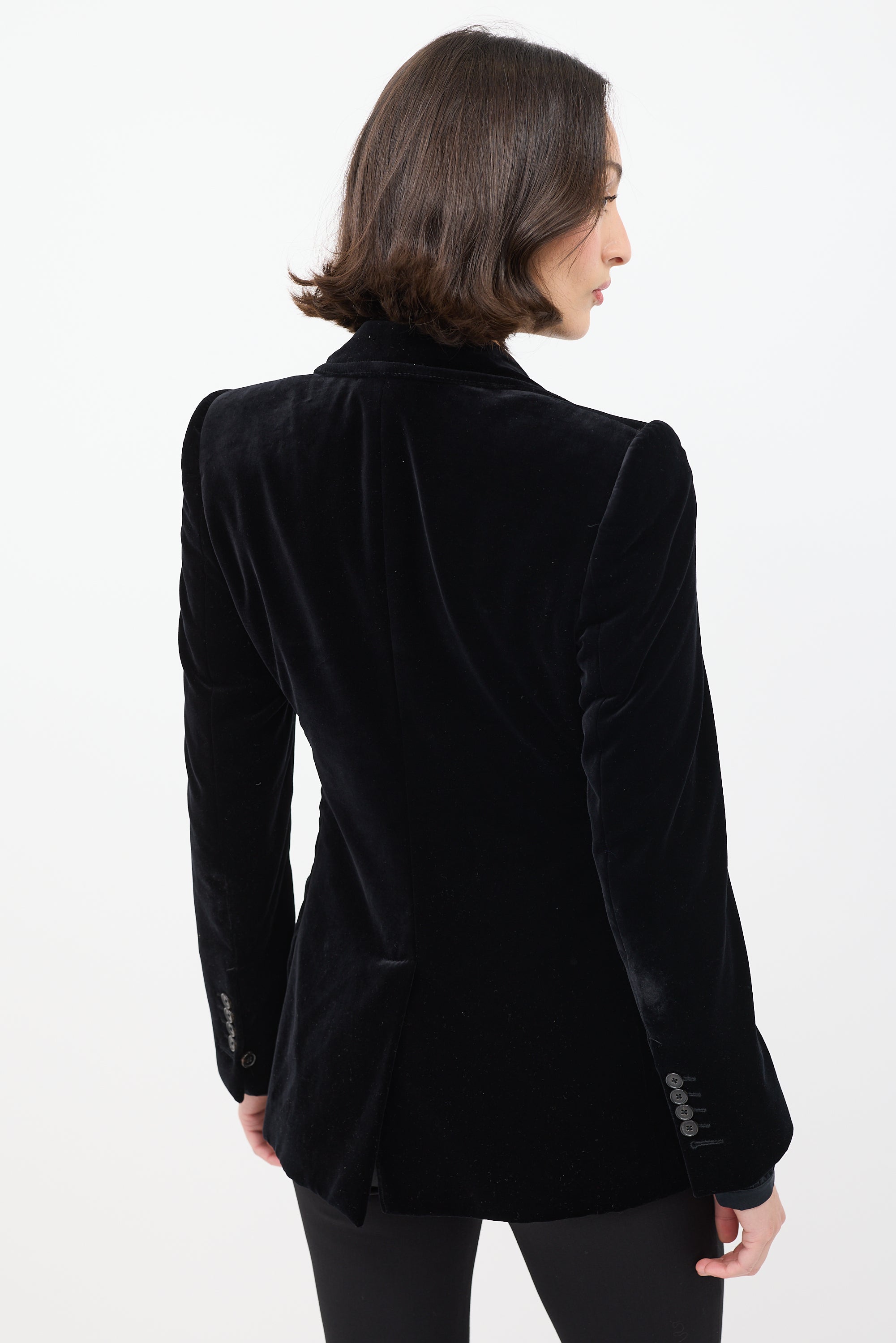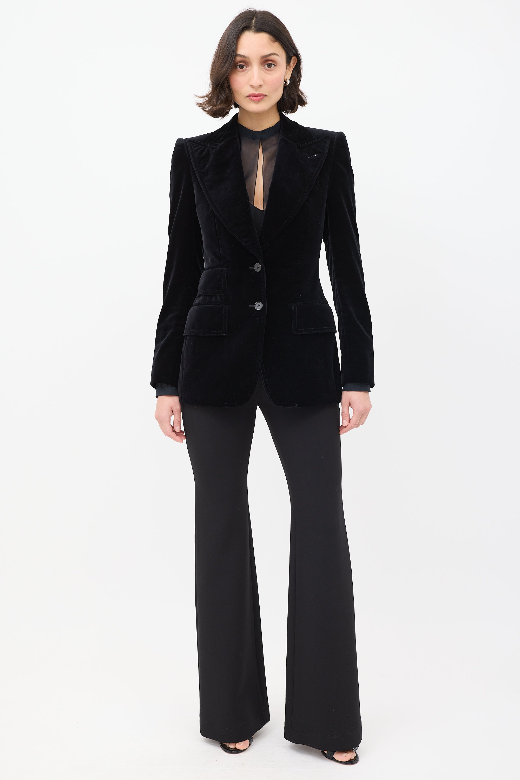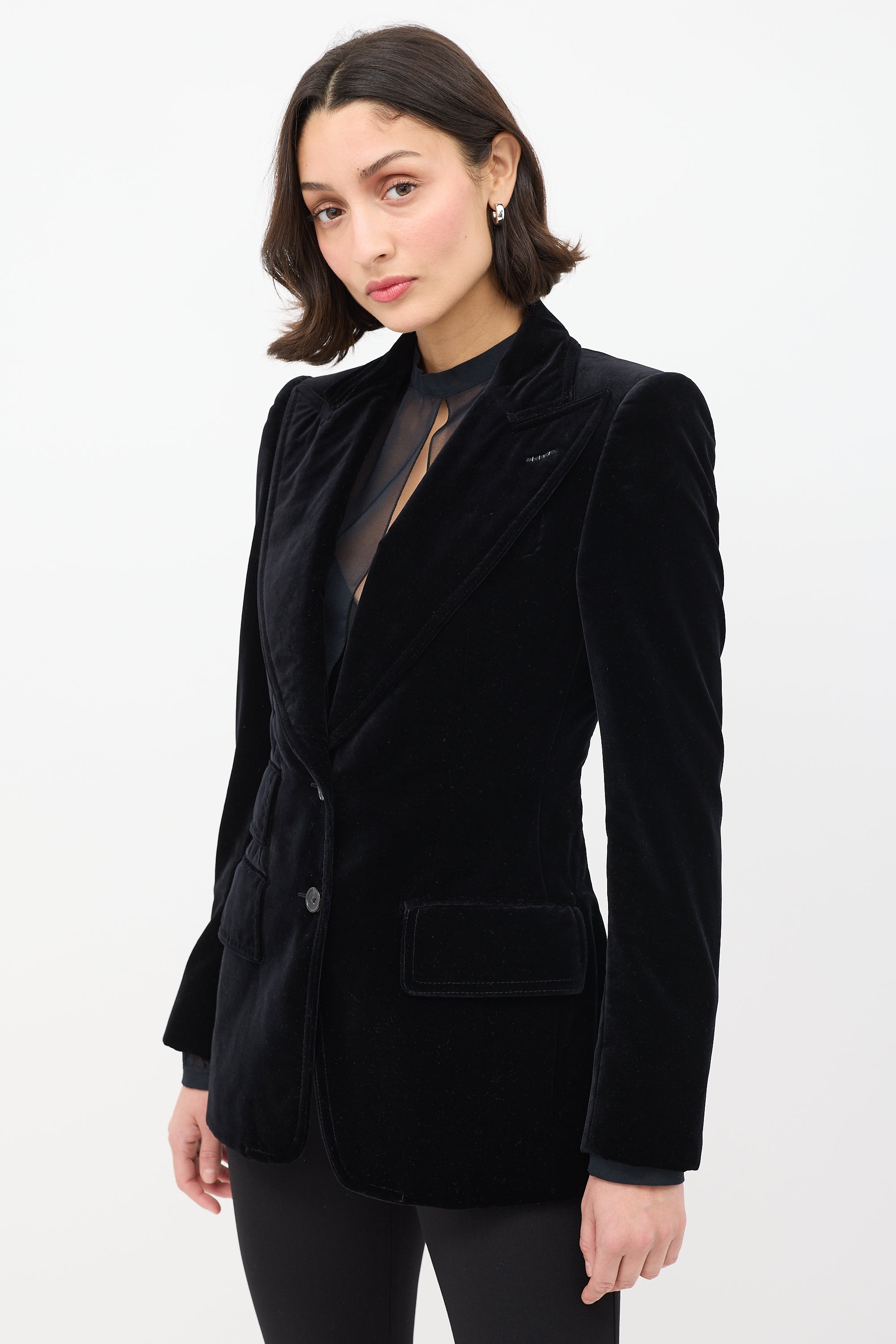 Pre-owned Tom Ford black velvet tuxedo blazer featuring a peak lapel, button up front closure, three flap pockets at front waist, four interior welt pockets, back vent, padded shoulders, and long sleeves with buttoned cuffs. Lined.