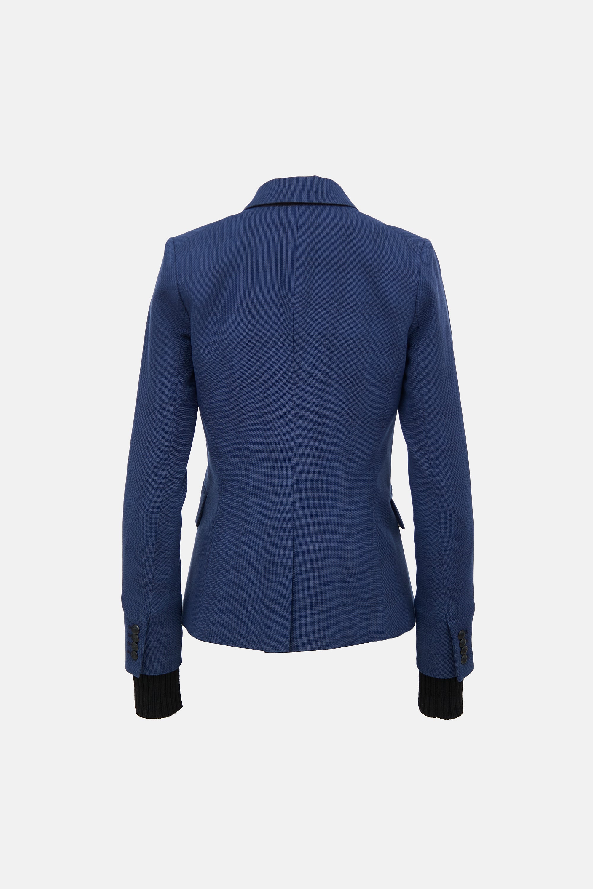 Pre-owned Veronica Beard blue wool blend blazer featuring a tonal check pattern, peak lapels, single hook and eye front closure, decorative double breasted buttons, double welt pockets, detachable black rib knit cuffs, and back vent. Lined.