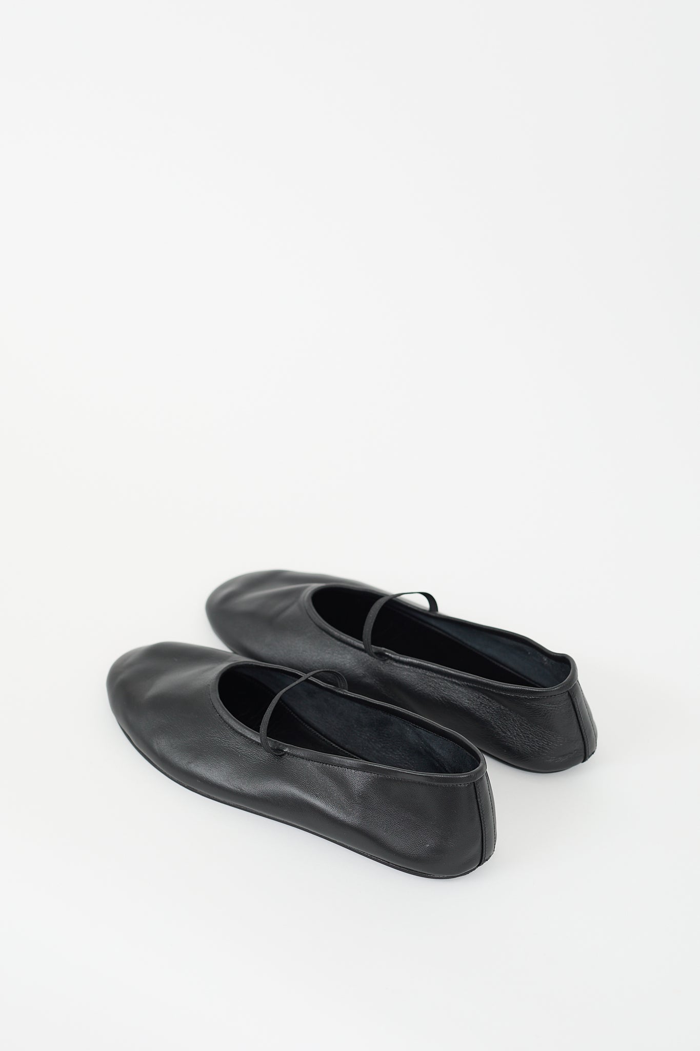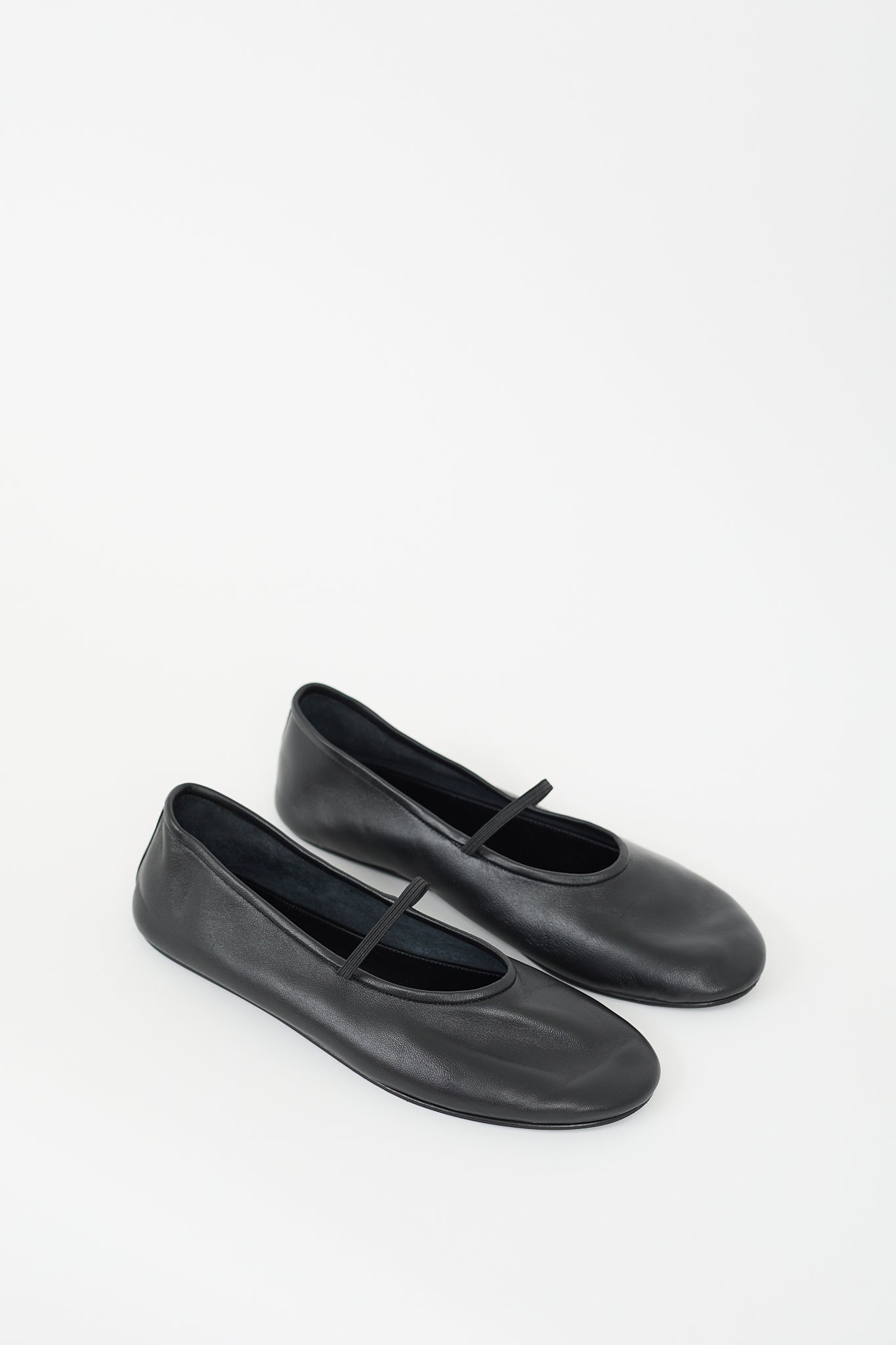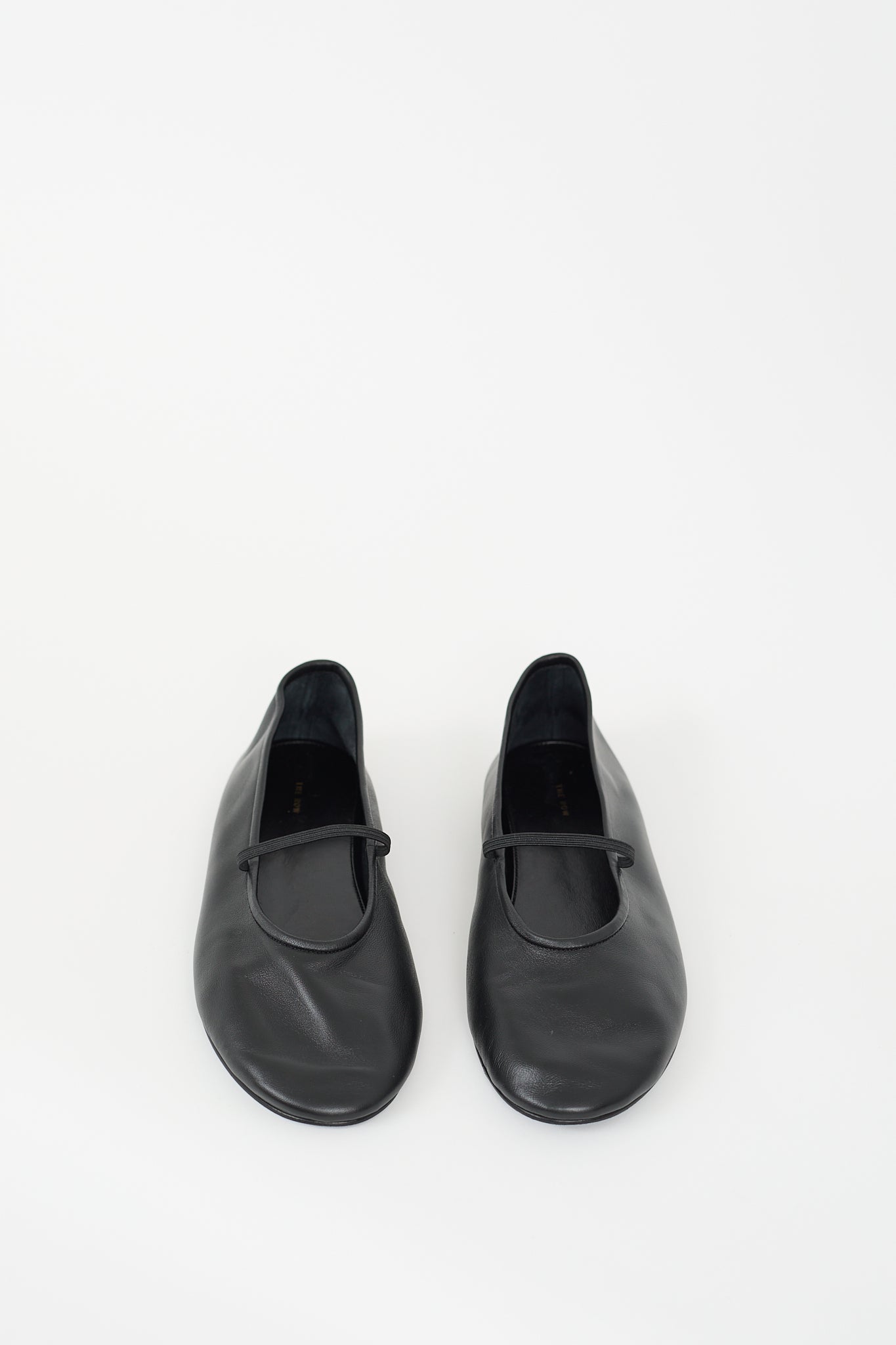 Pre-owned The Row black Boheme Mary Jane ballet flats featuring a rounded toe, soft leather upper, single thin elastic strap across instep, and leather insole and outsole.